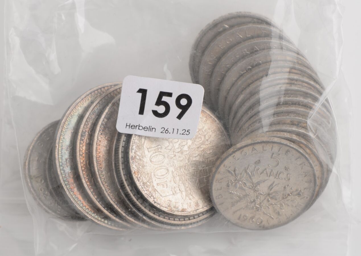 Lot of silver coins comprising: three 50-franc Hercules coins, one 10-franc Hercules coin, one 20-franc pendant coin, one 100-franc Pantheon coin, sixteen 5-franc coins and one 2-franc 1928 Swiss coin.
