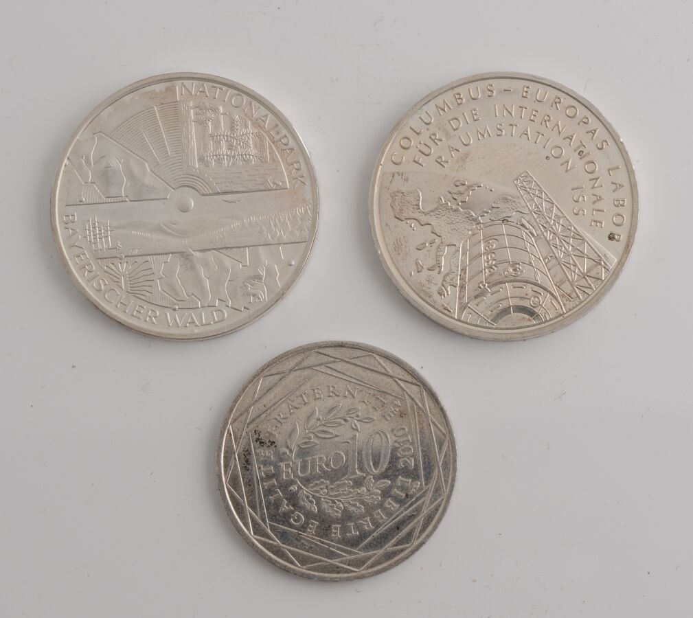 Two German ten-euro coins (2004 and 2005) and one French ten-euro coin (2010) in silver.