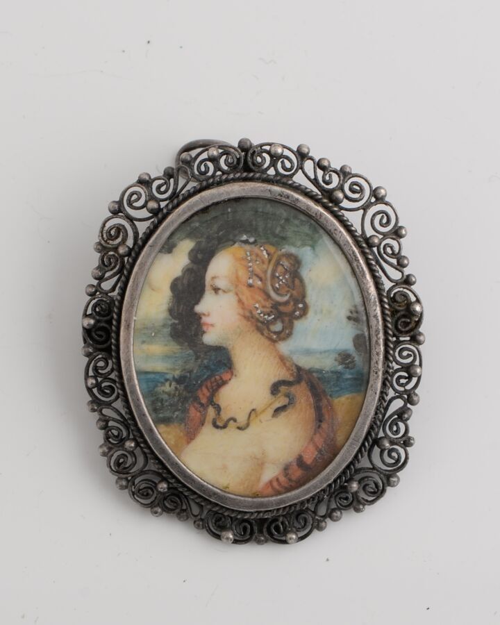 A pendant brooch in filigree silver set with a miniature of Simonetta Vespucci after Piero di Cosimo.