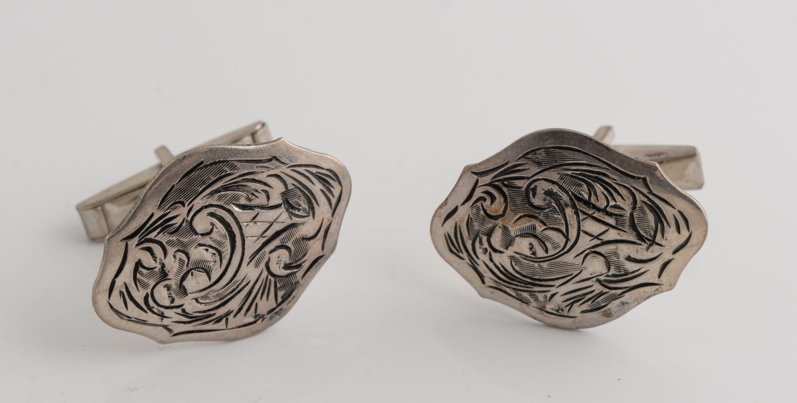 Pair of silver cufflinks with stylized motifs, in the form of a movement