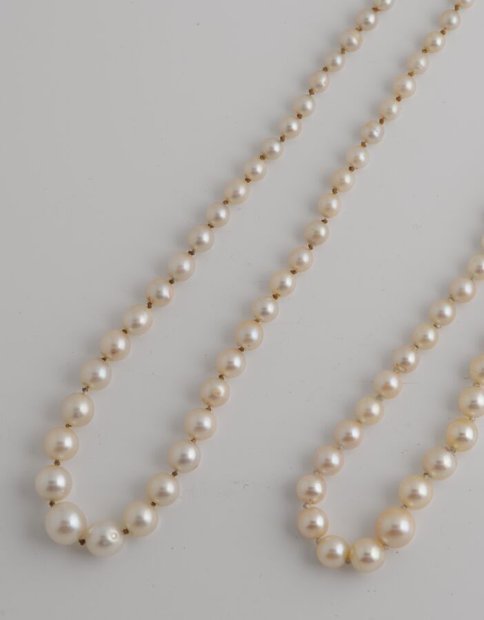 Set of two cultured pearl necklaces. The central pearls are approximately 7.8 mm and 7.4 mm in diameter. The clasps are silver.