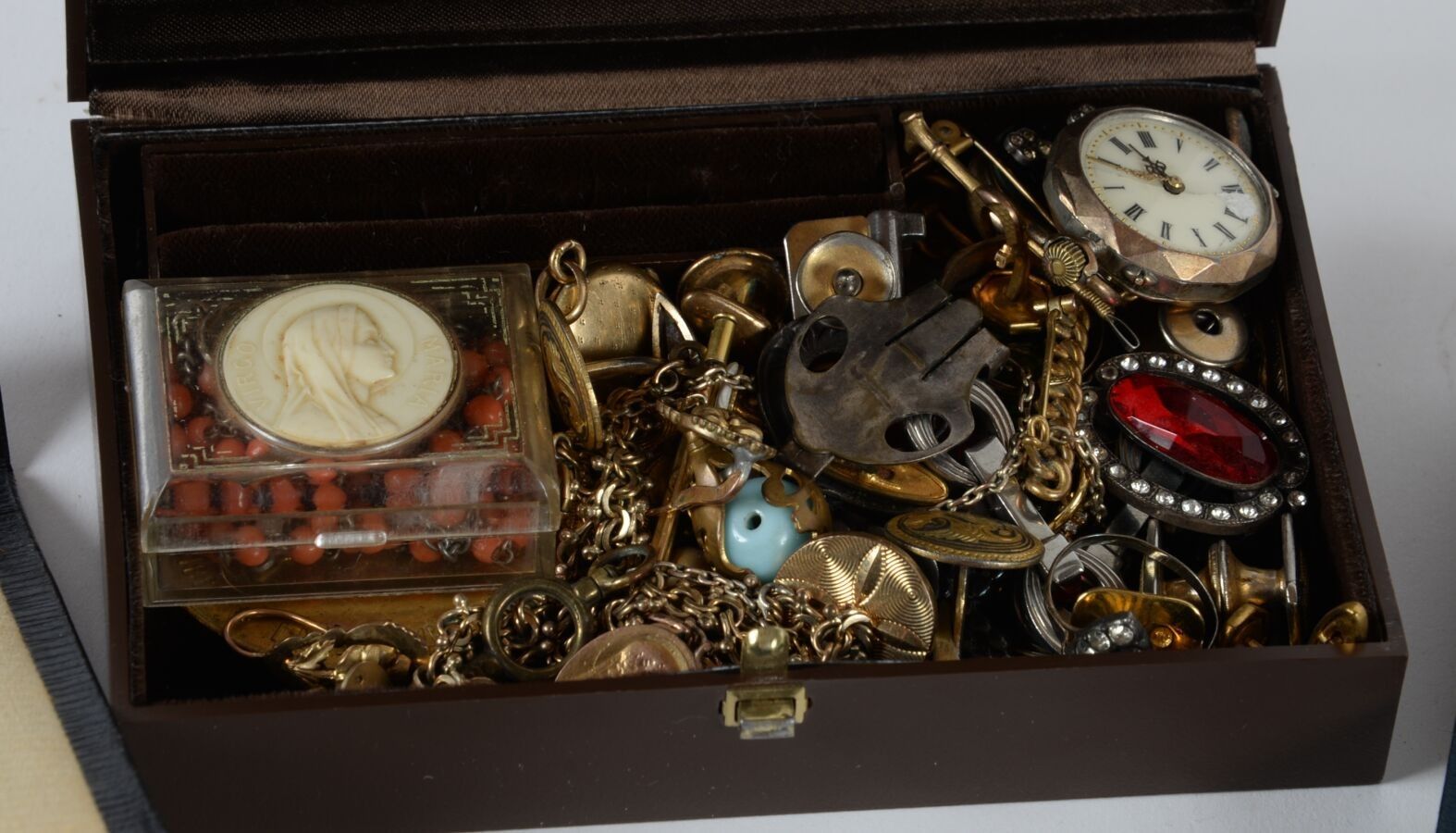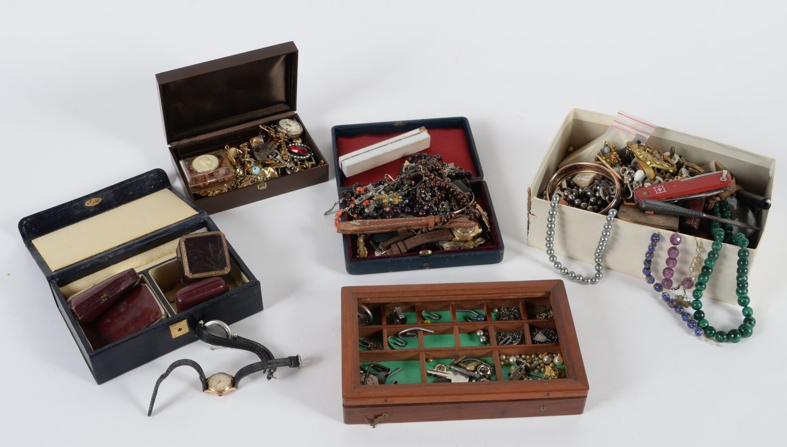 Lot of costume jewellery including a malachite necklace, rosaries, medallions, chains, etc.