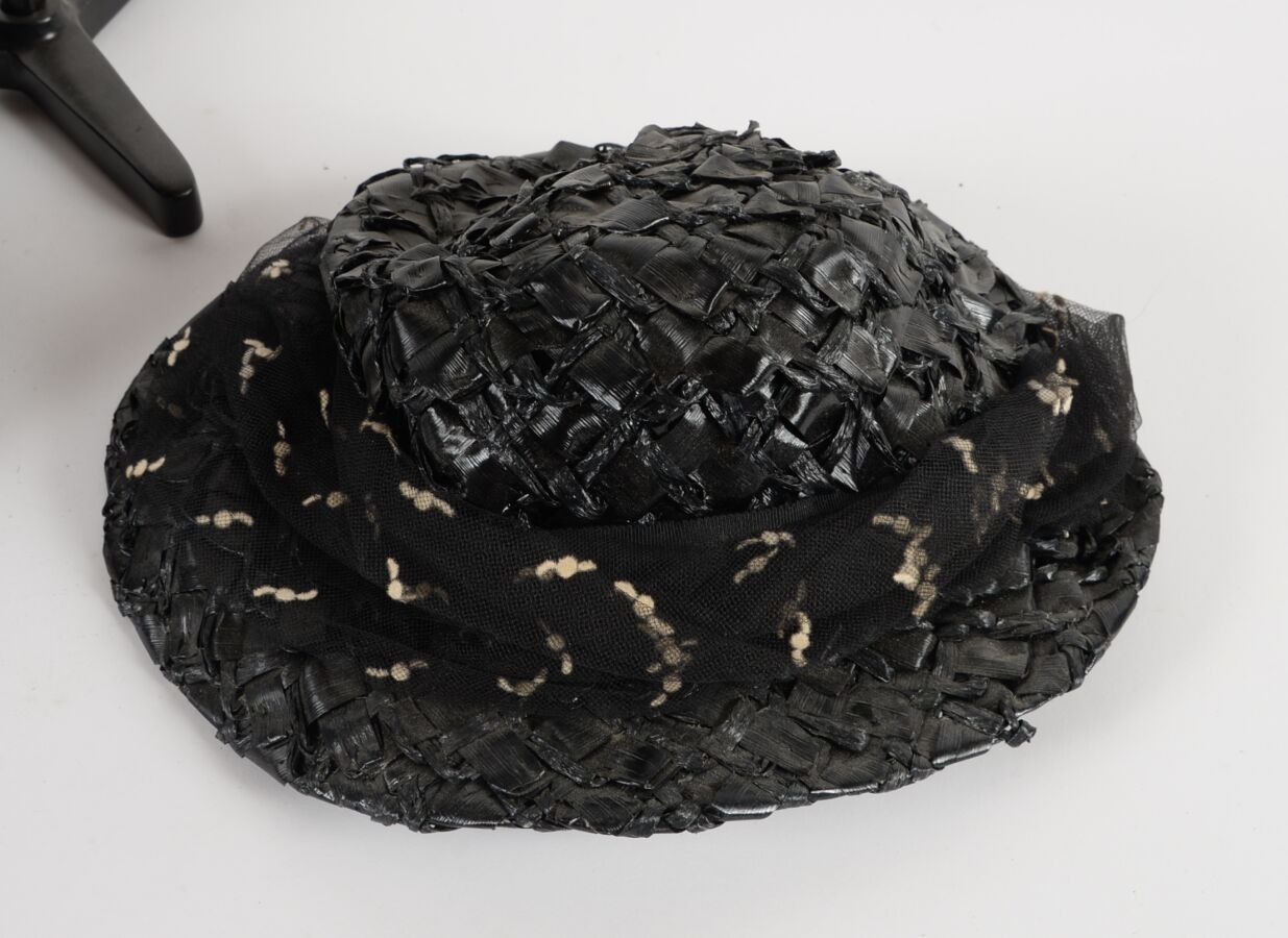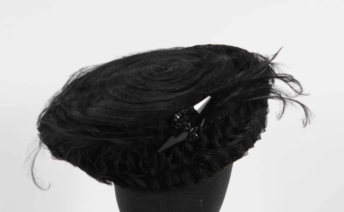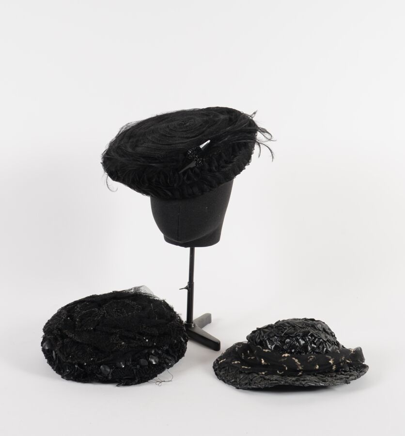 Set of three women's hats, one in black straw and tulle, the other two in black fabric embellished with tulle, sequins or feathers.