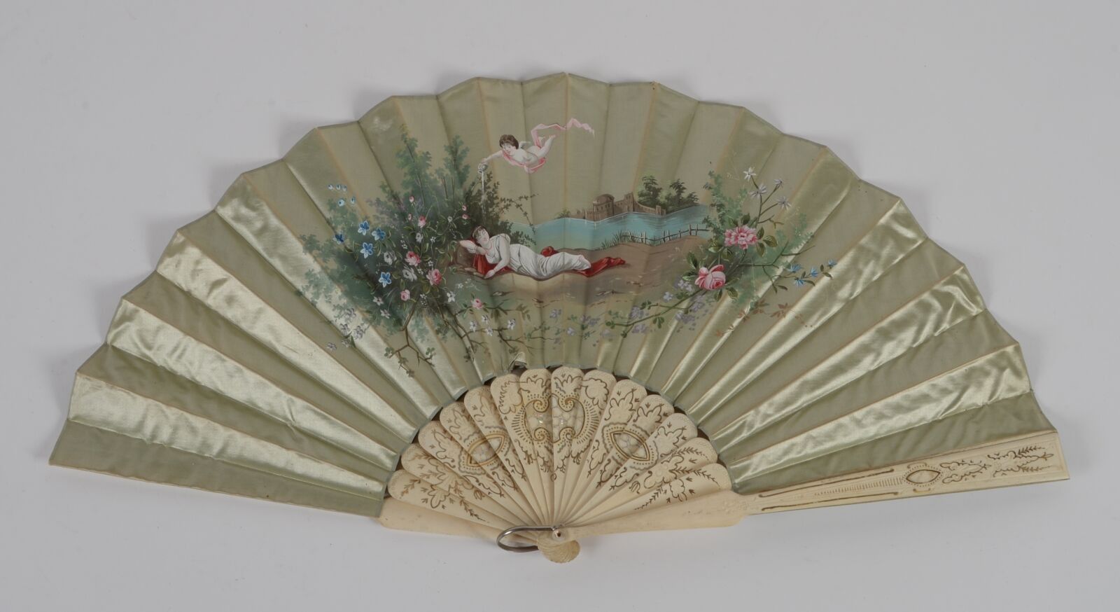 Sixteen-strand fan in engraved openwork bone, partially lacquered in gold and decorated with mother-of-pearl pastilles. The water green satin leaf is painted with a young woman asleep and drenched by a lover.