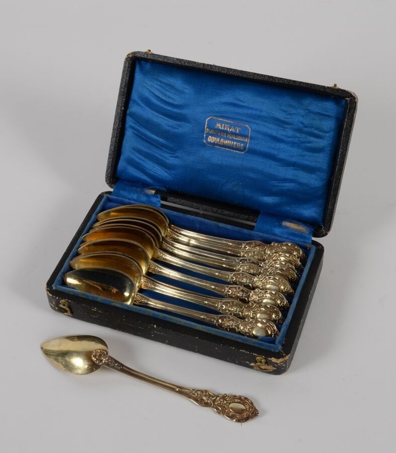 Box of twelve small spoons in vermeil, the handles with neo-Renaissance decoration of leather cut-outs and a small devil.