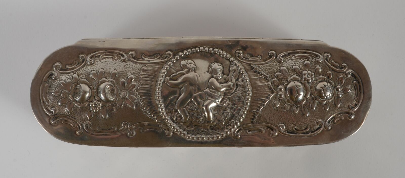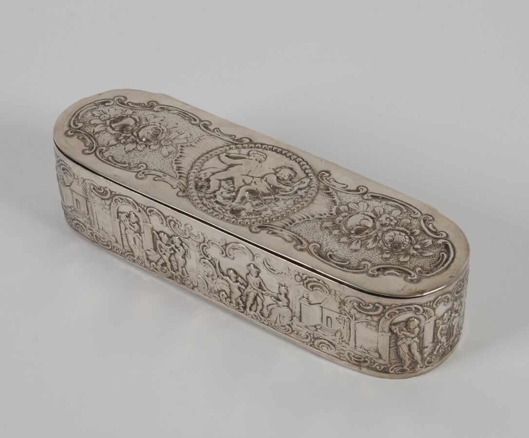 Oblong silver box, the body decorated with a frieze depicting couples, lovers and musicians in an architectural setting, the lid centred on a medallion depicting two musician lovers between roses in ribs.