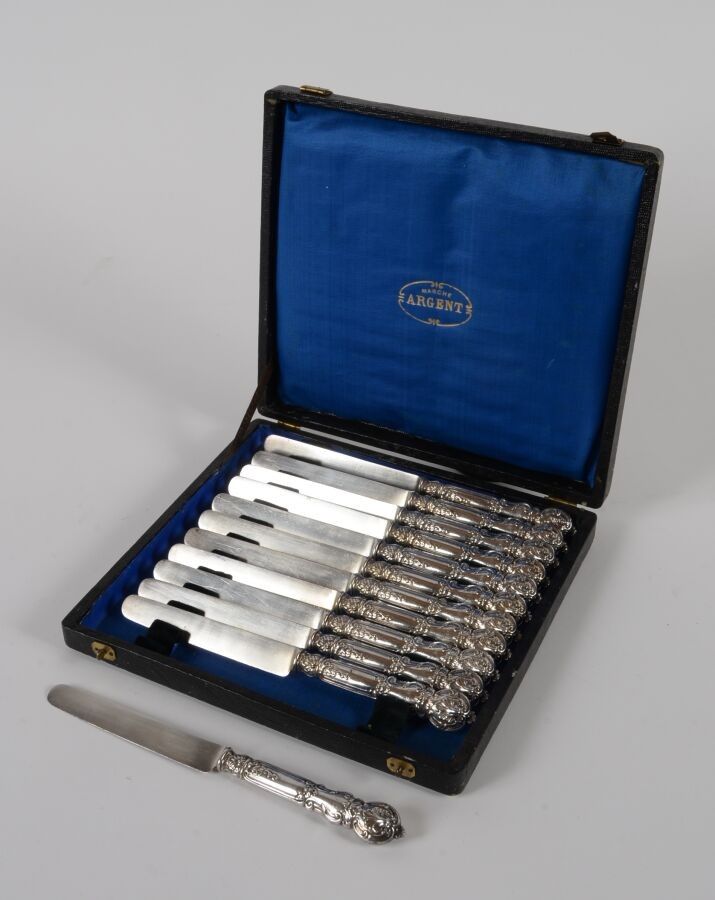 Set of twelve fruit knives with forged silver handles and steel blades, the handles monogrammed with rocailles decoration.
