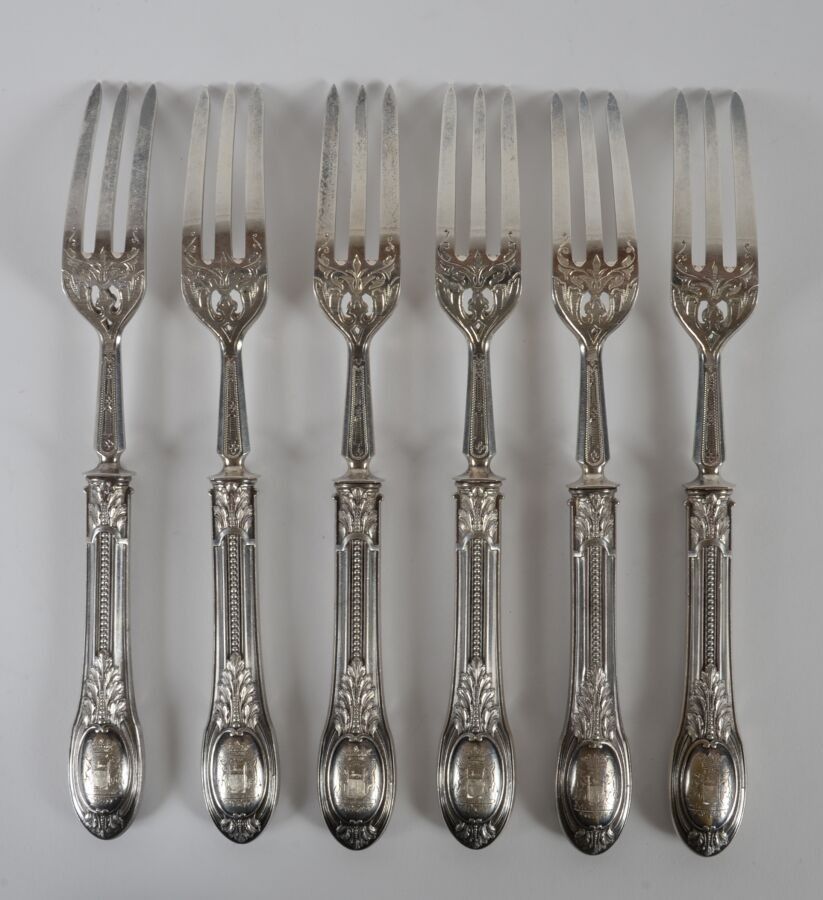 Six silver forks with forged silver handles. Decorated in the Louis XVI style with ovals, foliage and strings of pearls. The spatulas bear the arms of the Biliotti family under a marquis's crown and the motto "Pensate al fine".