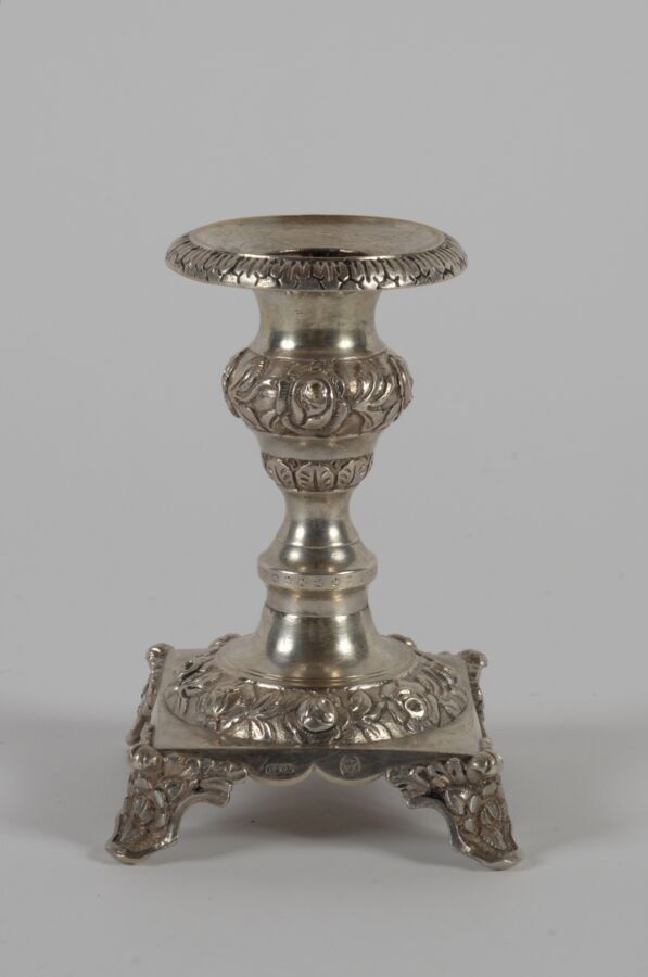 A small silver candlestick, standing on four legs supporting a cut-out belt. Decorated with garlands of roses.