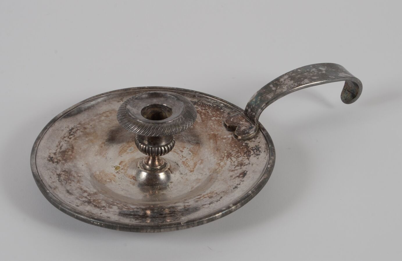 A plain silver-plated hand candlestick with a gadrooned lip …