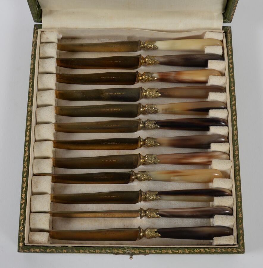 Set comprising a fish cutlery set with a forged silver handle and a case of twelve horn-handled fruit knives with gilded blades marked "Châtellerault".