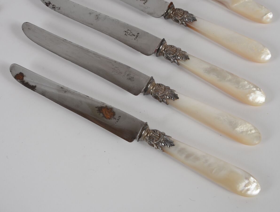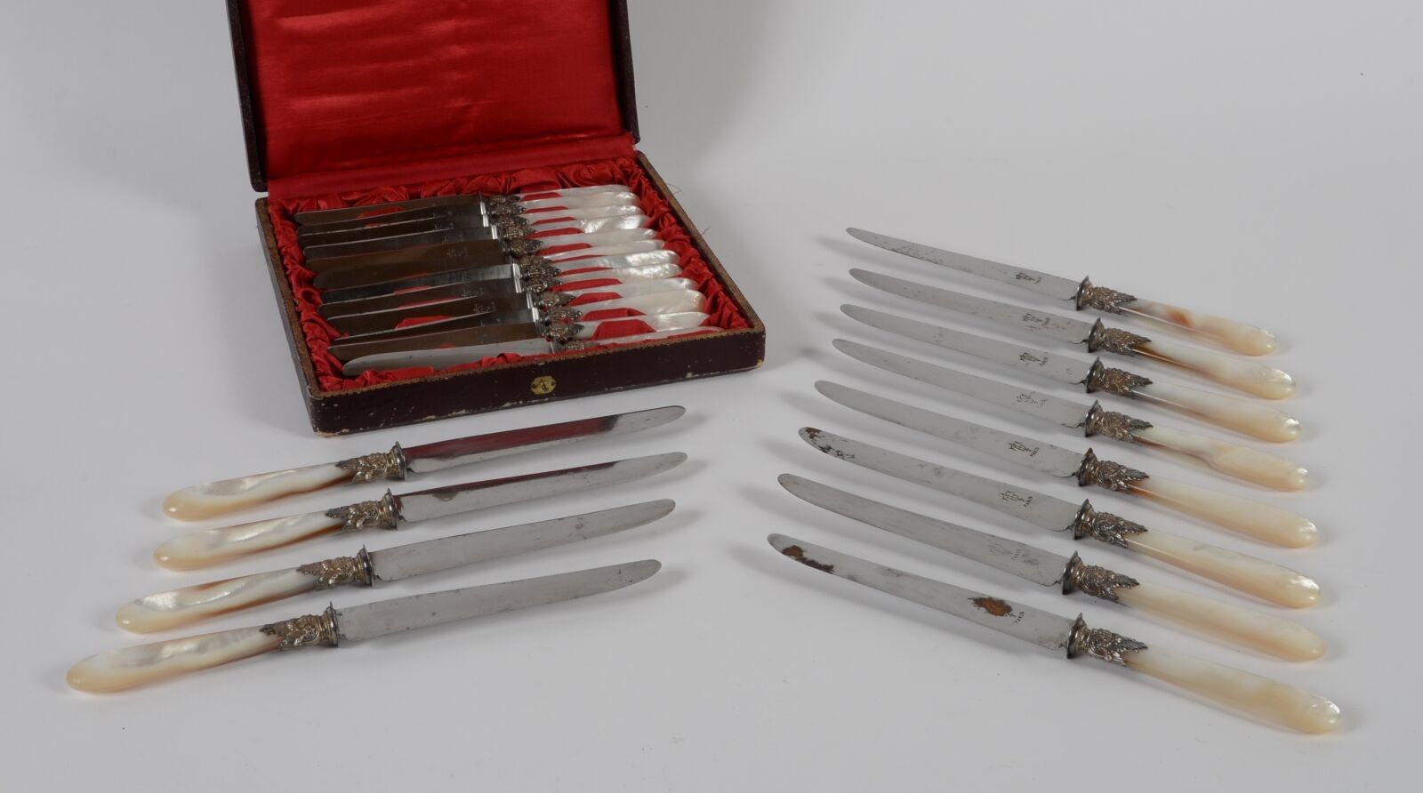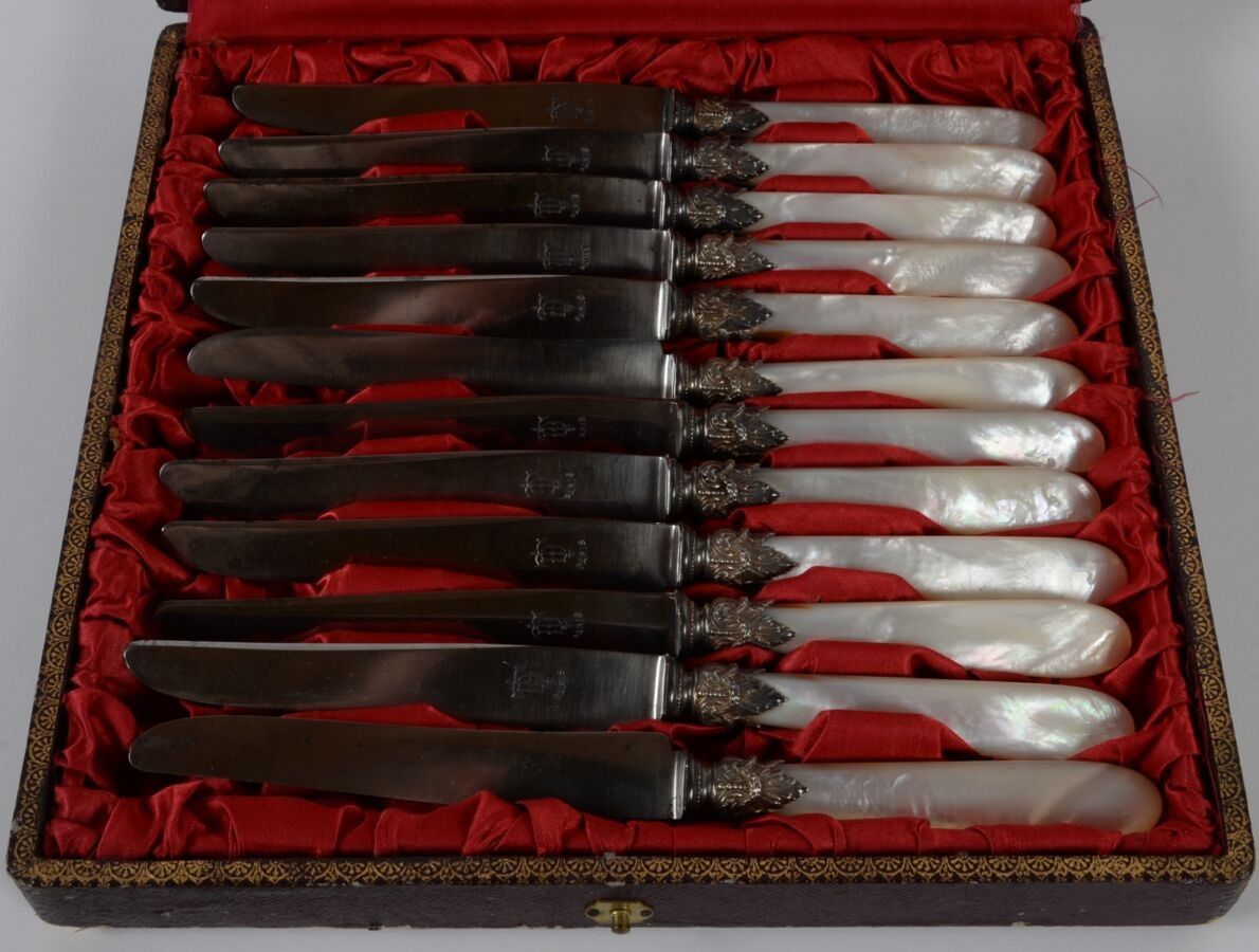 Set of twelve large knives and twelve small knives with mother-of-pearl handles and steel blades.