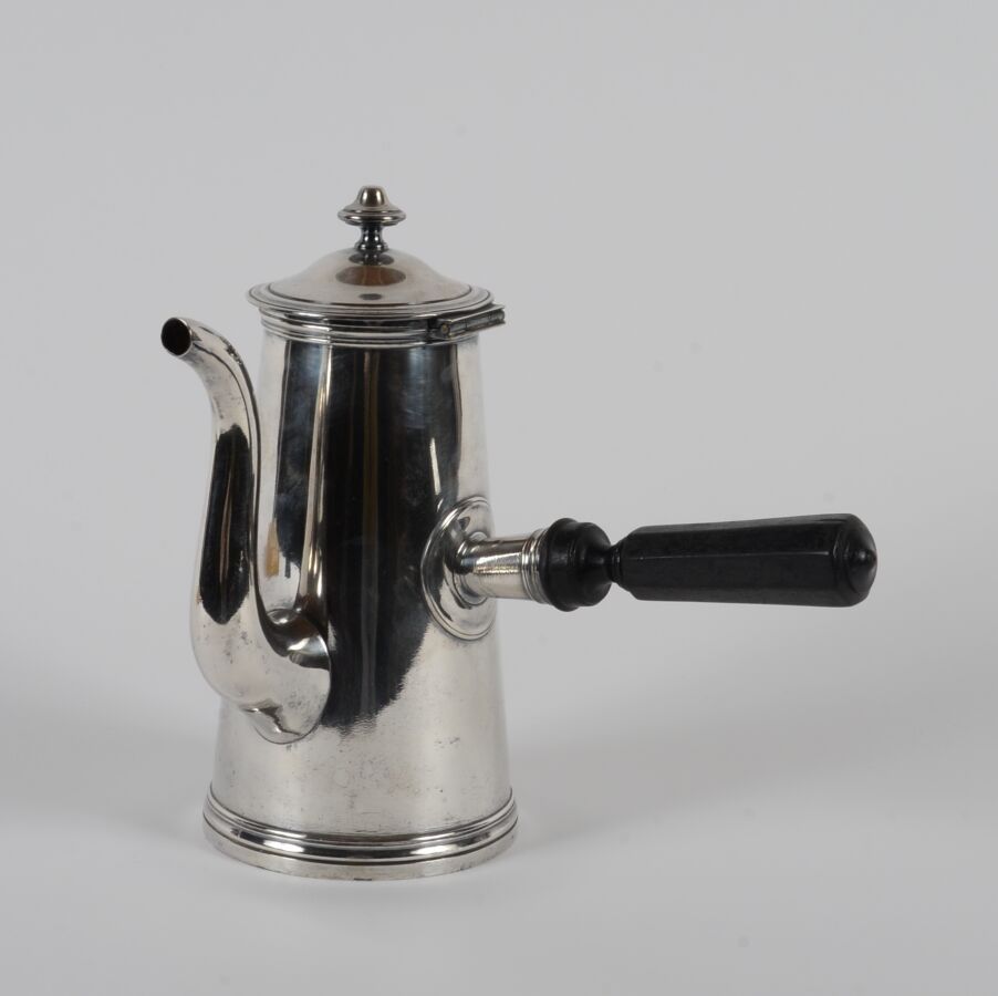 Silver-plated metal coffee pot with moulded decoration. Turned ebony handle.