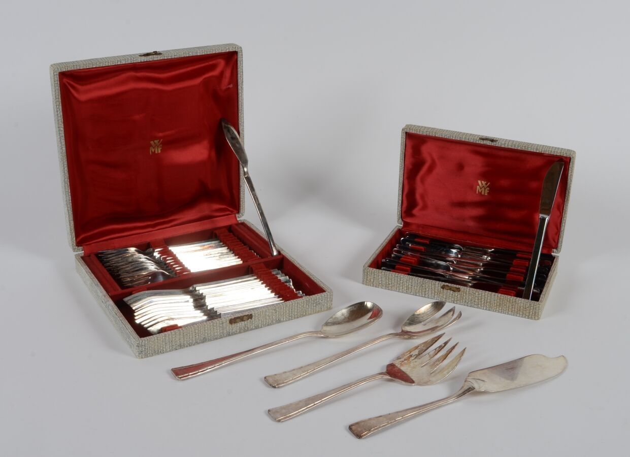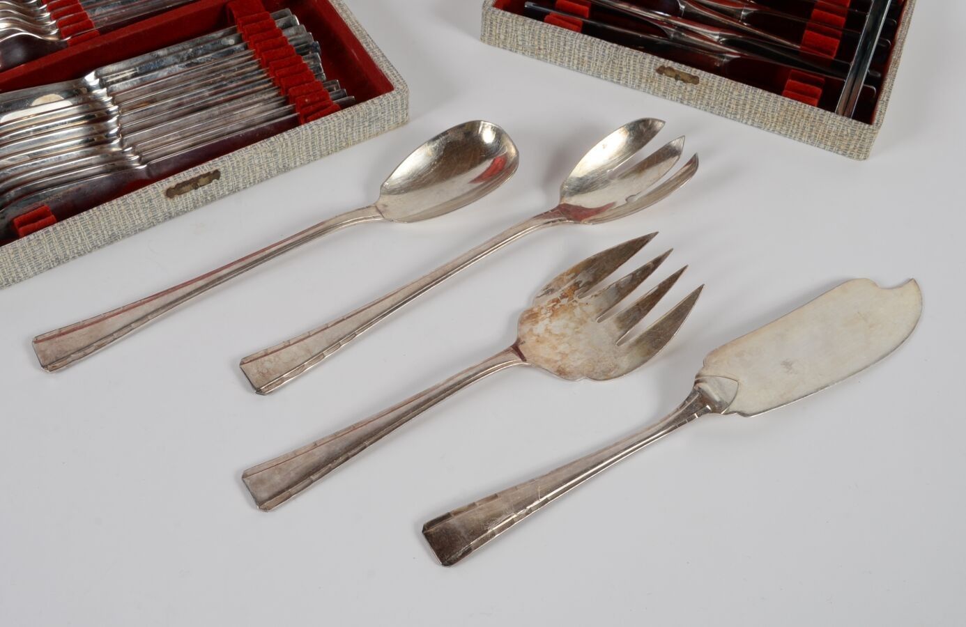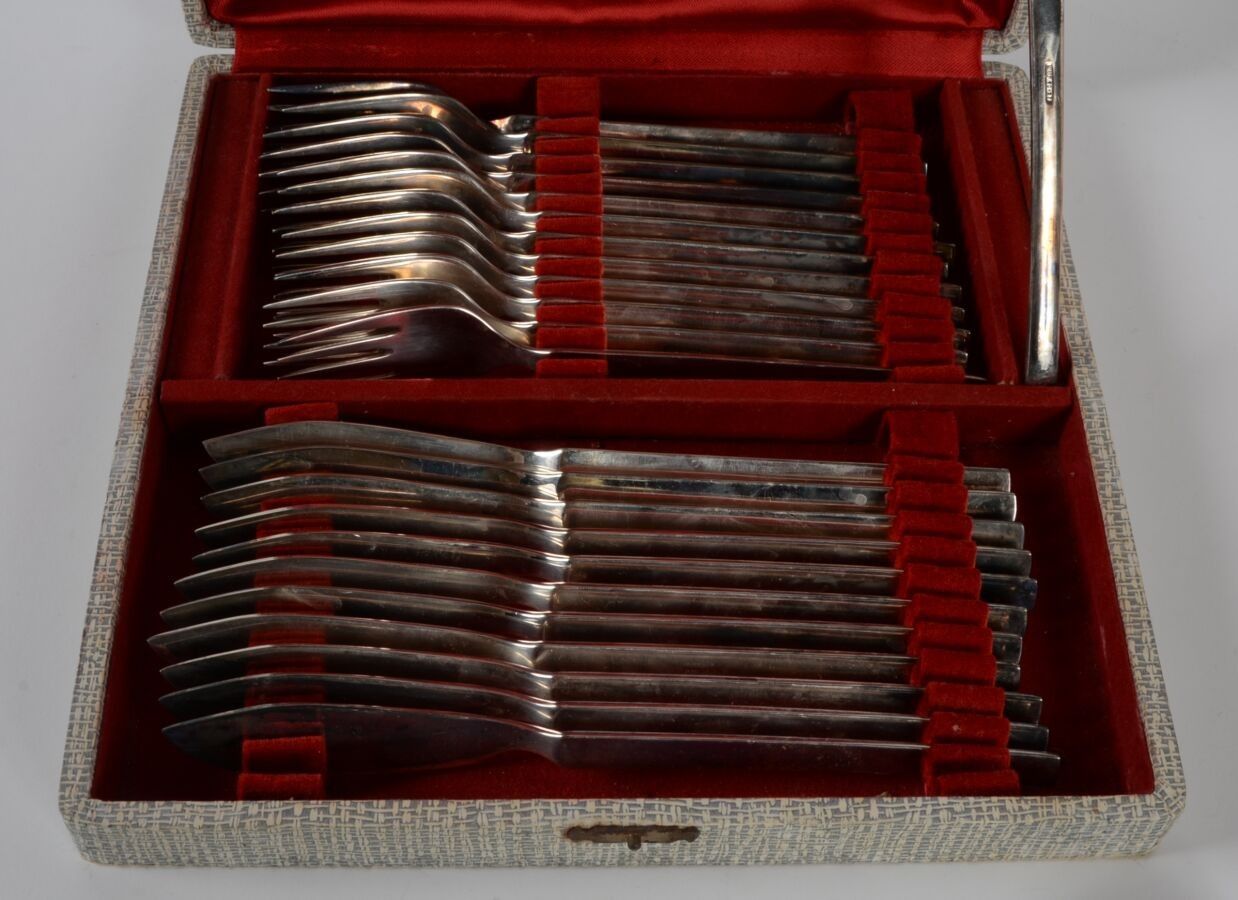 A set of mismatched silver plated knives including a case of twelve knives, a case of twelve pieces of cutlery (twelve forks and twelve knives) for fish, a salad service and a fish service.