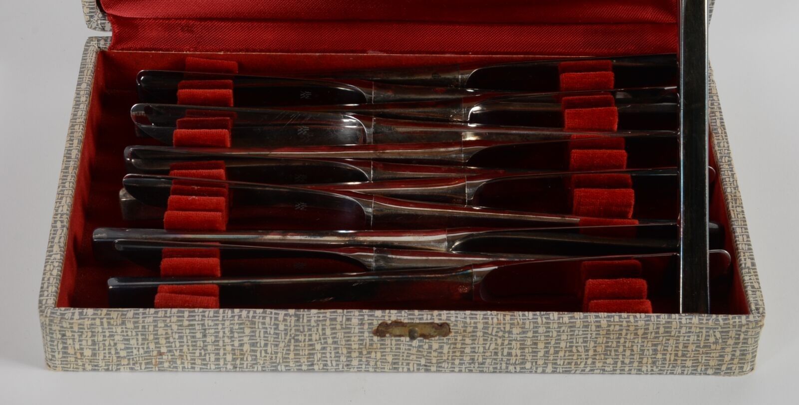 A set of mismatched silver plated knives including a case of…