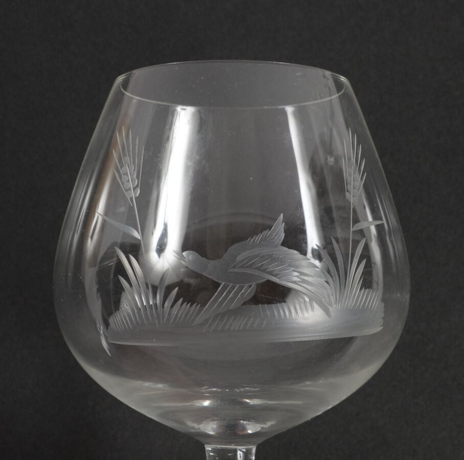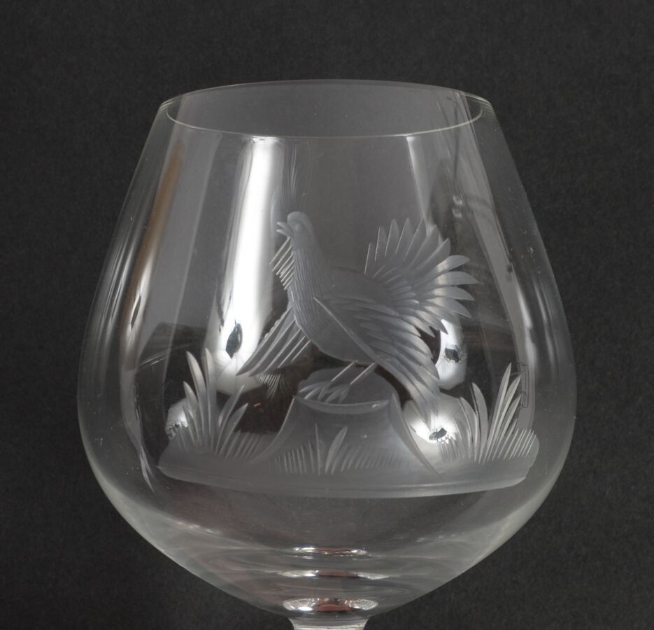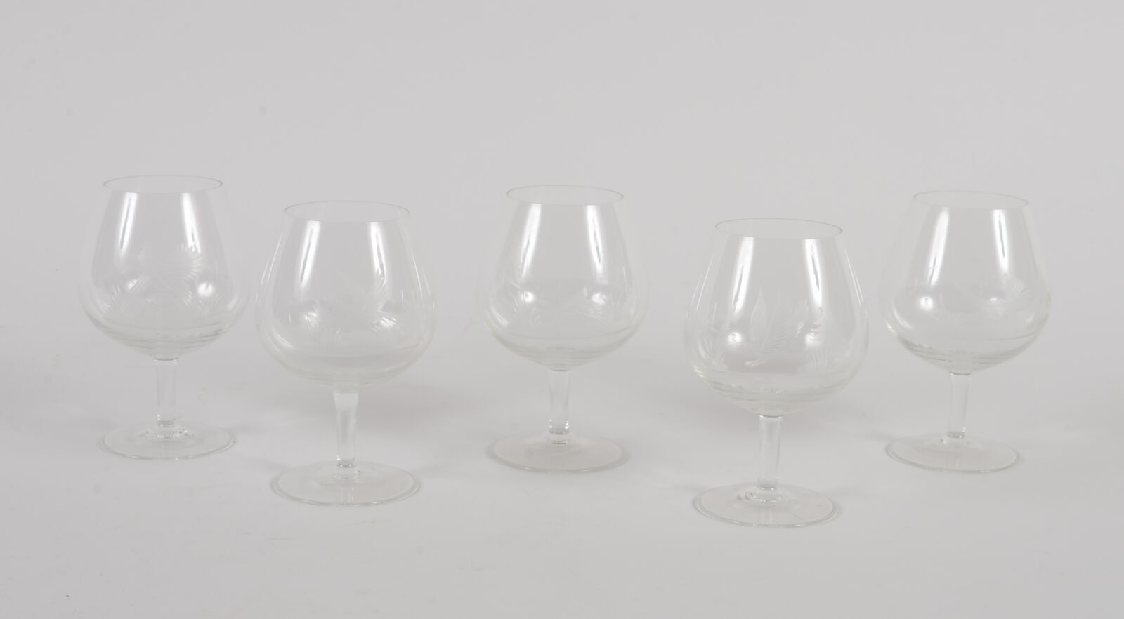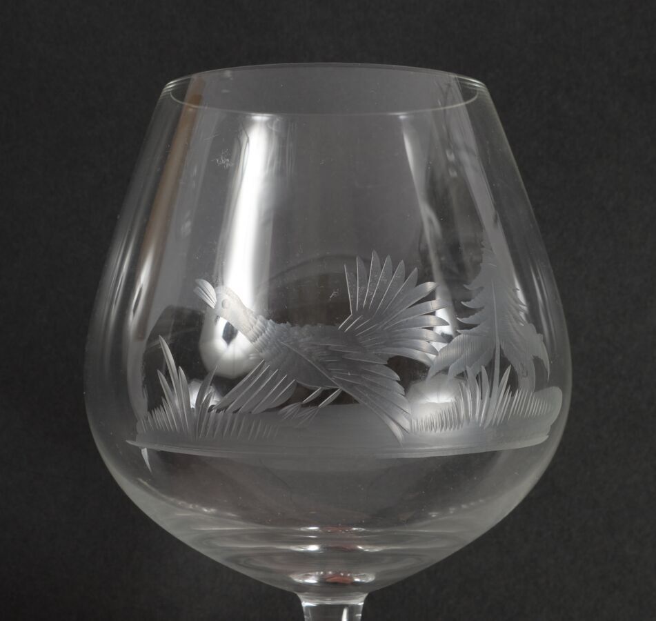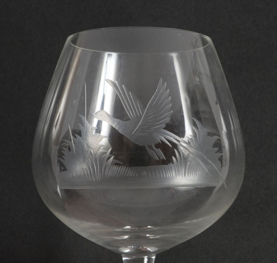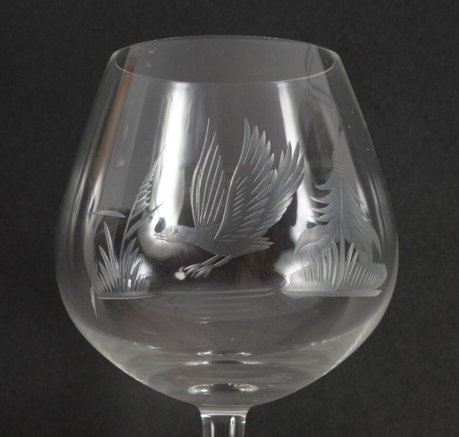 Five colourless crystal cognac glasses with engraved hunting decoration.