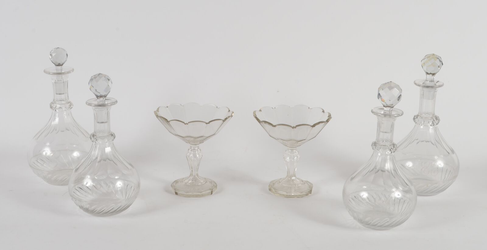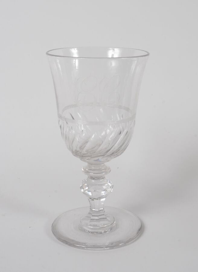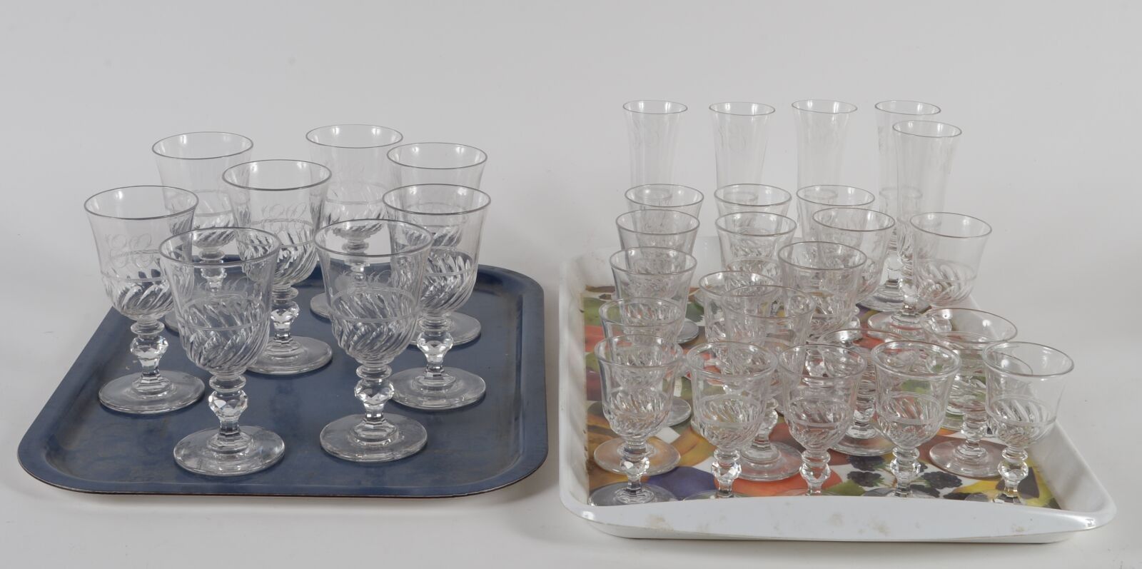 Part of a set of twisted colourless crystal glasses, partially engraved, comprising four decanters, five flutes, eight water glasses, eleven wine glasses, six liqueur glasses and three goblets.