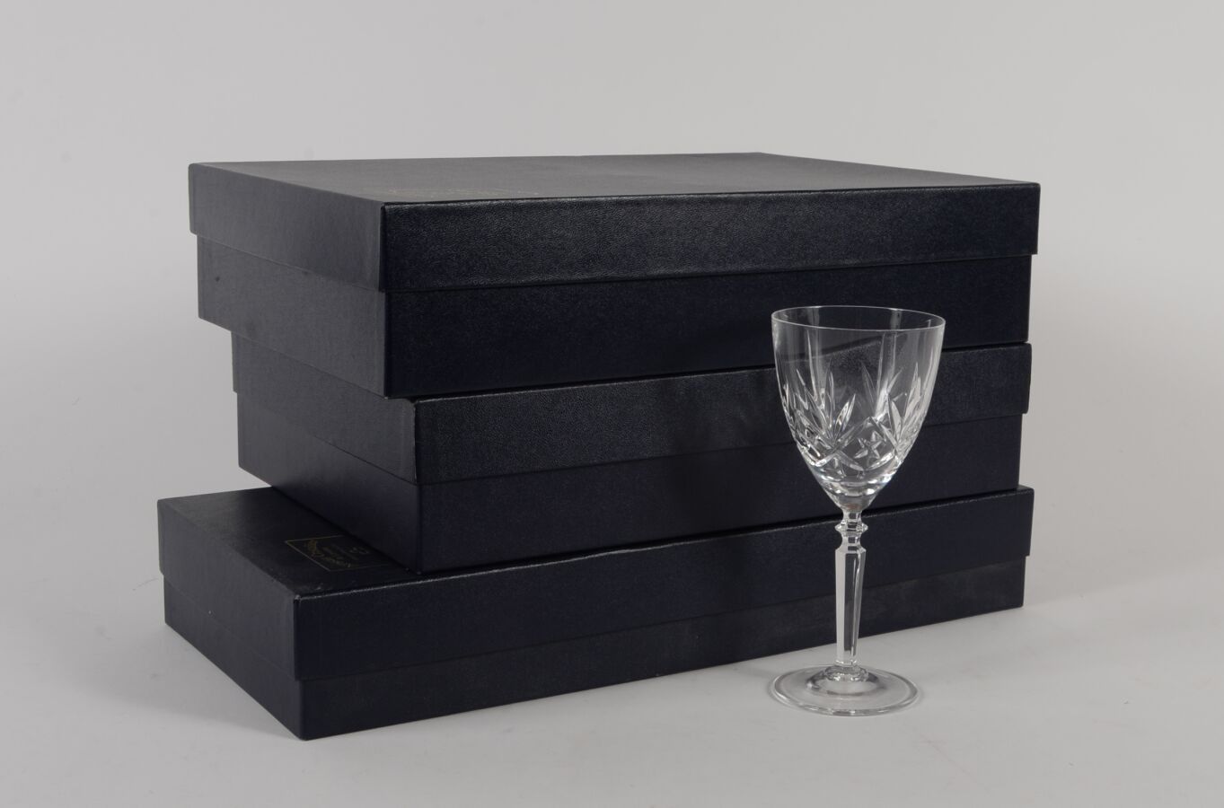 A set of stemmed glasses in cut colourless crystal, comprising six flutes, six water glasses and six wine glasses.