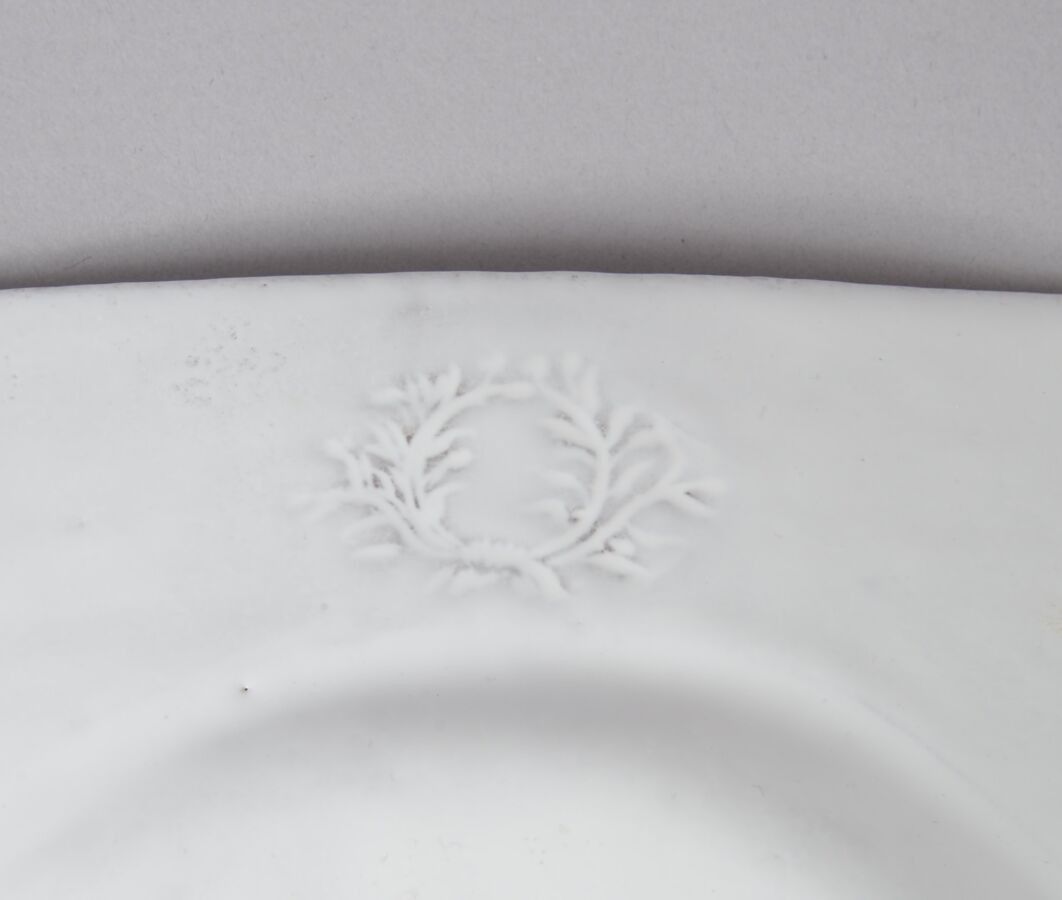 Suite of twelve square soup plates in plain white glazed earthenware. Laurel crown mark on reverse.