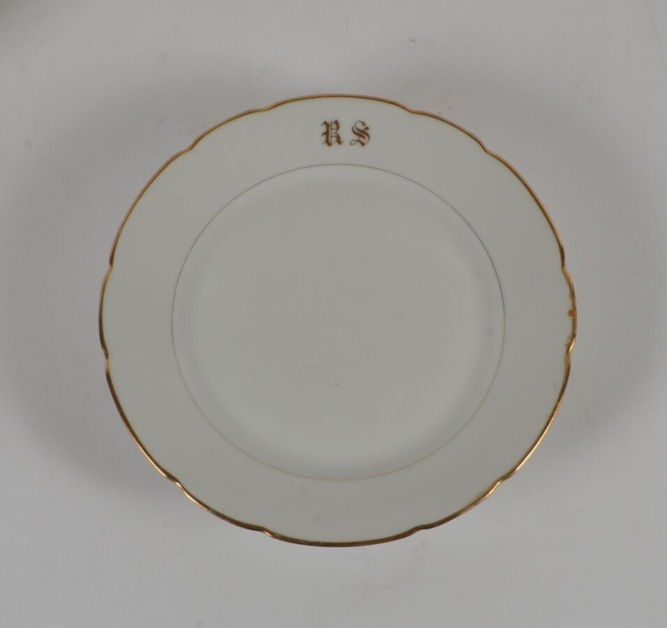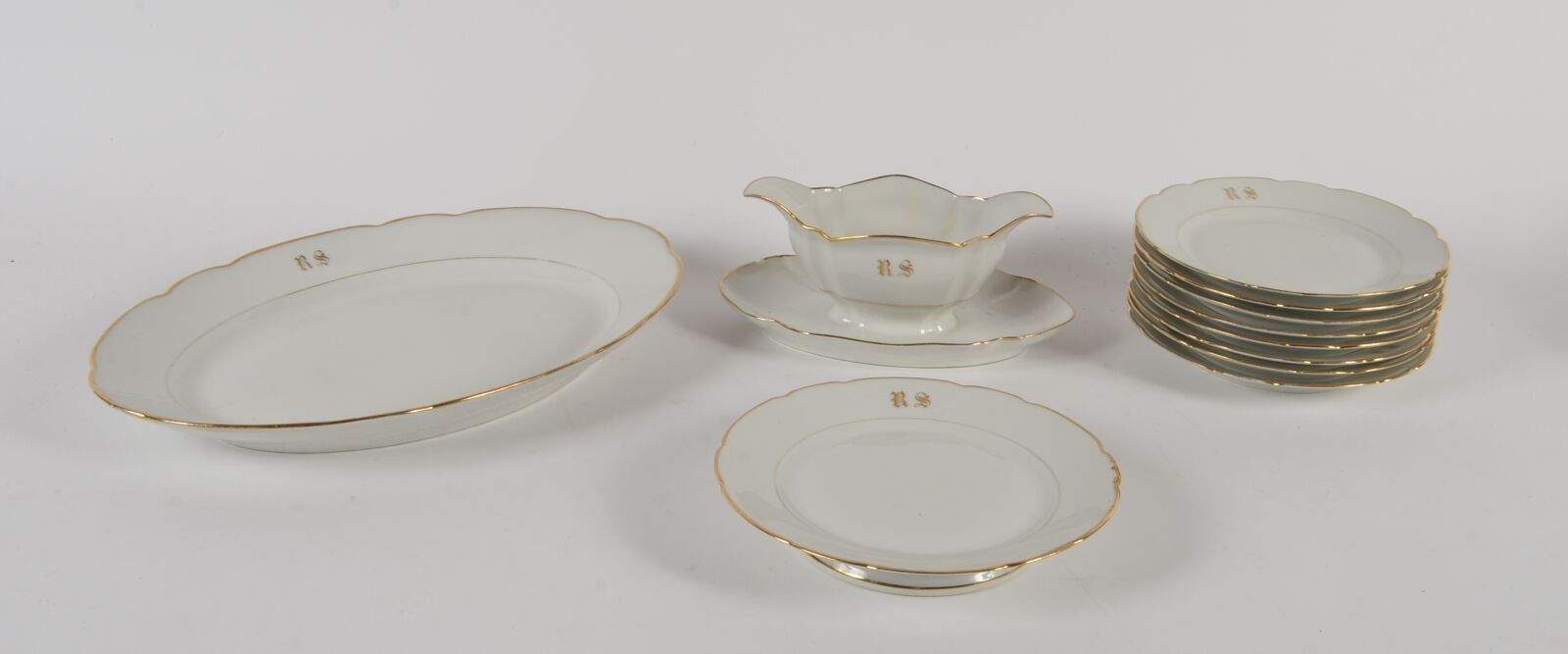 An important set of tableware in gilt-edged porcelain monogrammed "RS", including circular and oval serving dishes, a pedestal stand, two sauce boats, two heel stands, thirty-six plates, twelve soup plates and twenty-two dessert plates.
