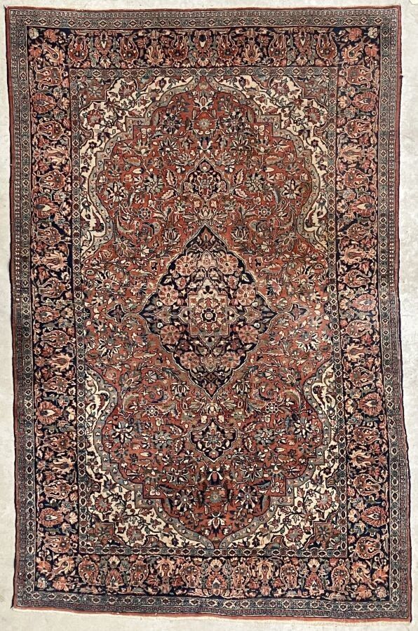 Hand-knotted wool and silk carpet, decorated with a central medallion on a midnight blue and red background, border on a midnight blue background.
