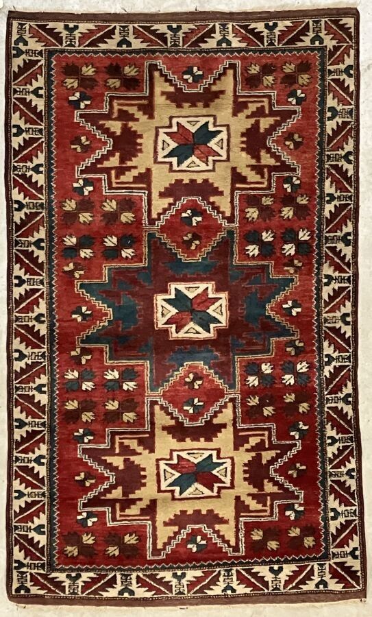 Polychrome wool carpet decorated with starry medallions on a red background.