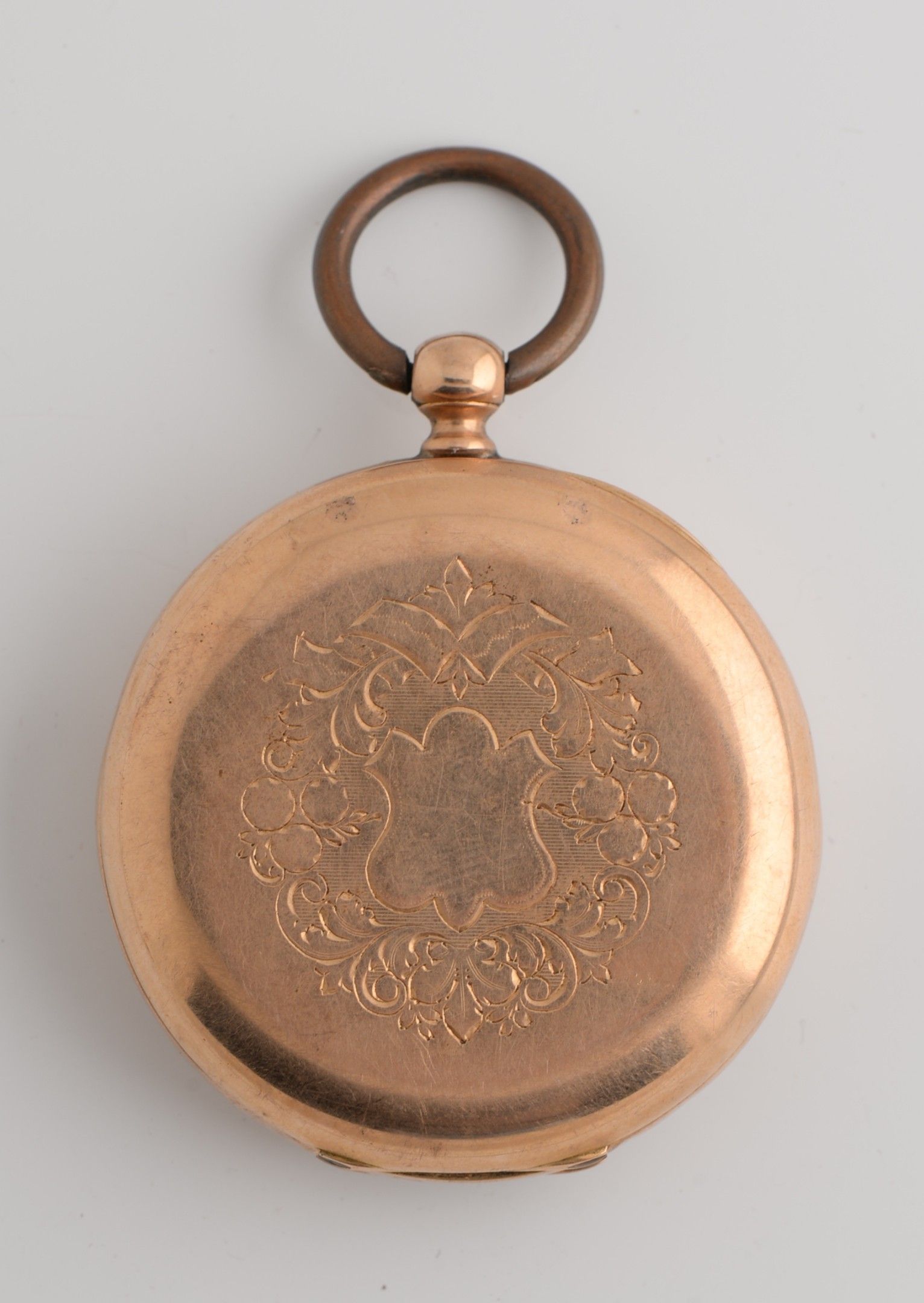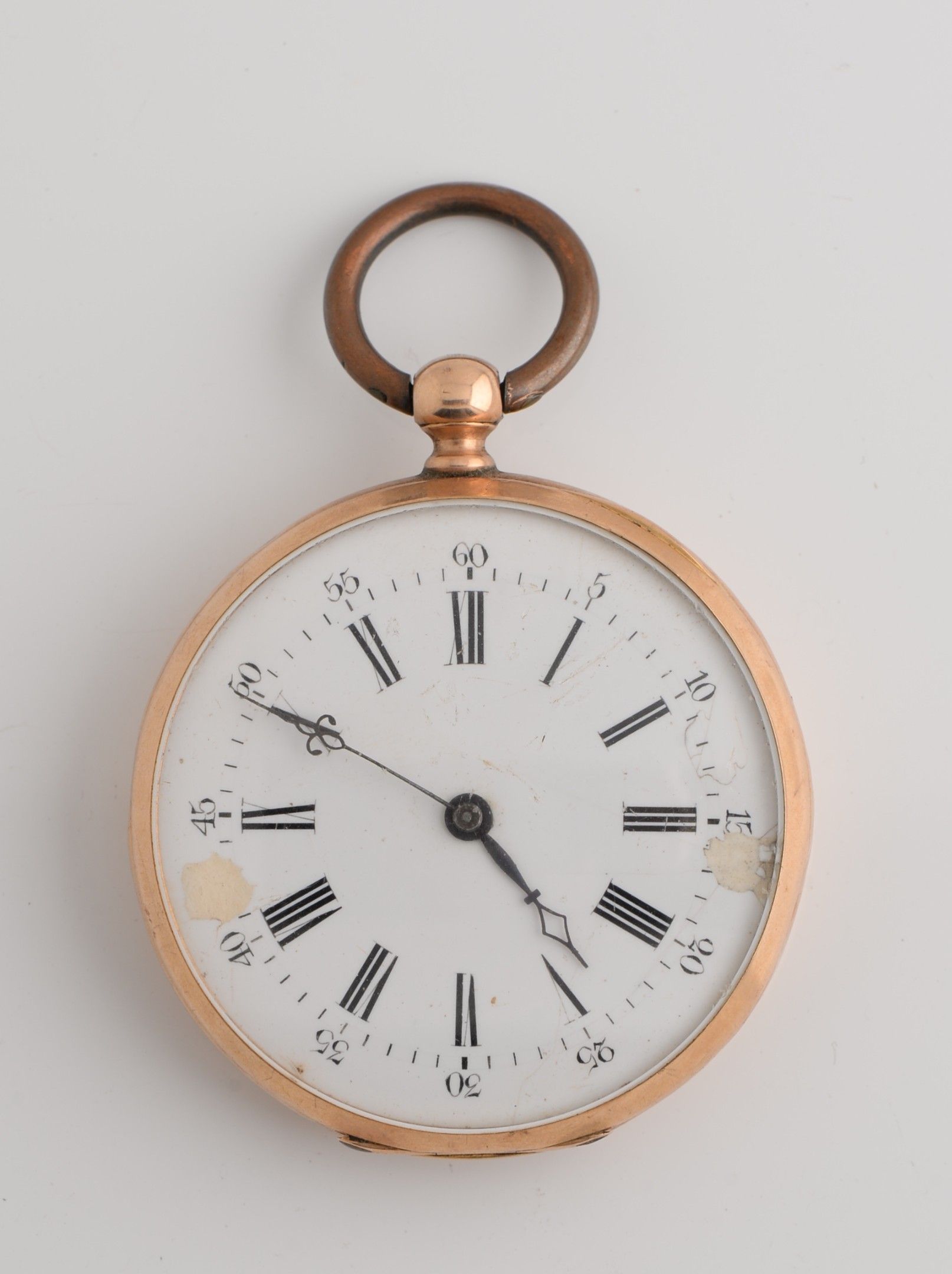 Pocket watch with yellow gold case and dust cover, metal clasp, the back engraved with an escutcheon. Mechanical cylinder movement. White enamelled dial showing the hours in Roman numerals and the minutes in Arabic numerals.