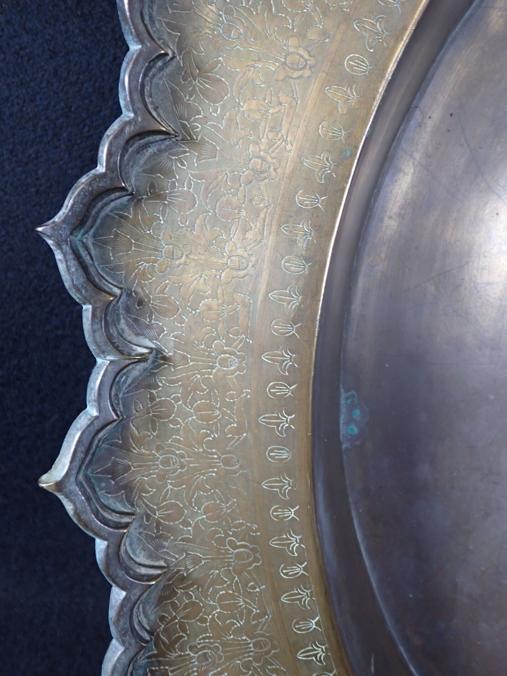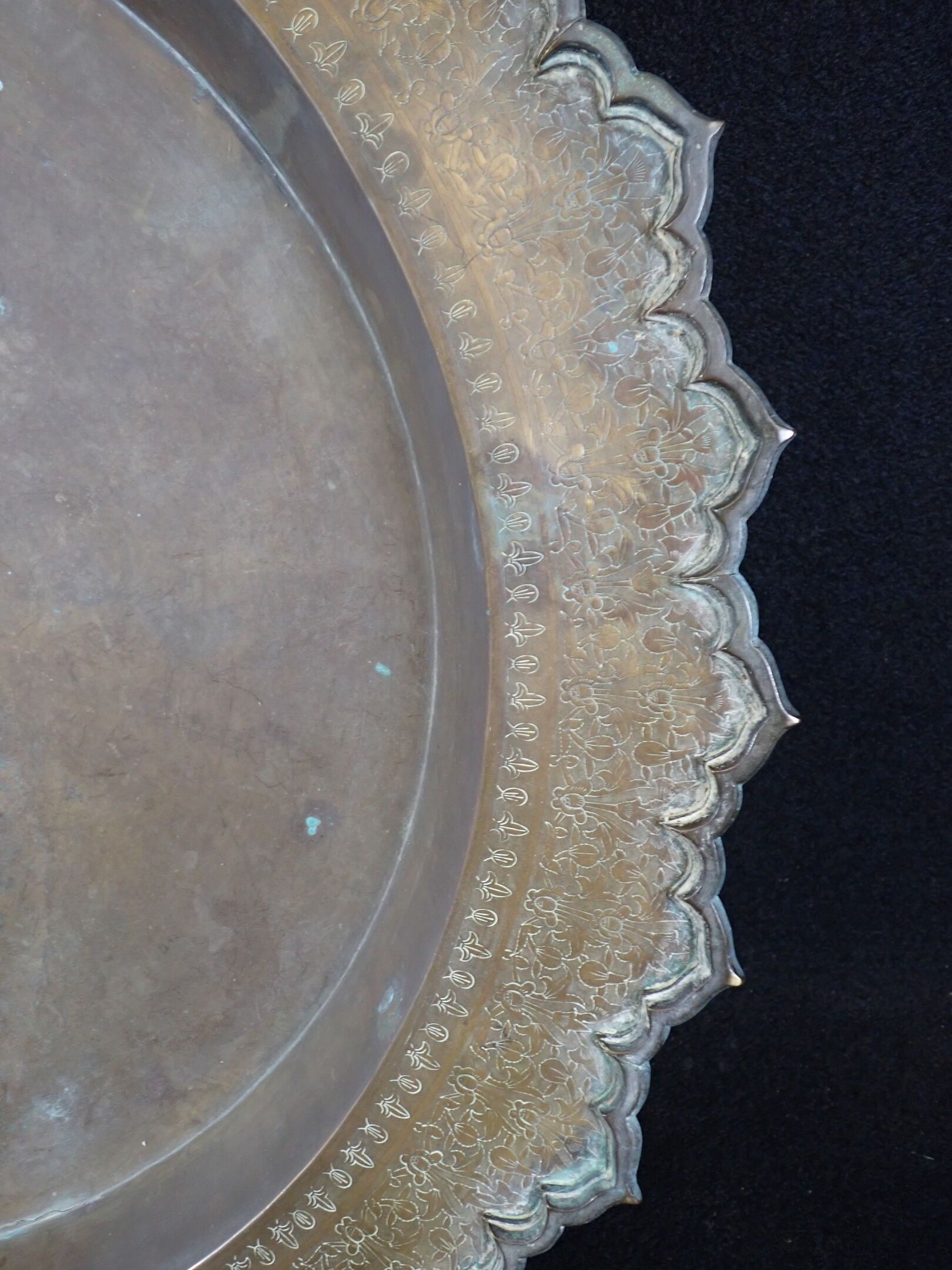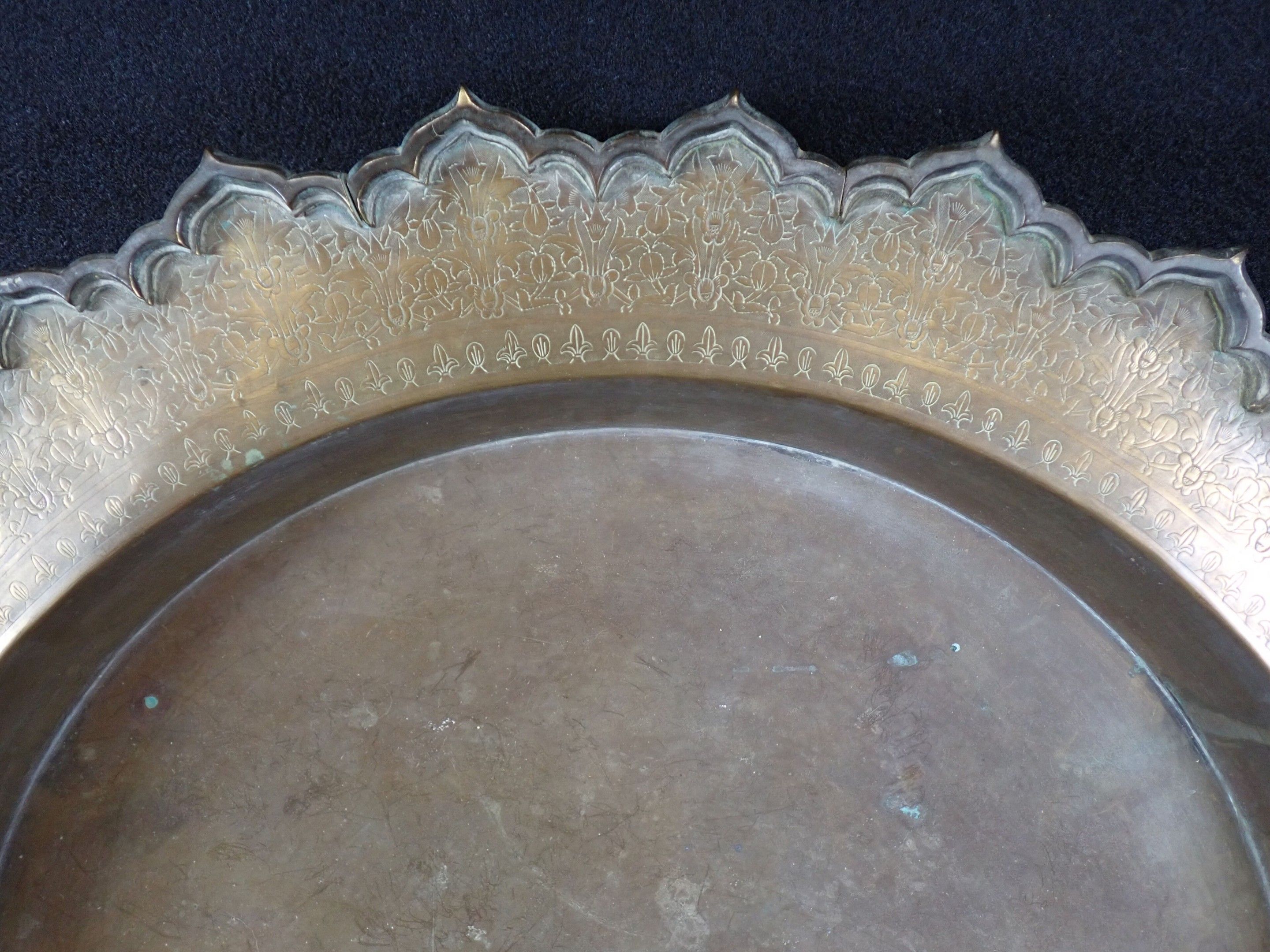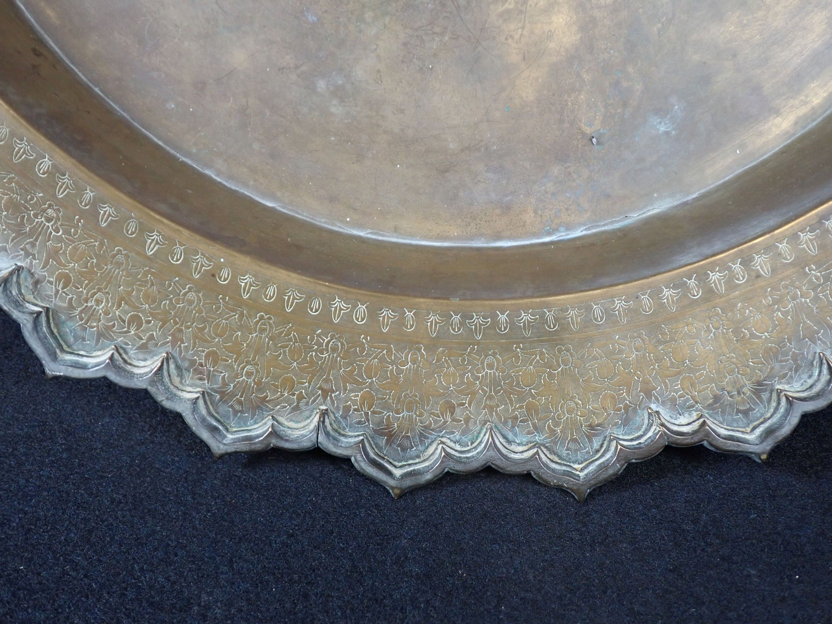 IRAN - INDIA. A large Indo-Persian brass bowl on a foot with engraved floral and plant motifs on the rim and poly-lobed decoration. Height: 16 cm - diameter: 61 cm