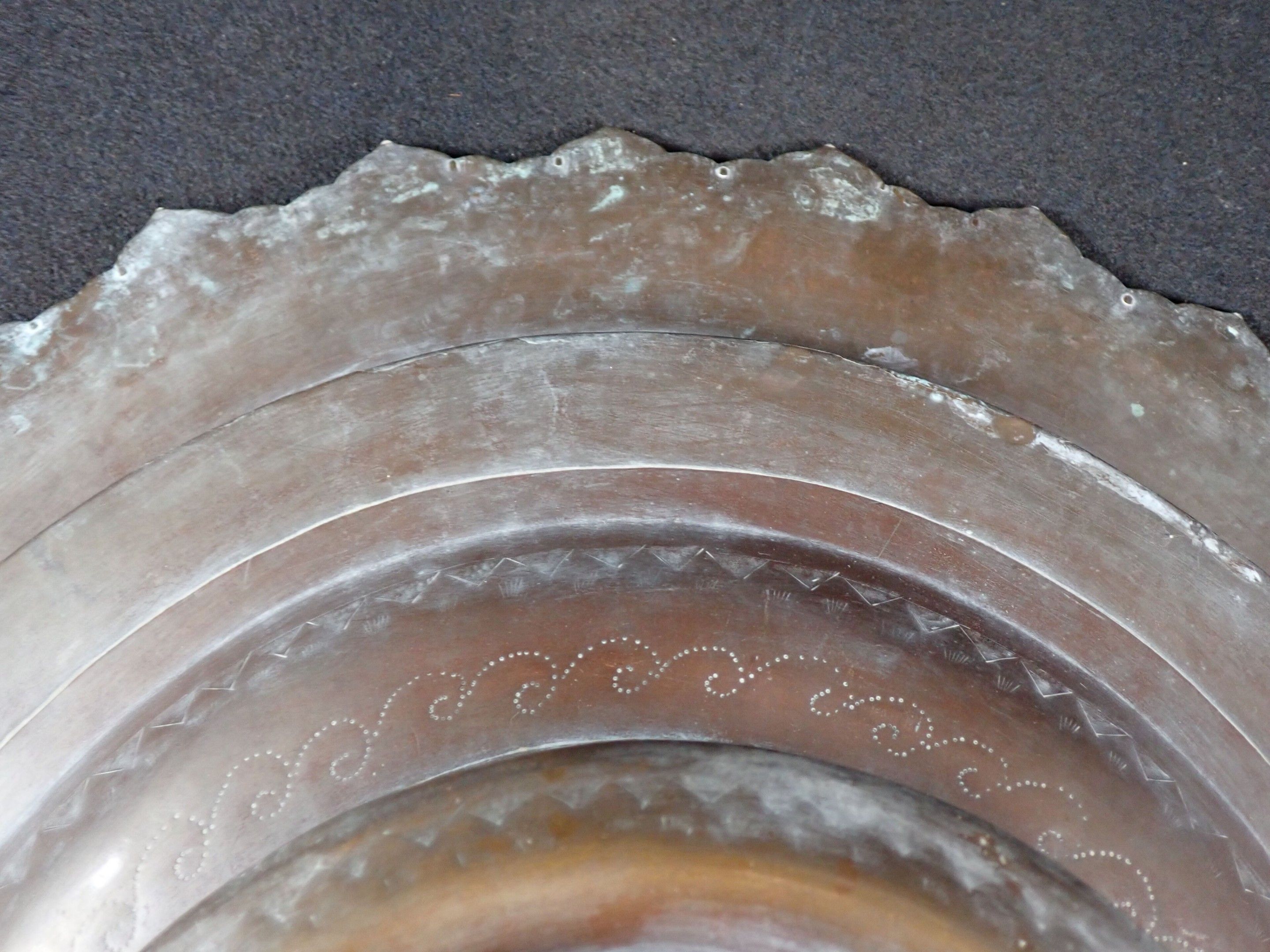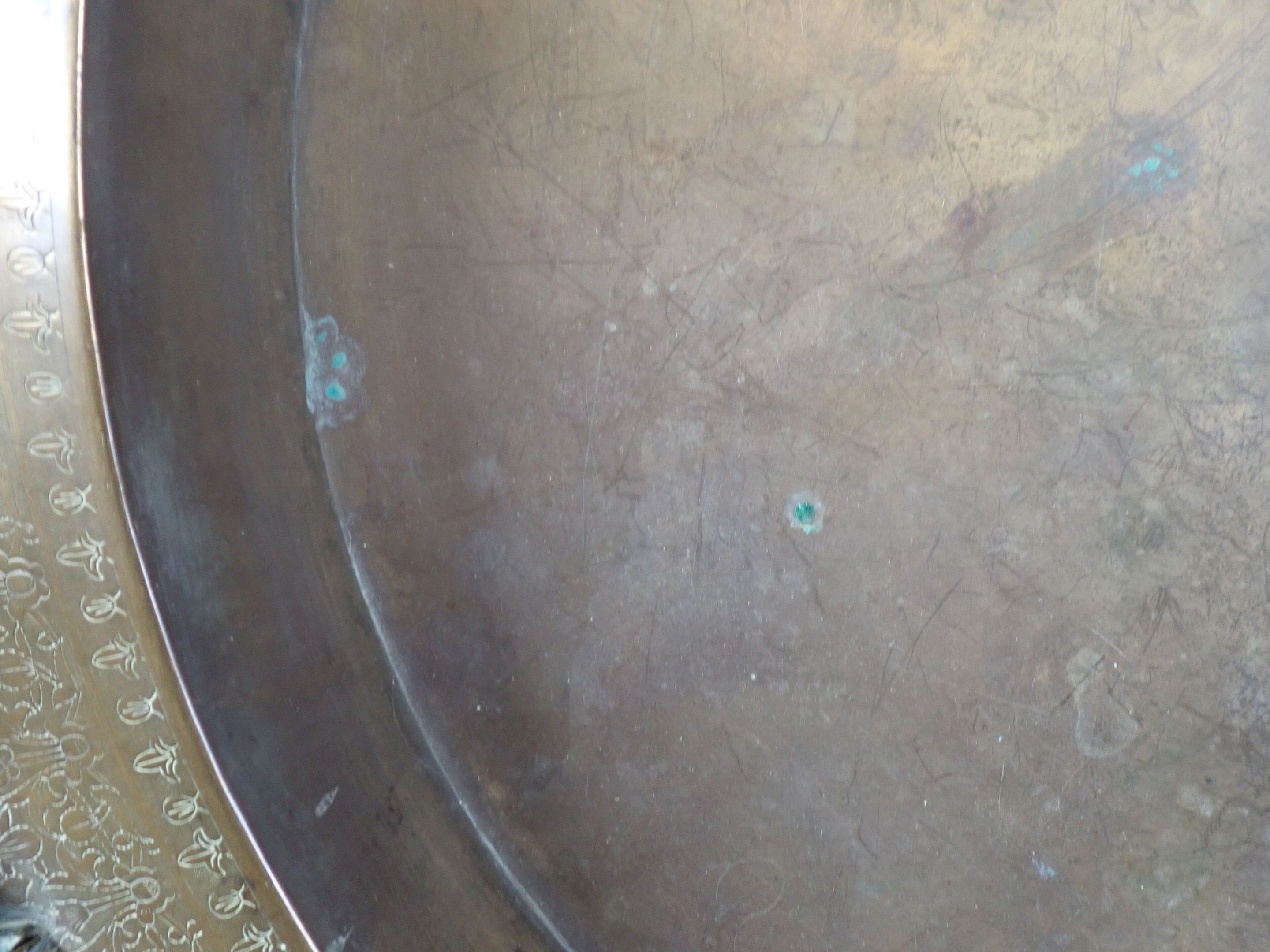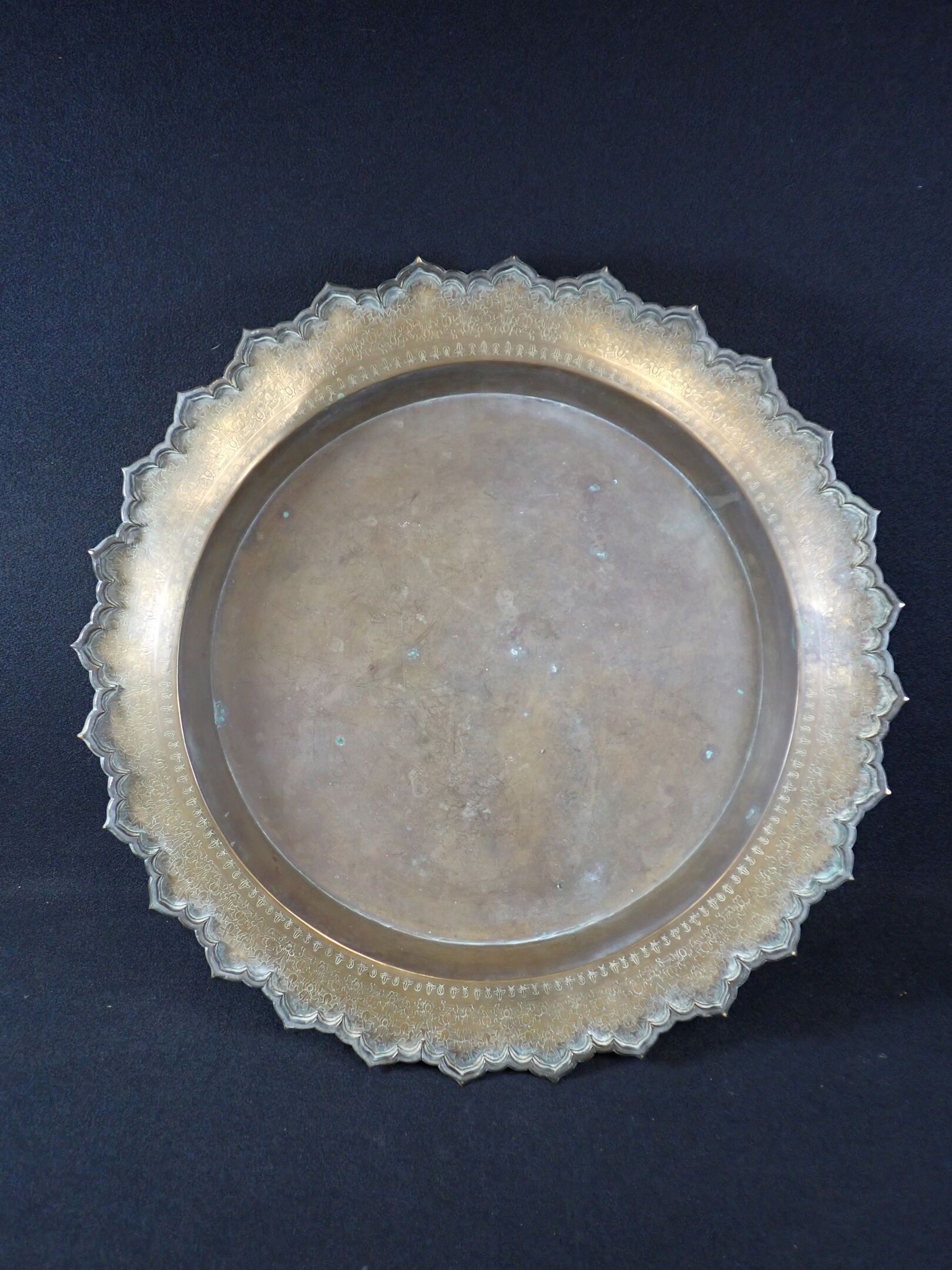 IRAN - INDIA. A large Indo-Persian brass bowl on a foot with engraved floral and plant motifs on the rim and poly-lobed decoration. Height: 16 cm - diameter: 61 cm