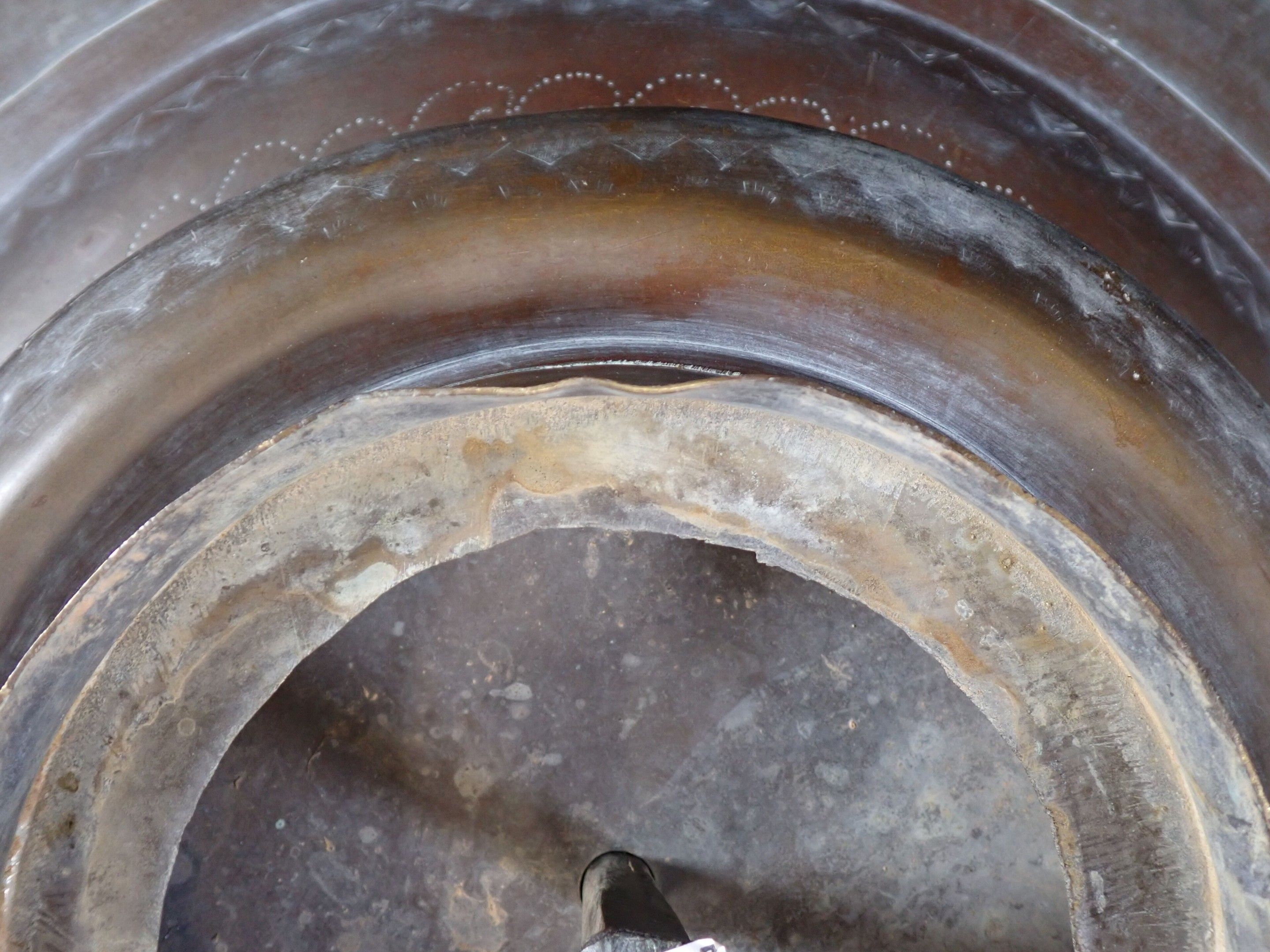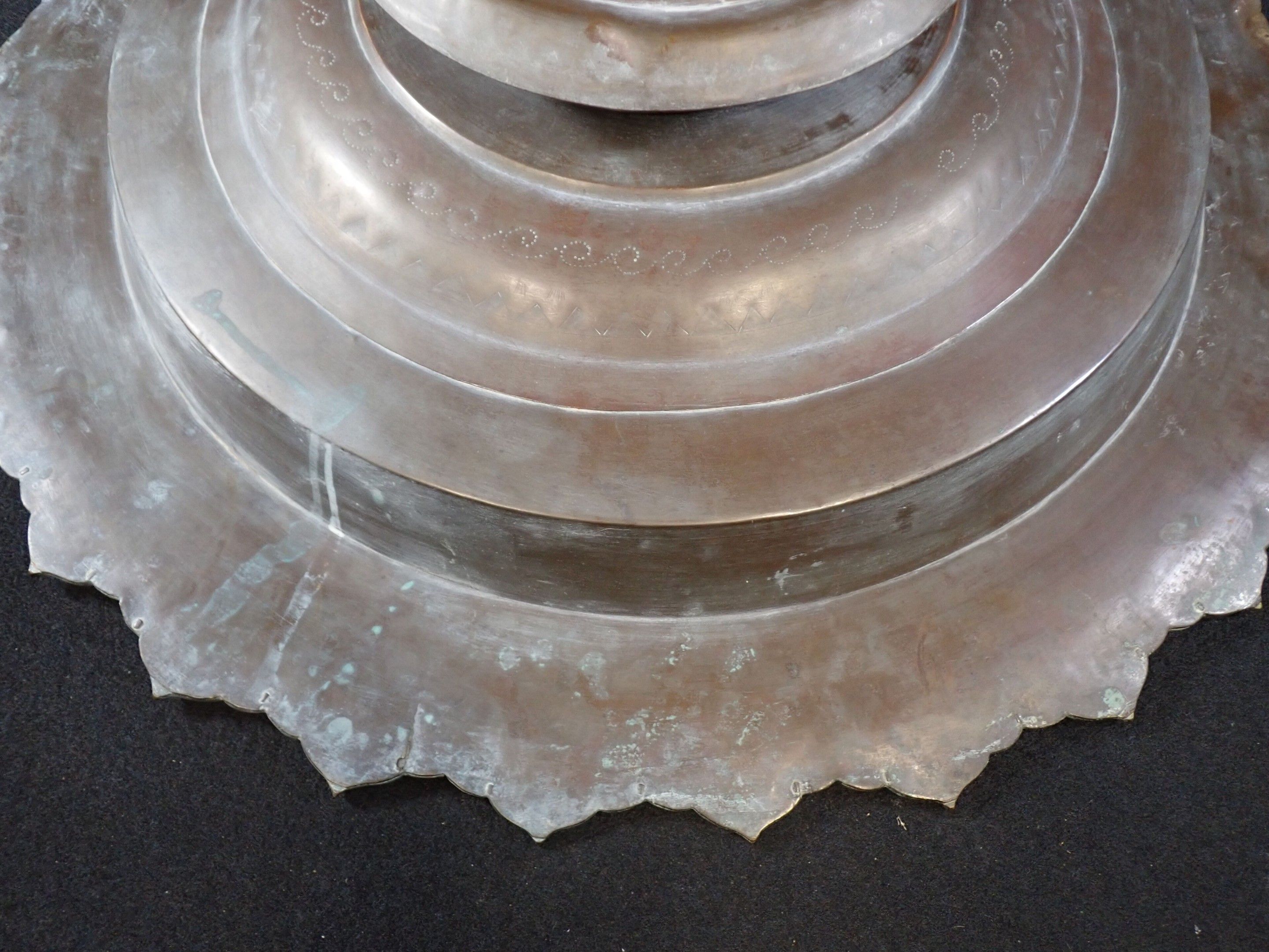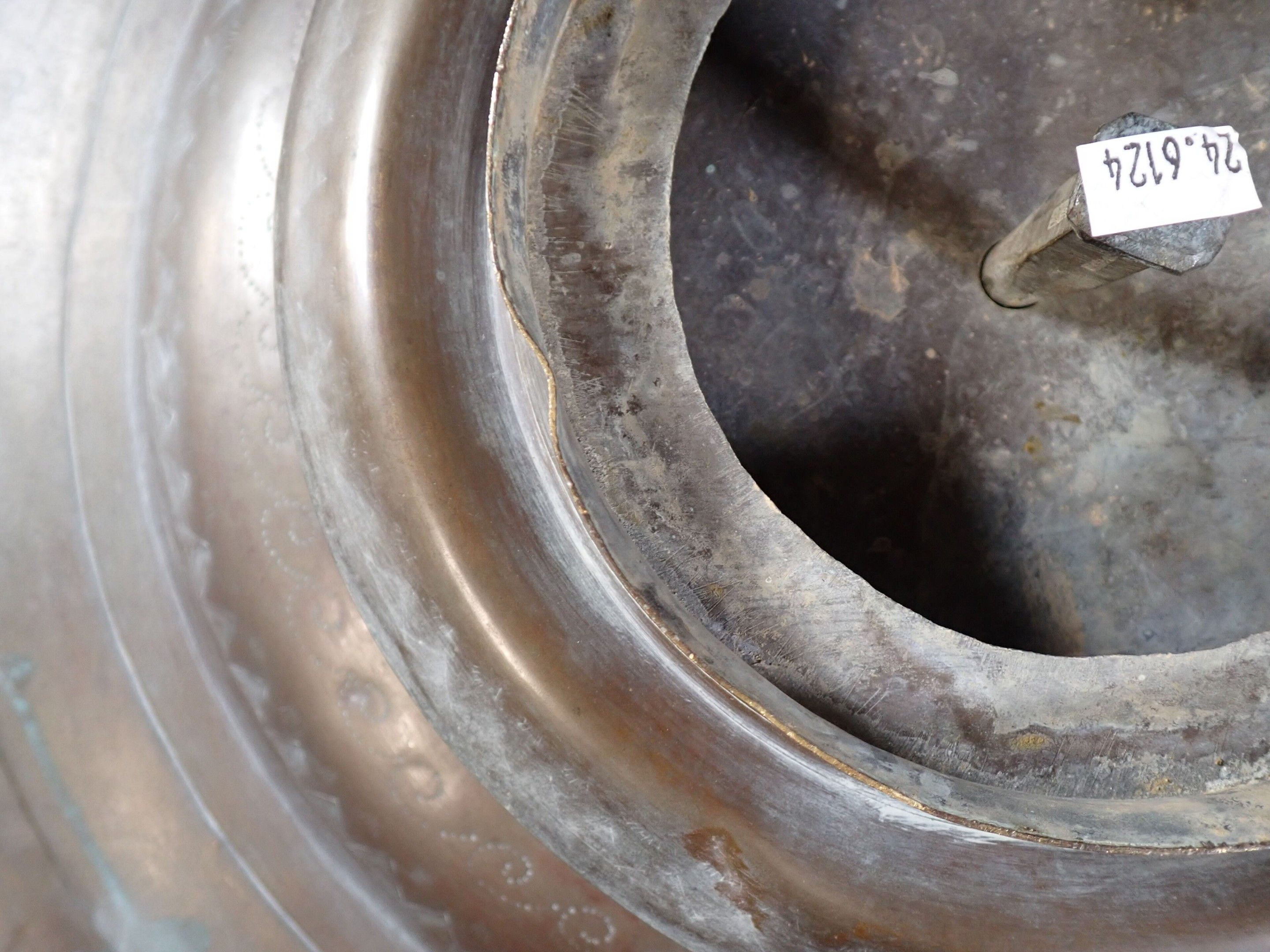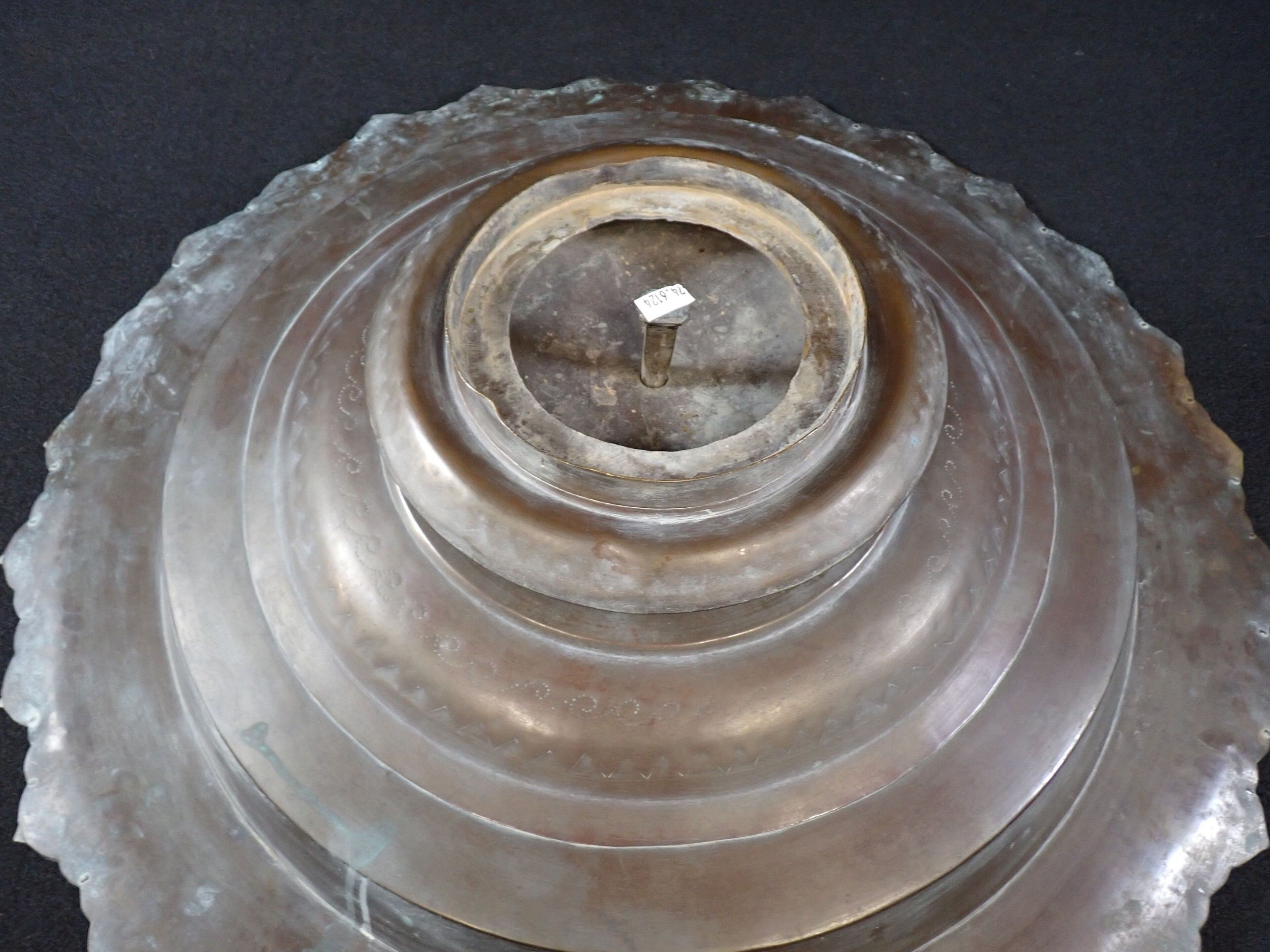 IRAN - INDIA. A large Indo-Persian brass bowl on a foot with engraved floral and plant motifs on the rim and poly-lobed decoration. Height: 16 cm - diameter: 61 cm