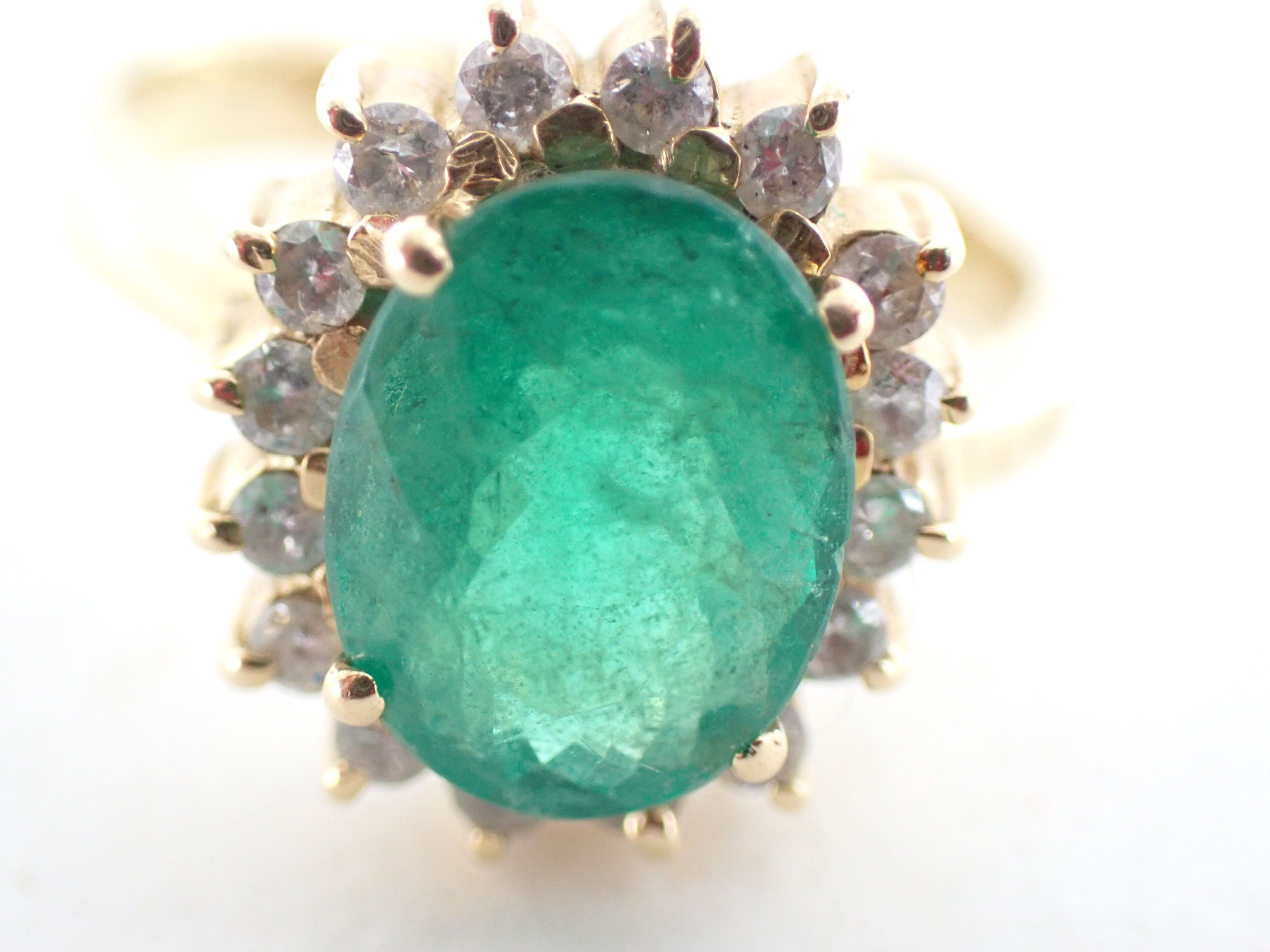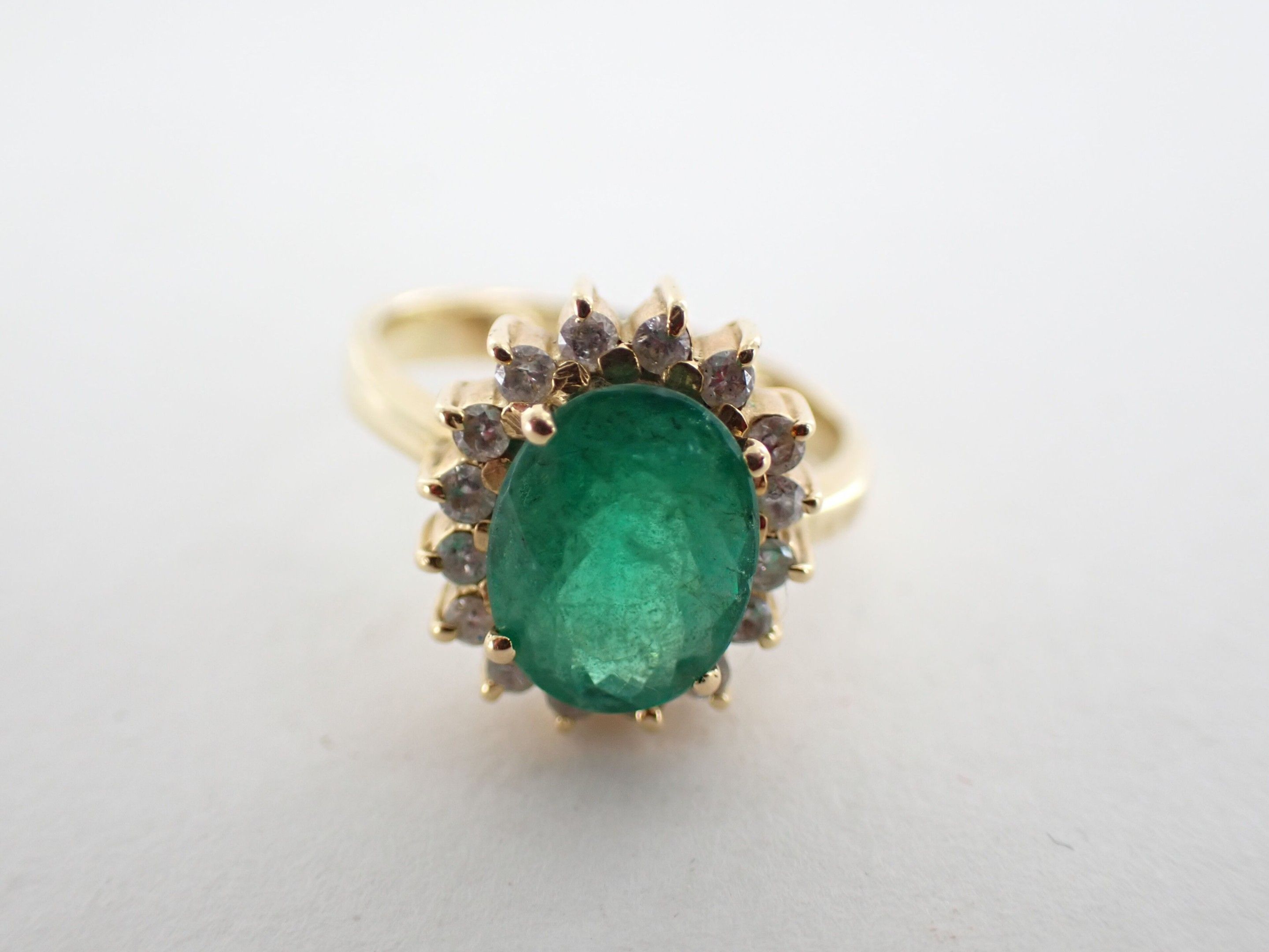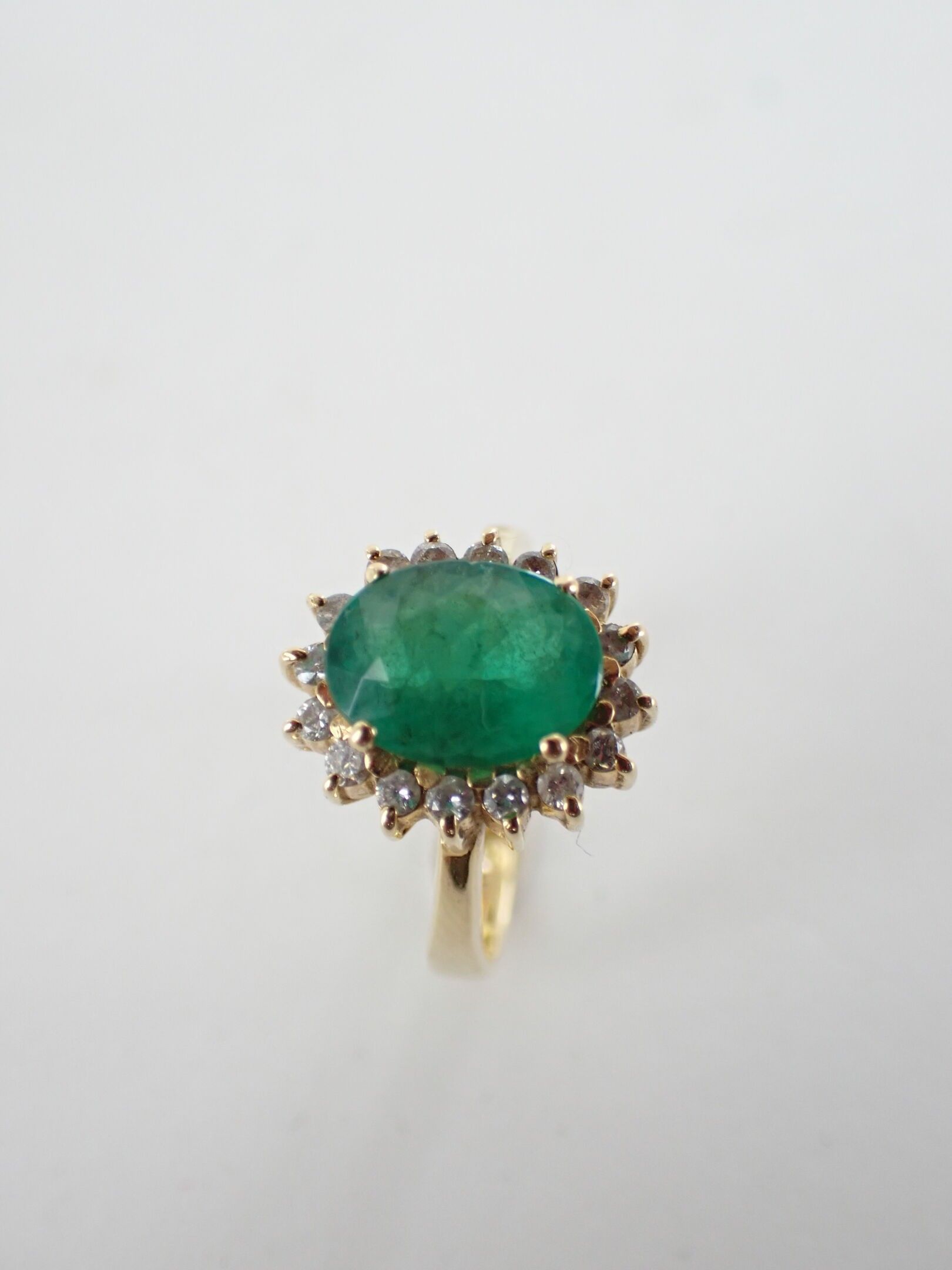 A thousandths gold ring centred on an oval-cut emerald surro…