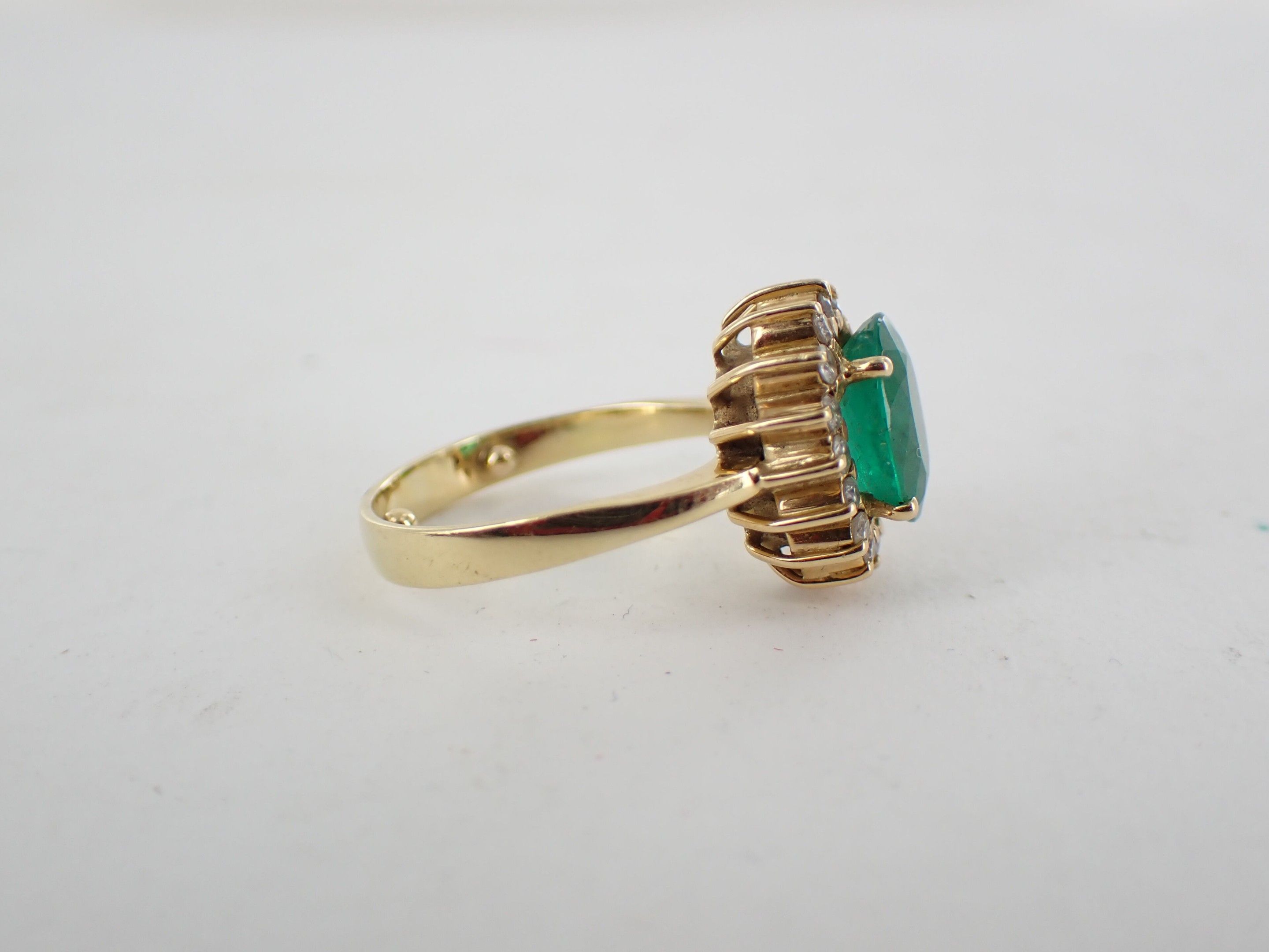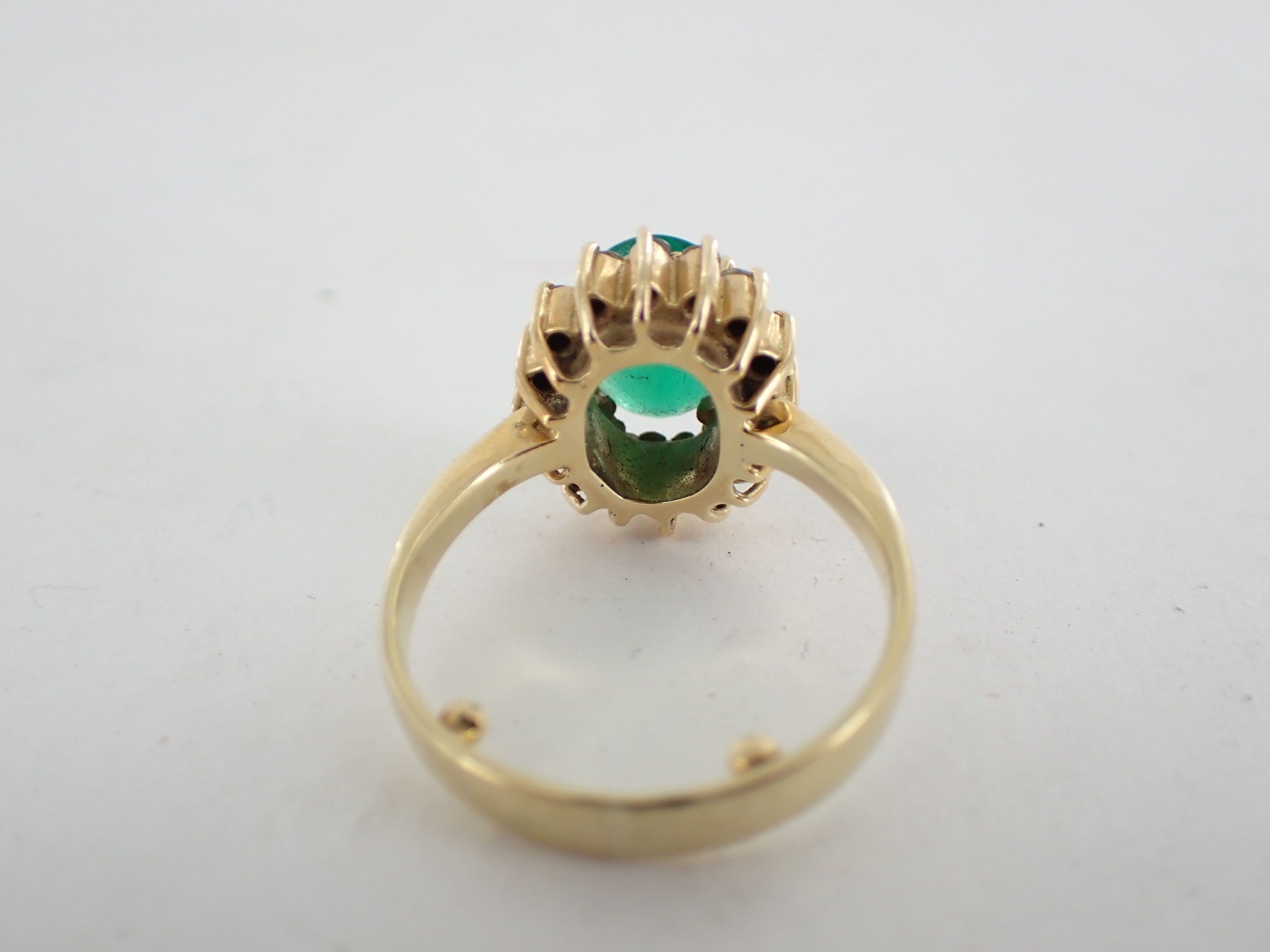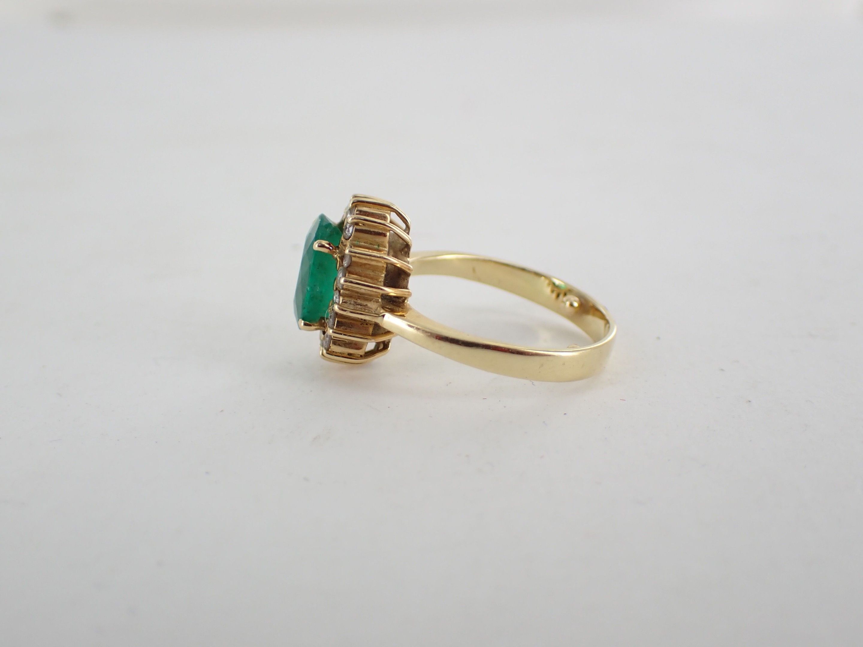 A thousandths gold ring centred on an oval-cut emerald surrounded by brilliants.
