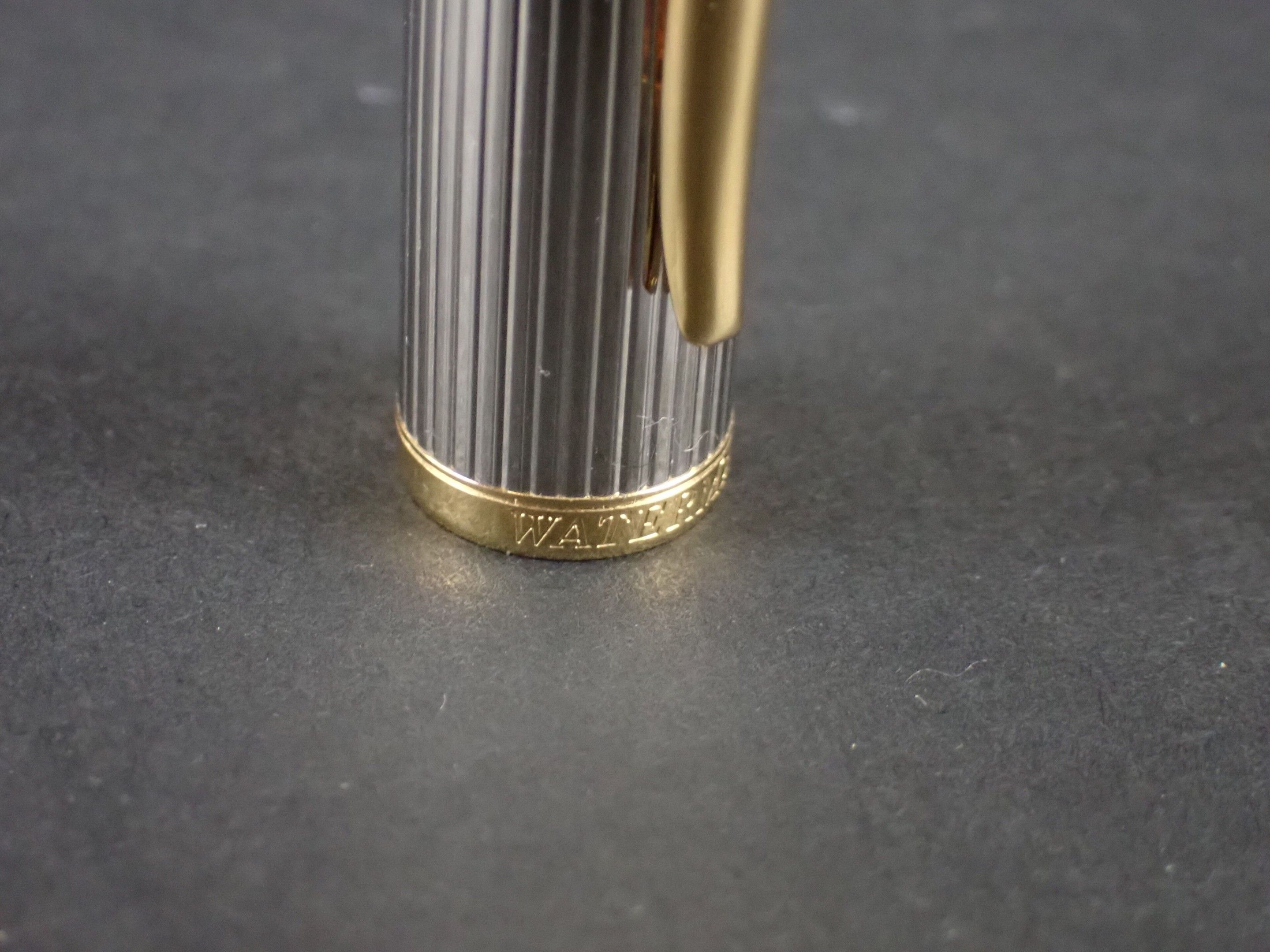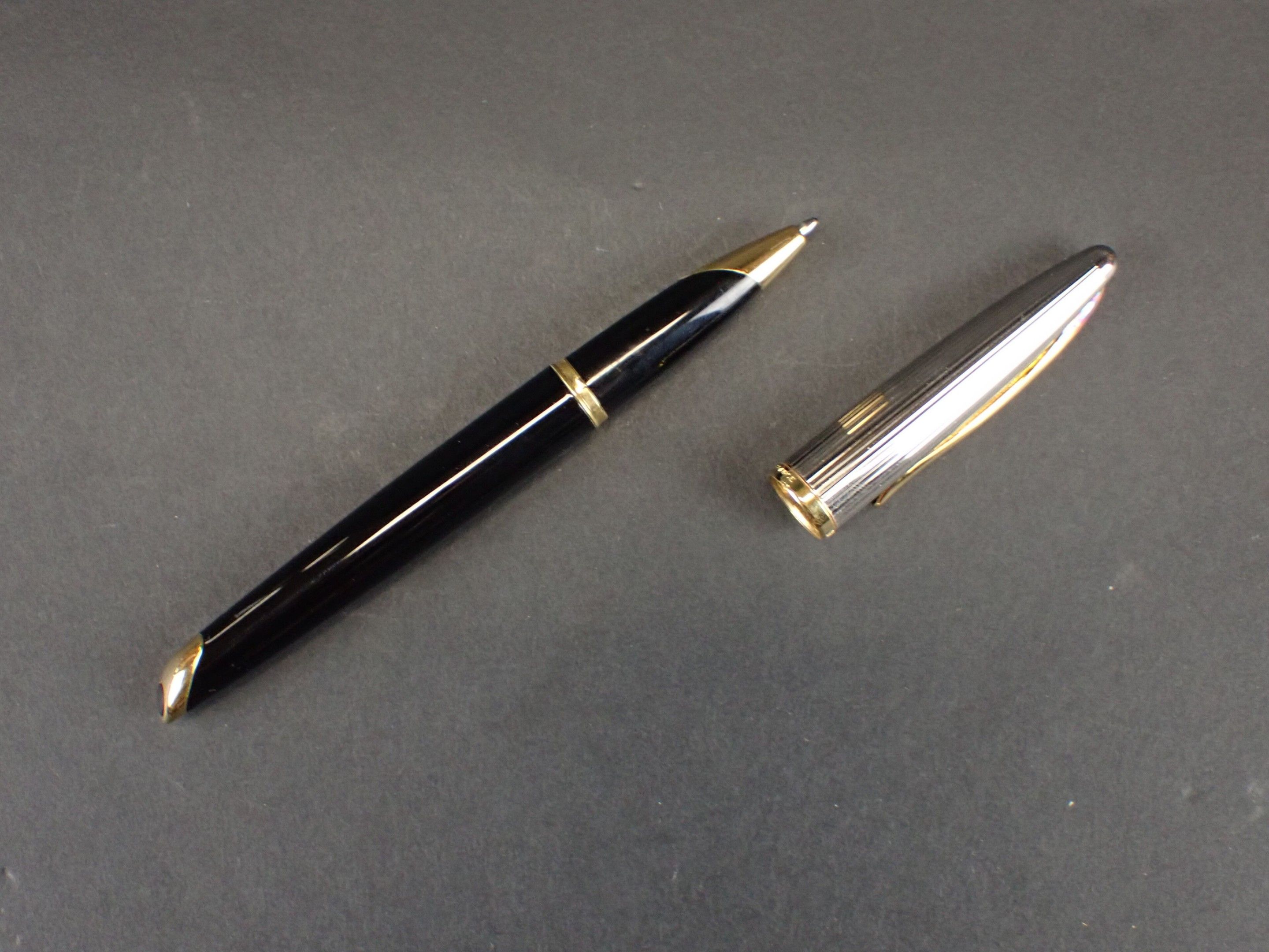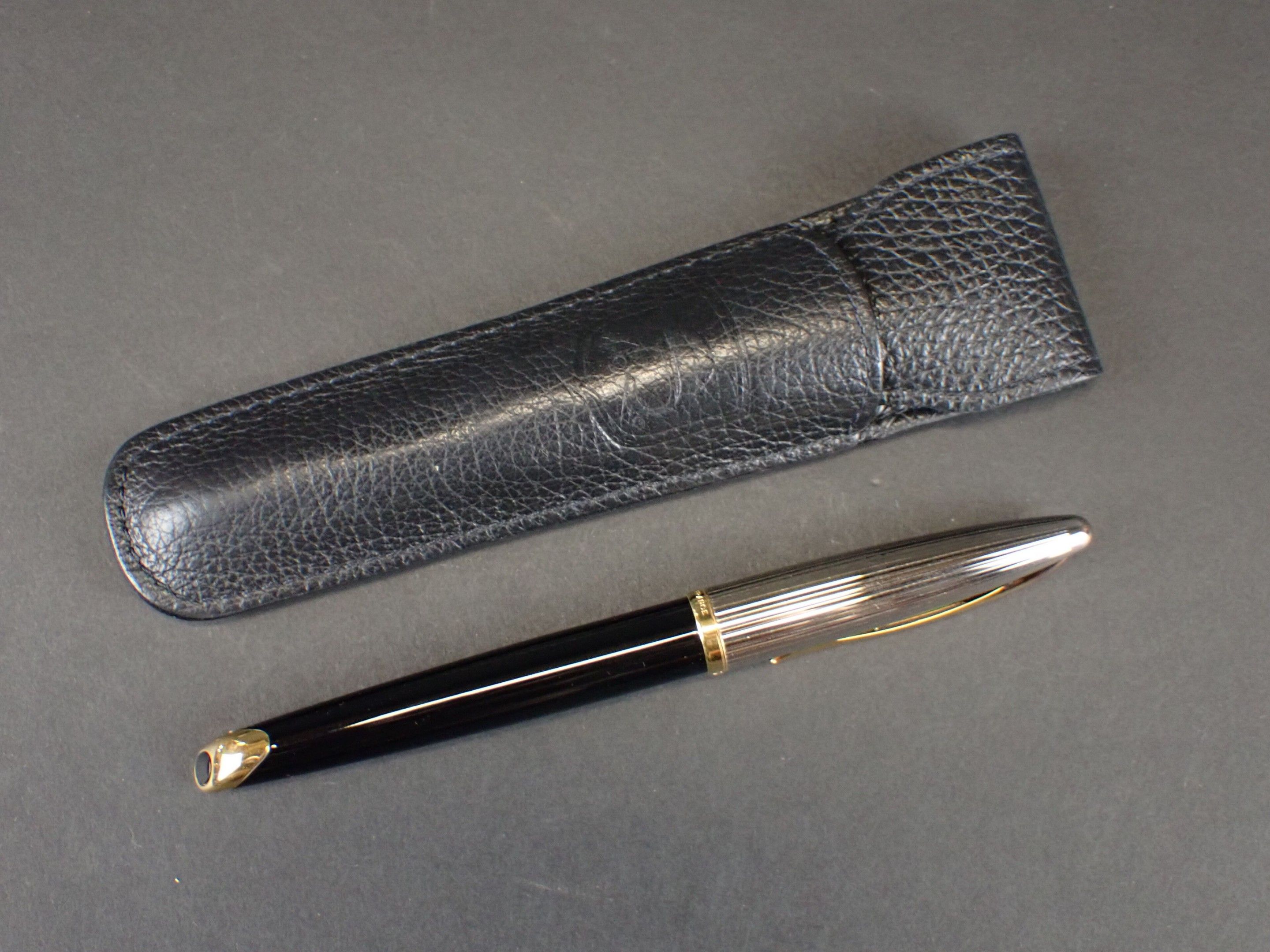 WATERMAN. Biros in black lacquered resin and silver and gold-plated metal, in leather case.