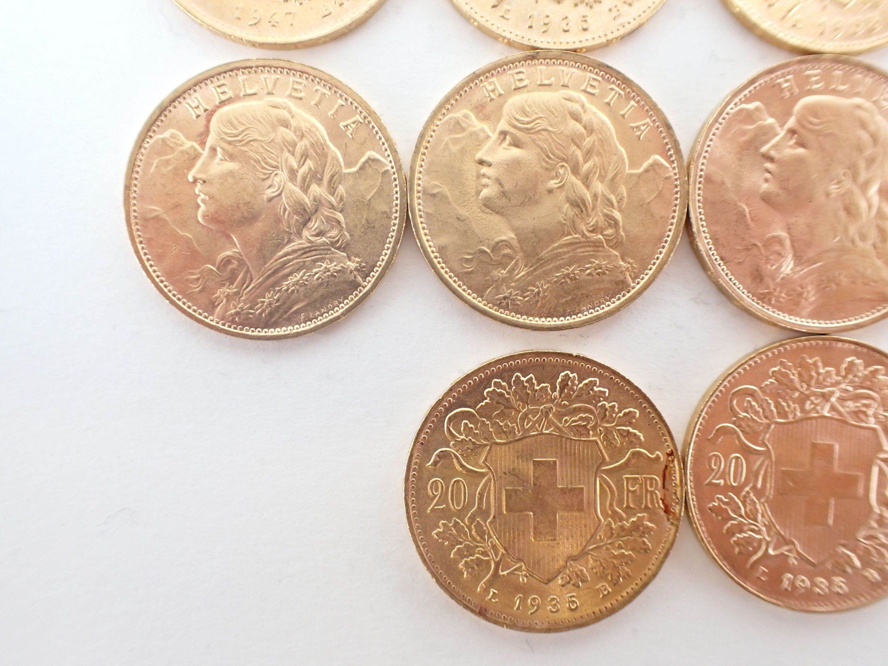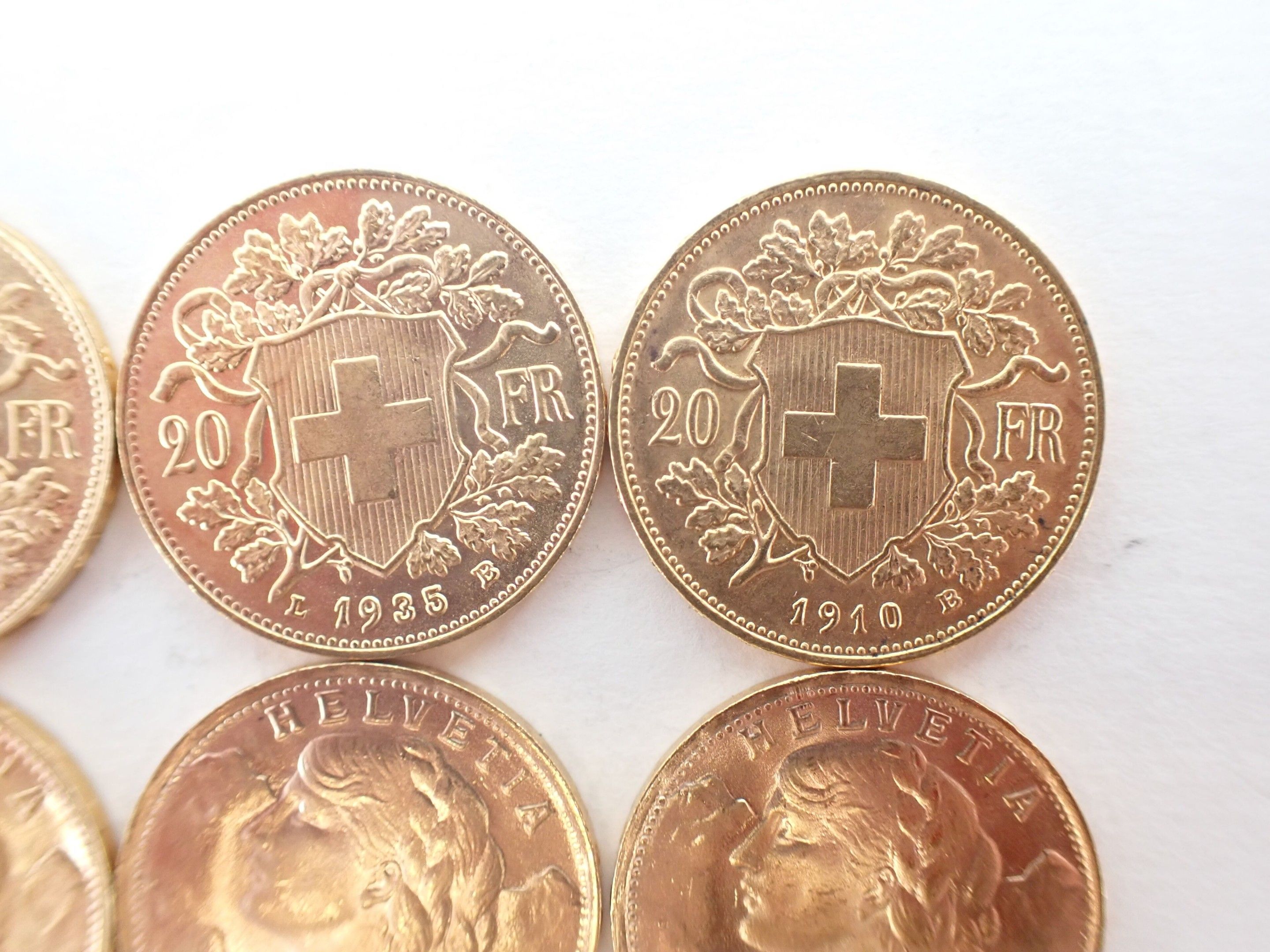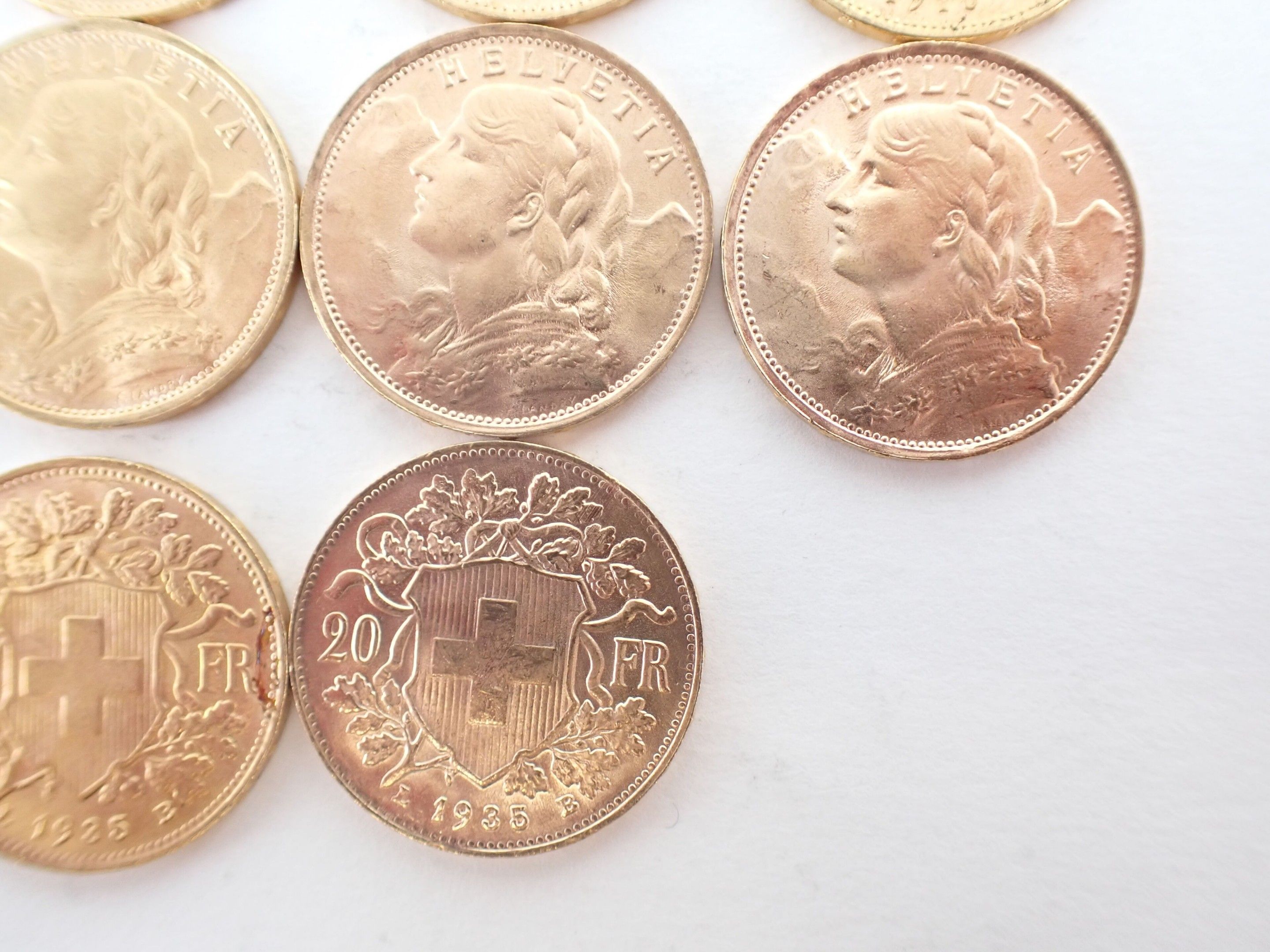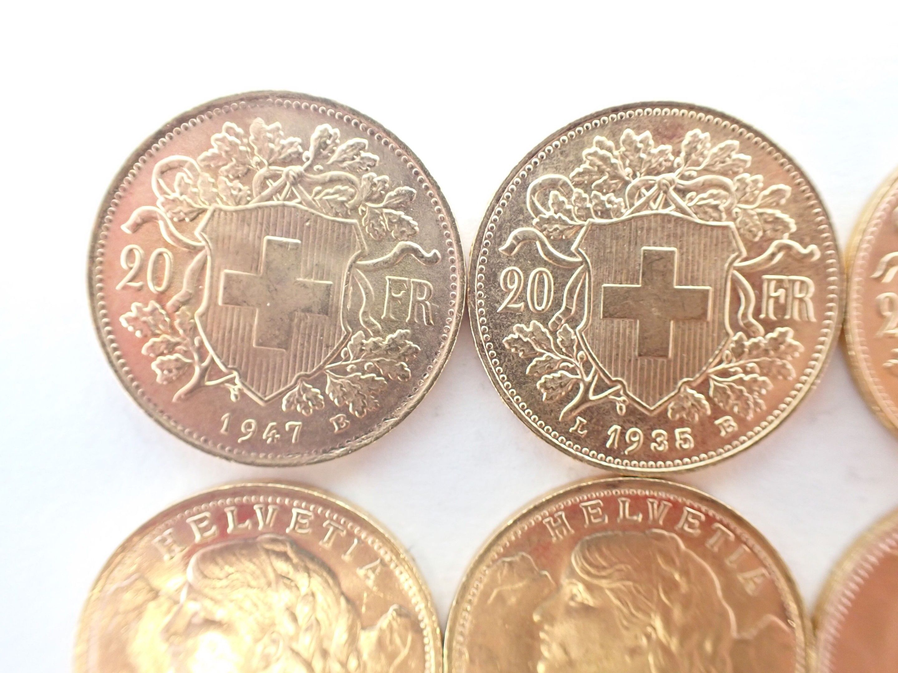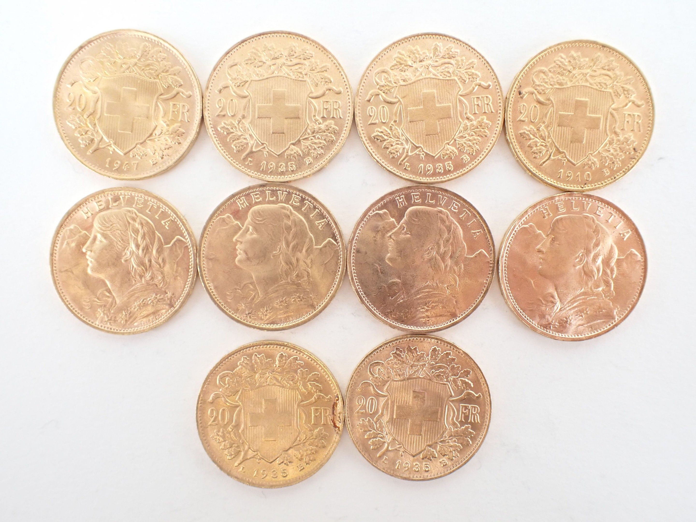 10 Swiss 20 franc gold coins Helvetia - Weight: 64.