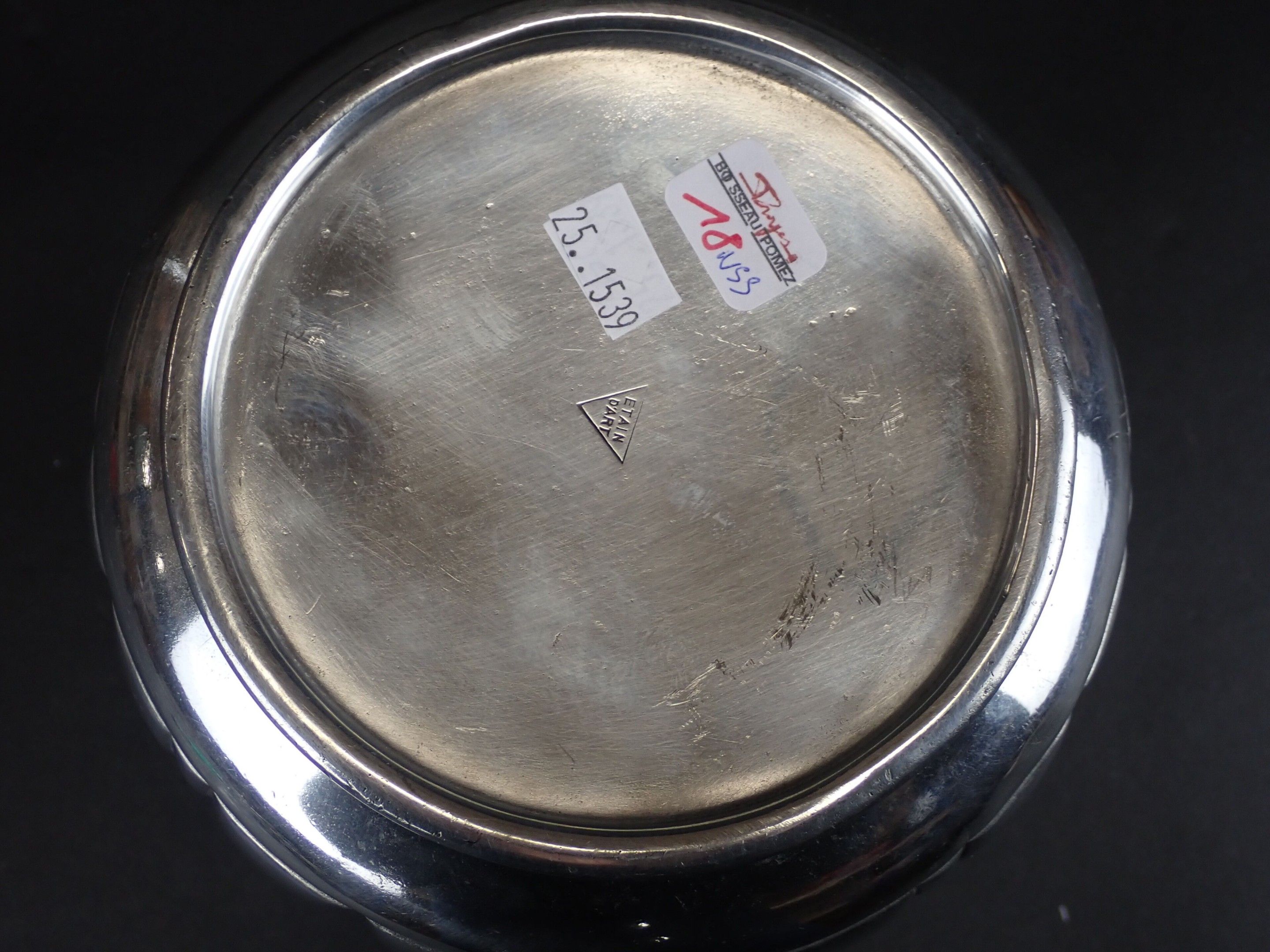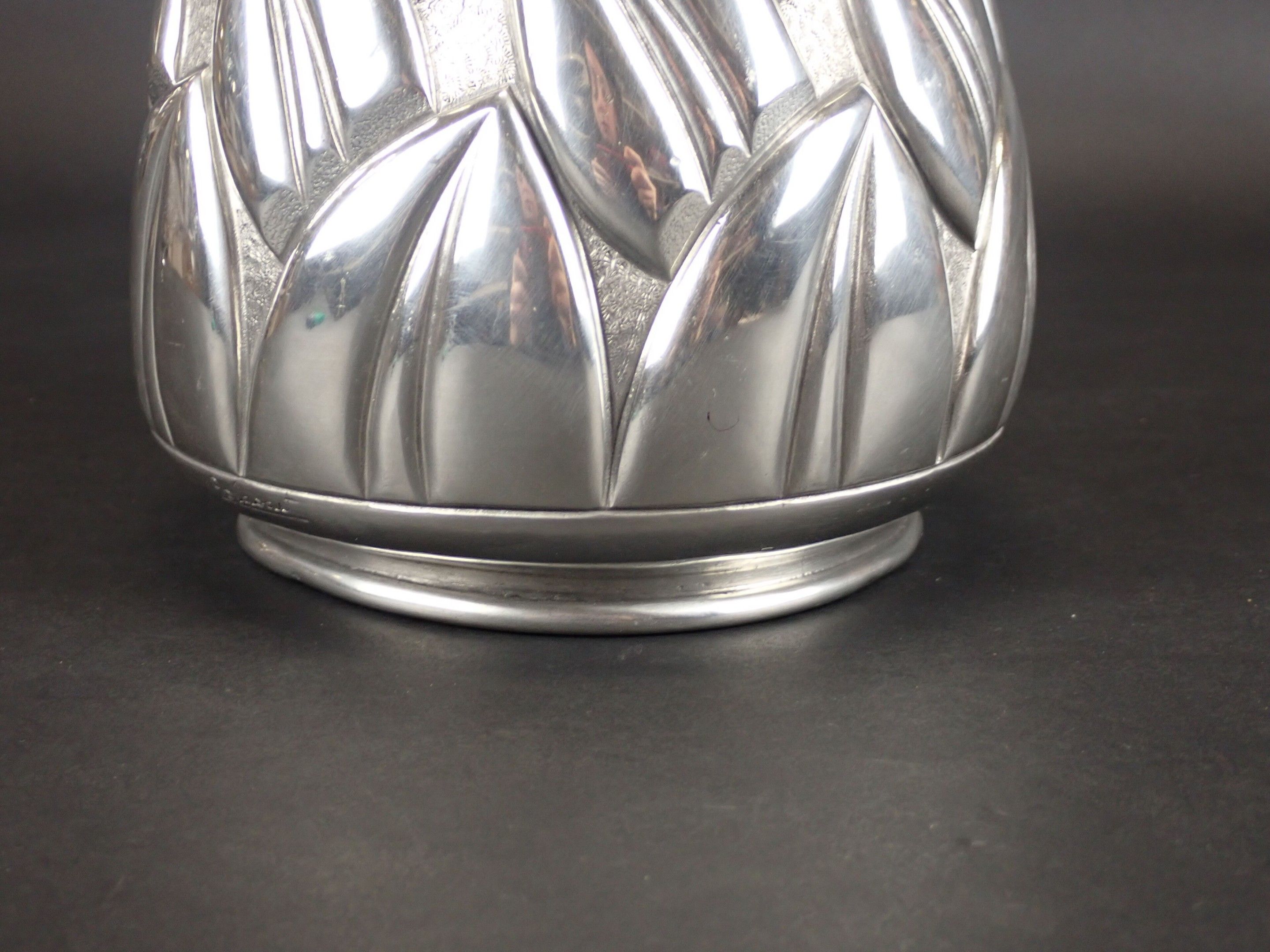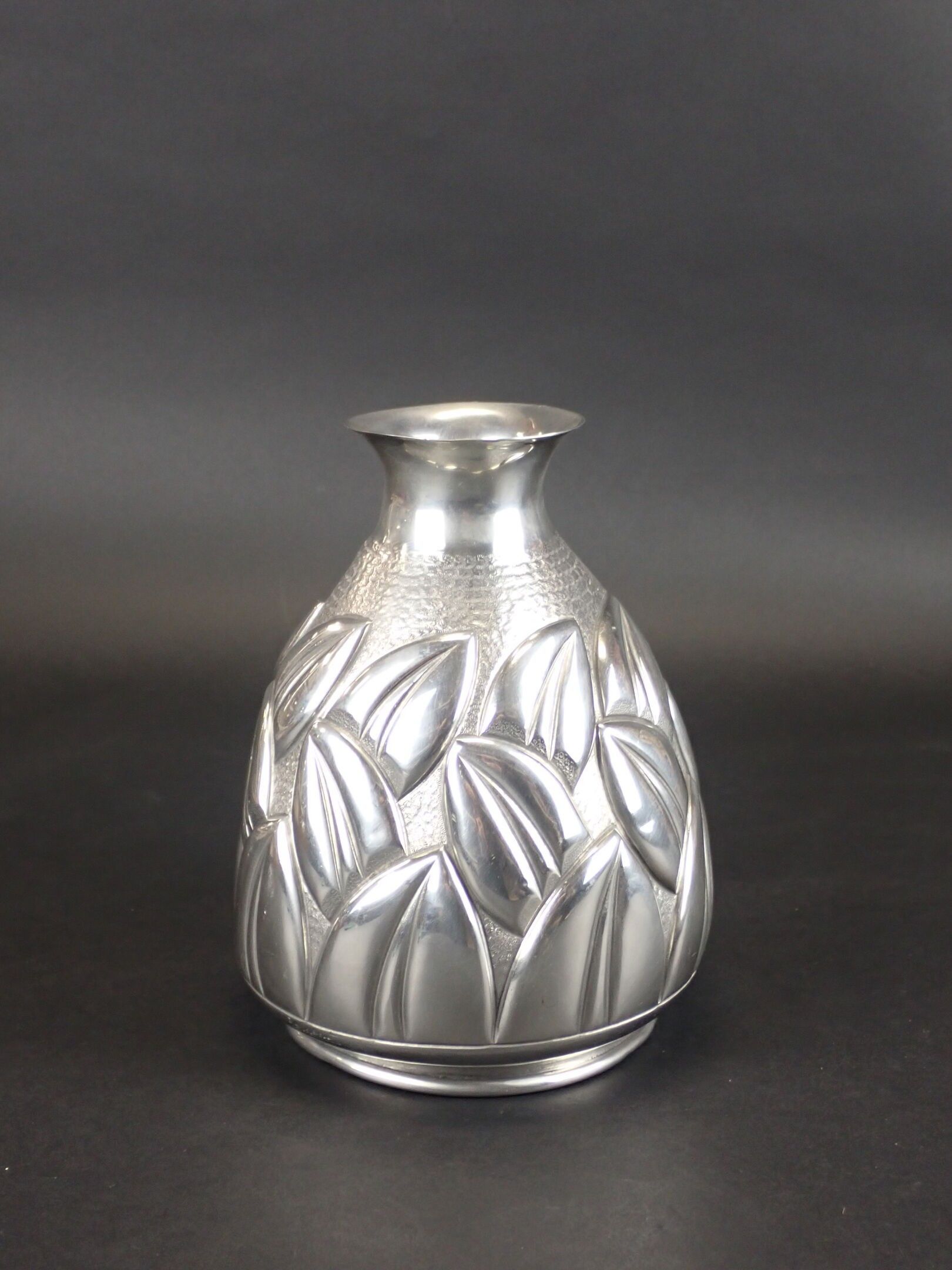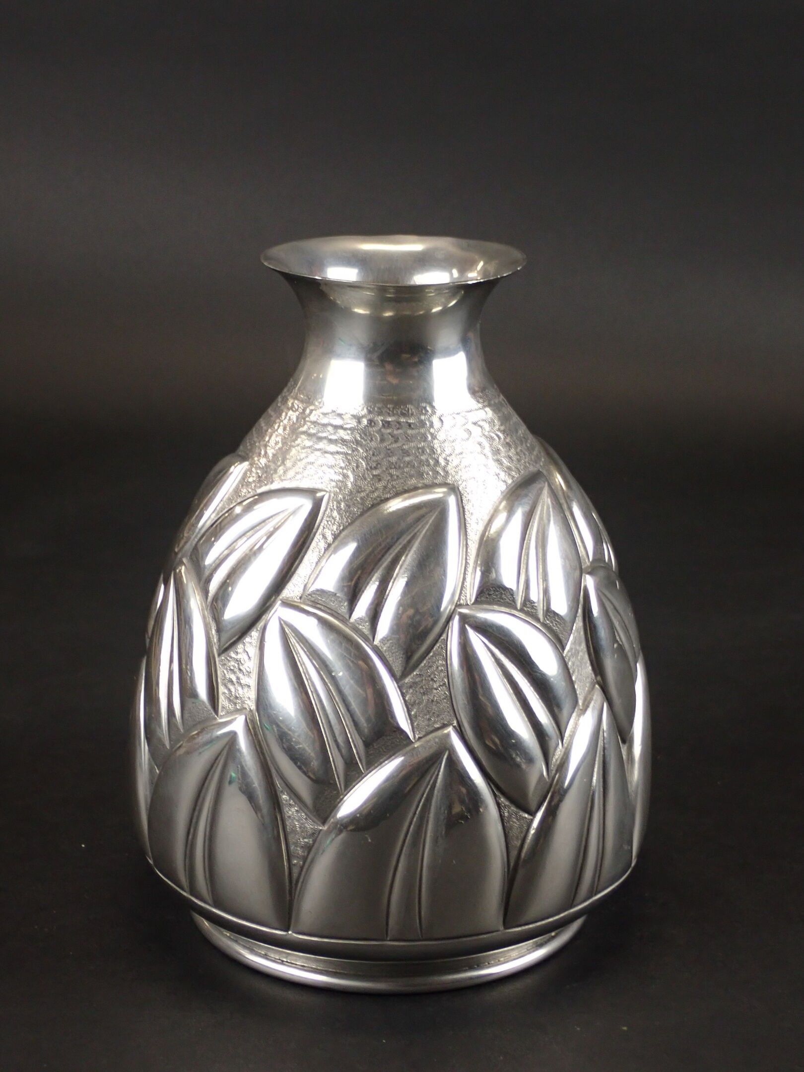 PIERRE-AMÉDÉE PLASAIT (BORN IN 1910) Polished pewter "Feuillage" vase with rounded body and narrow neck, decorated with large leaves set against a finely hammered background. Signed "Pplasait" on the edge of the base. Stamped "Etain d'art" in a triangle on the reverse of the base. (Scratches, small dents) Height 20 cm - Diameter 16 cm