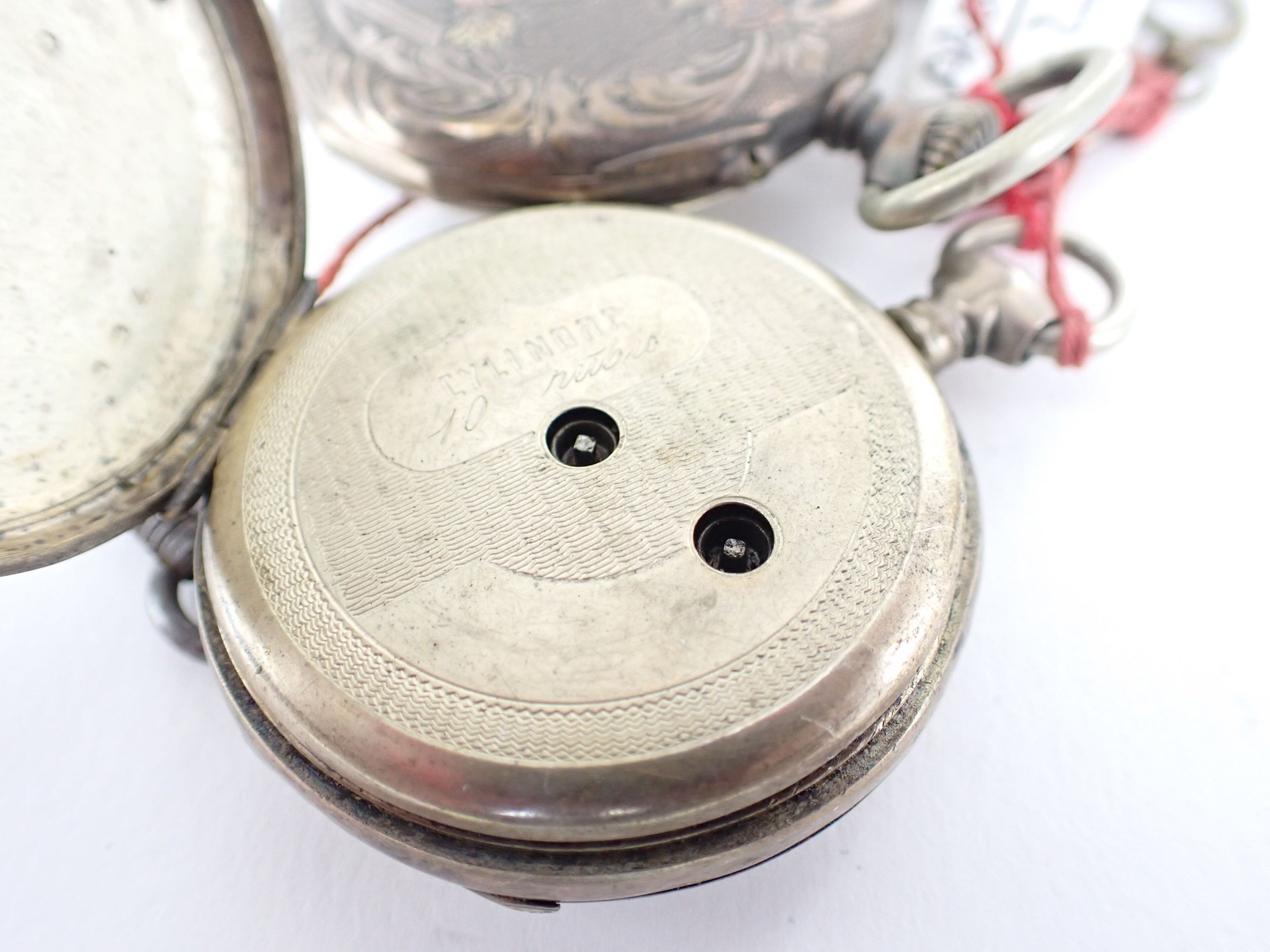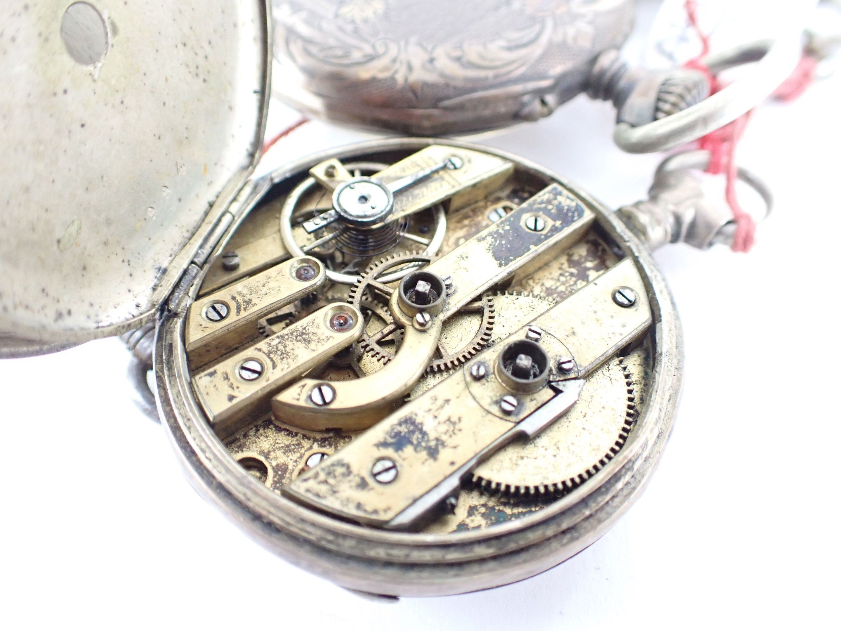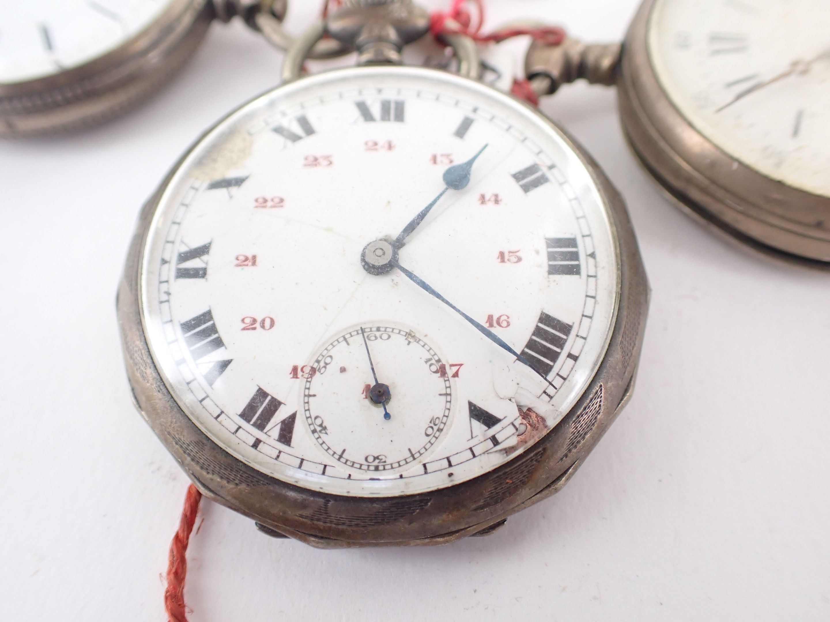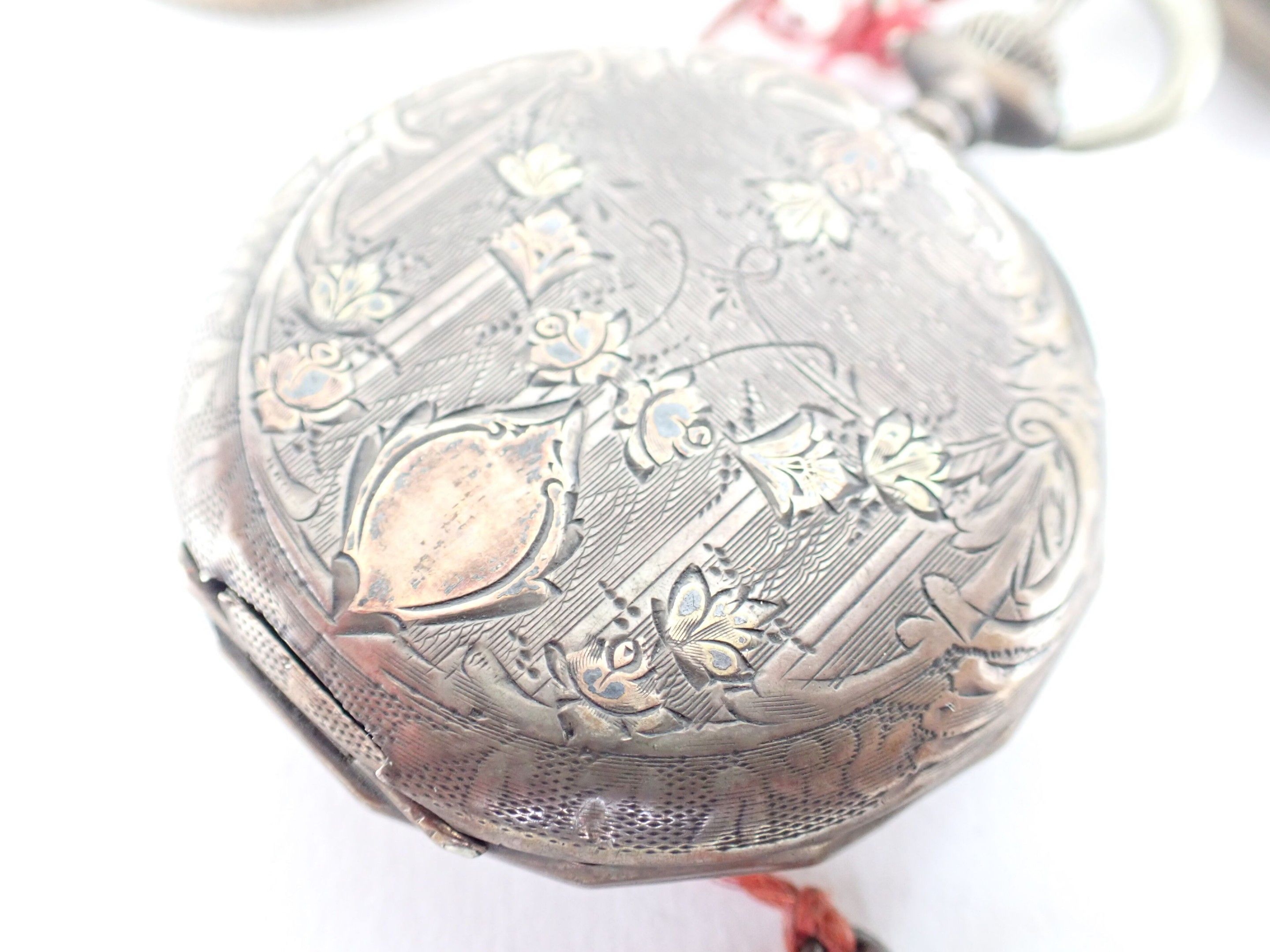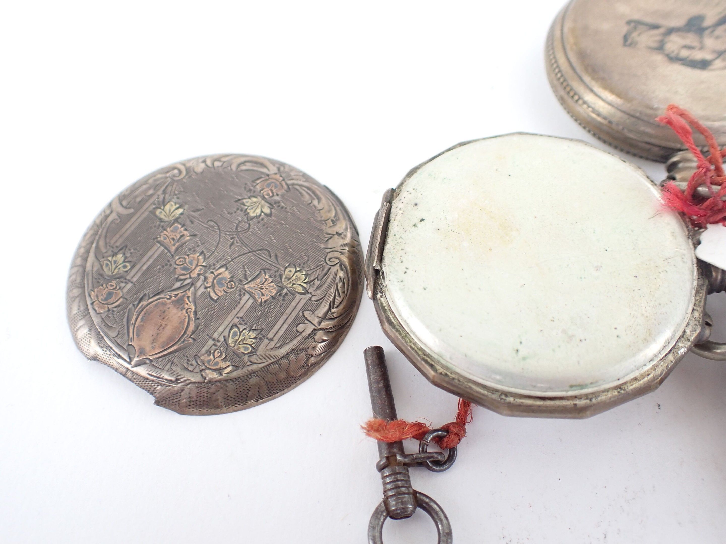 Three silver gousset watches circa 1900, cracked white enamelled dials, Roman numerals, engraved and guilloché backs, one with a dog's head decoration, with two winding keys. Gross weight: 203 g. Mechanism not tested, no guarantee of functioning.