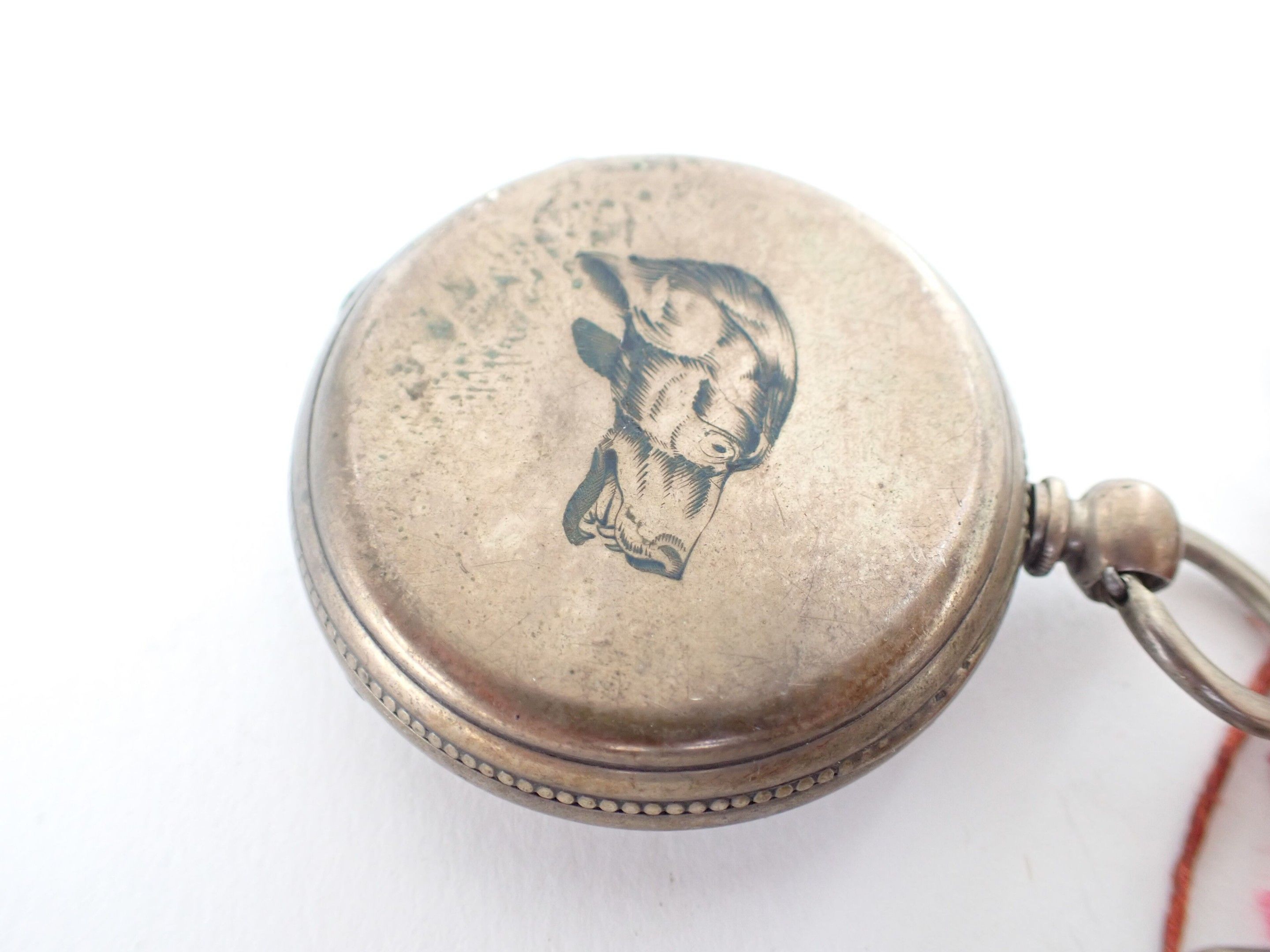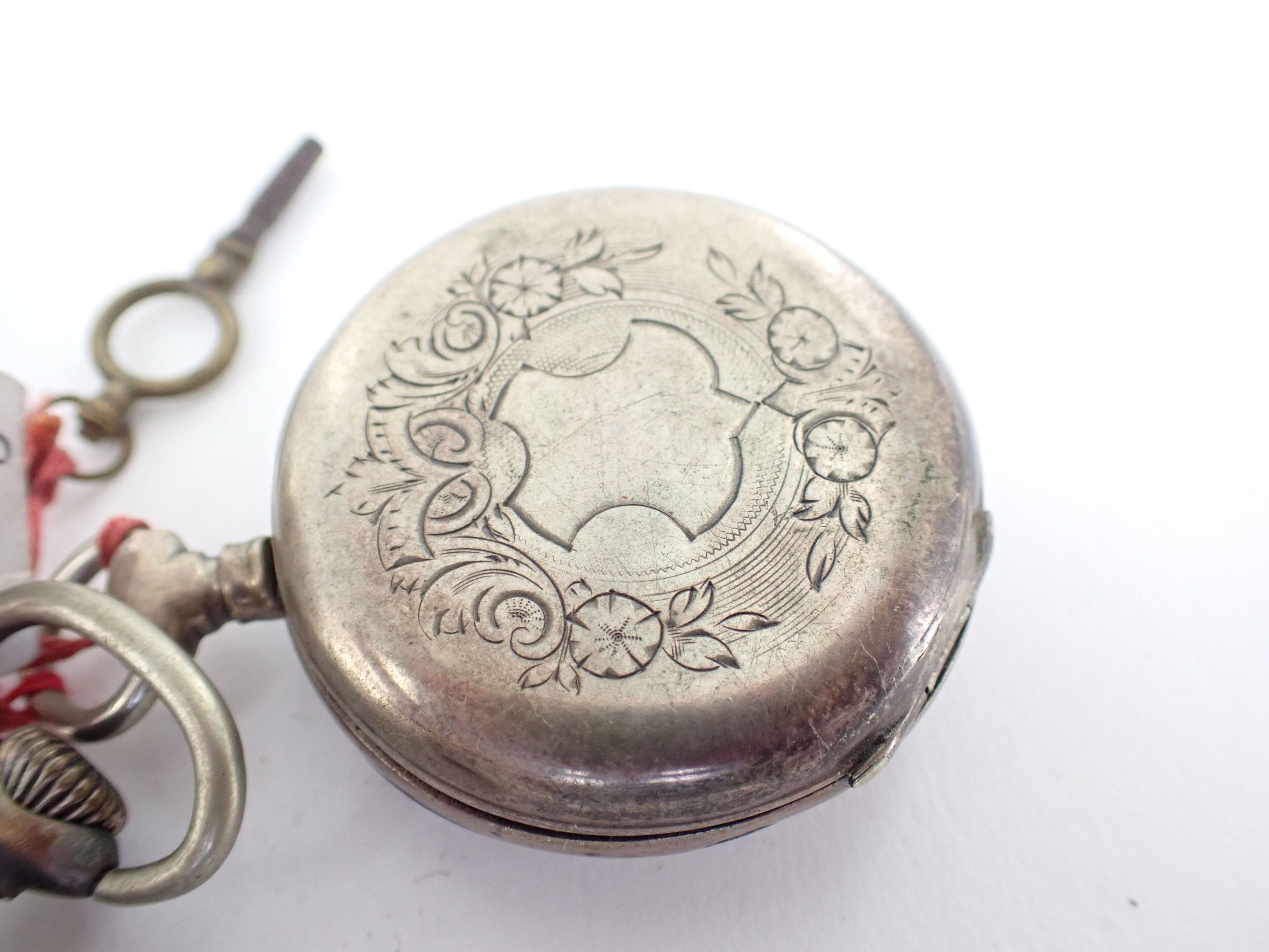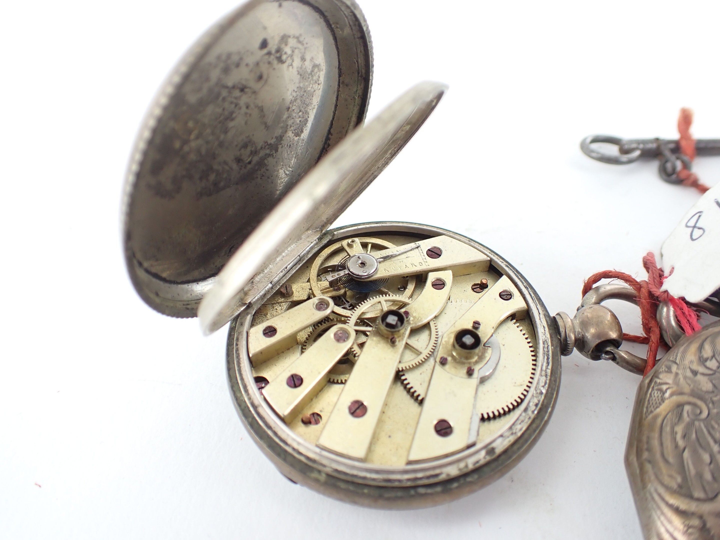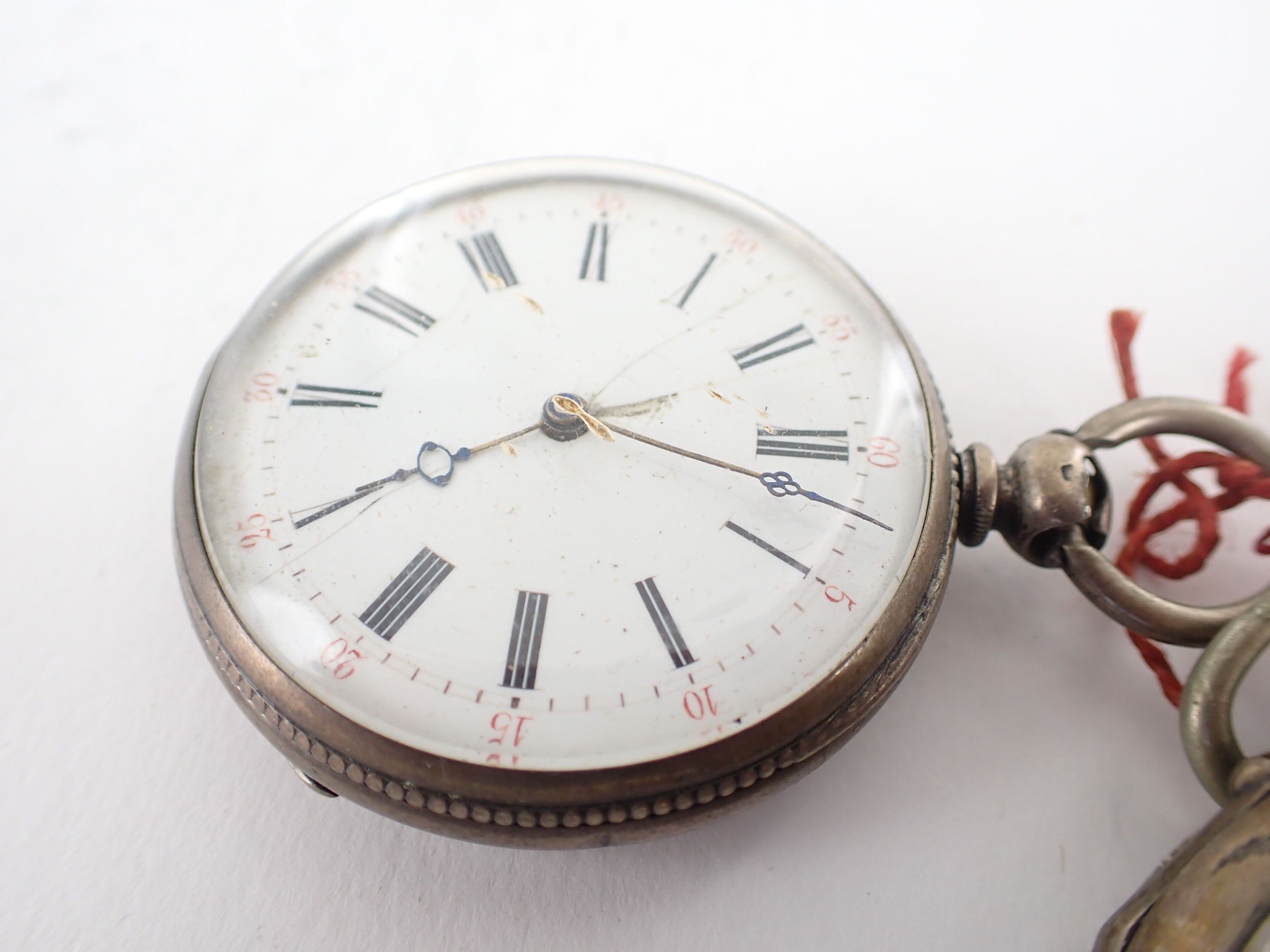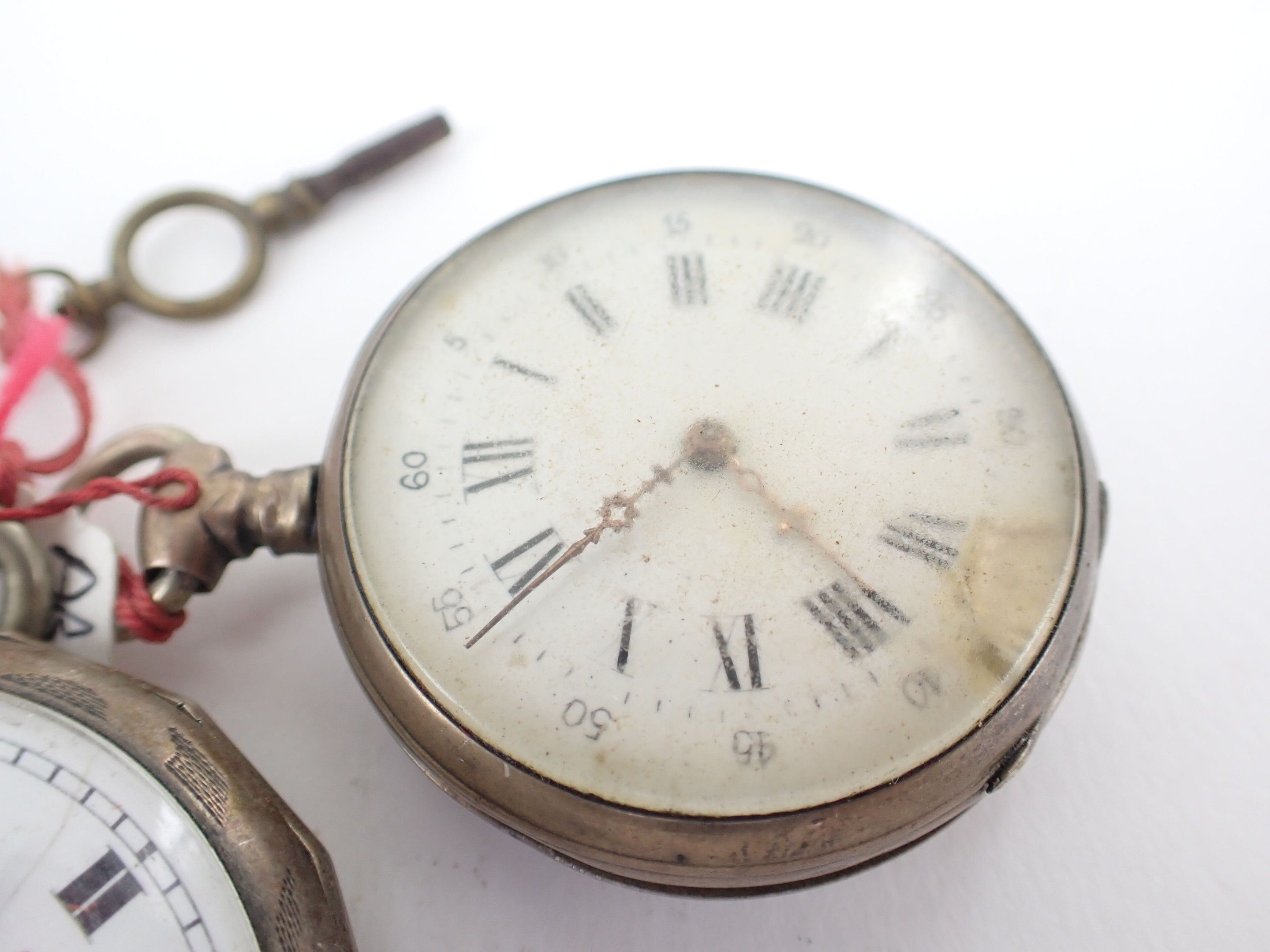Three silver gousset watches circa 1900, cracked white enamelled dials, Roman numerals, engraved and guilloché backs, one with a dog's head decoration, with two winding keys. Gross weight: 203 g. Mechanism not tested, no guarantee of functioning.