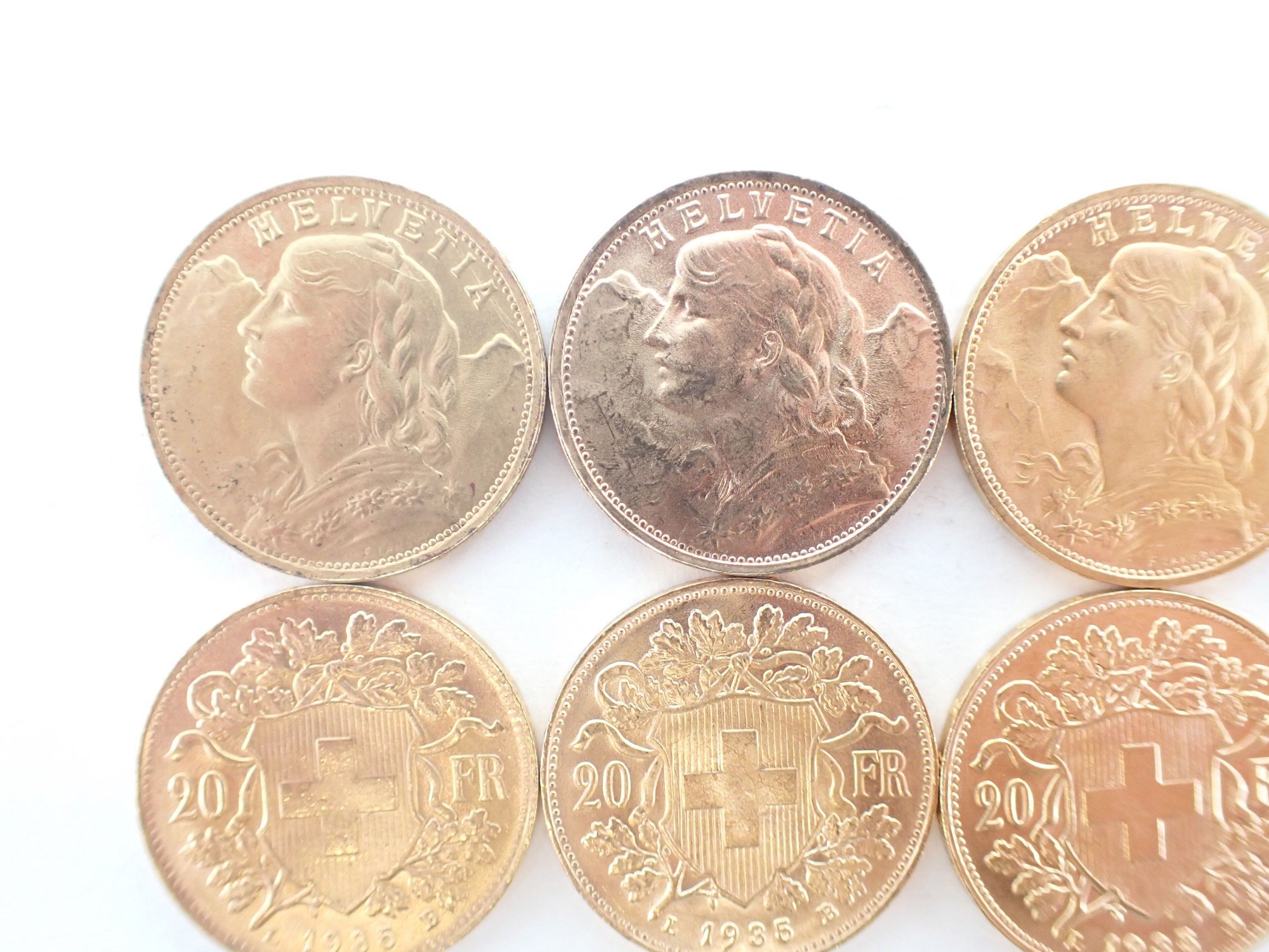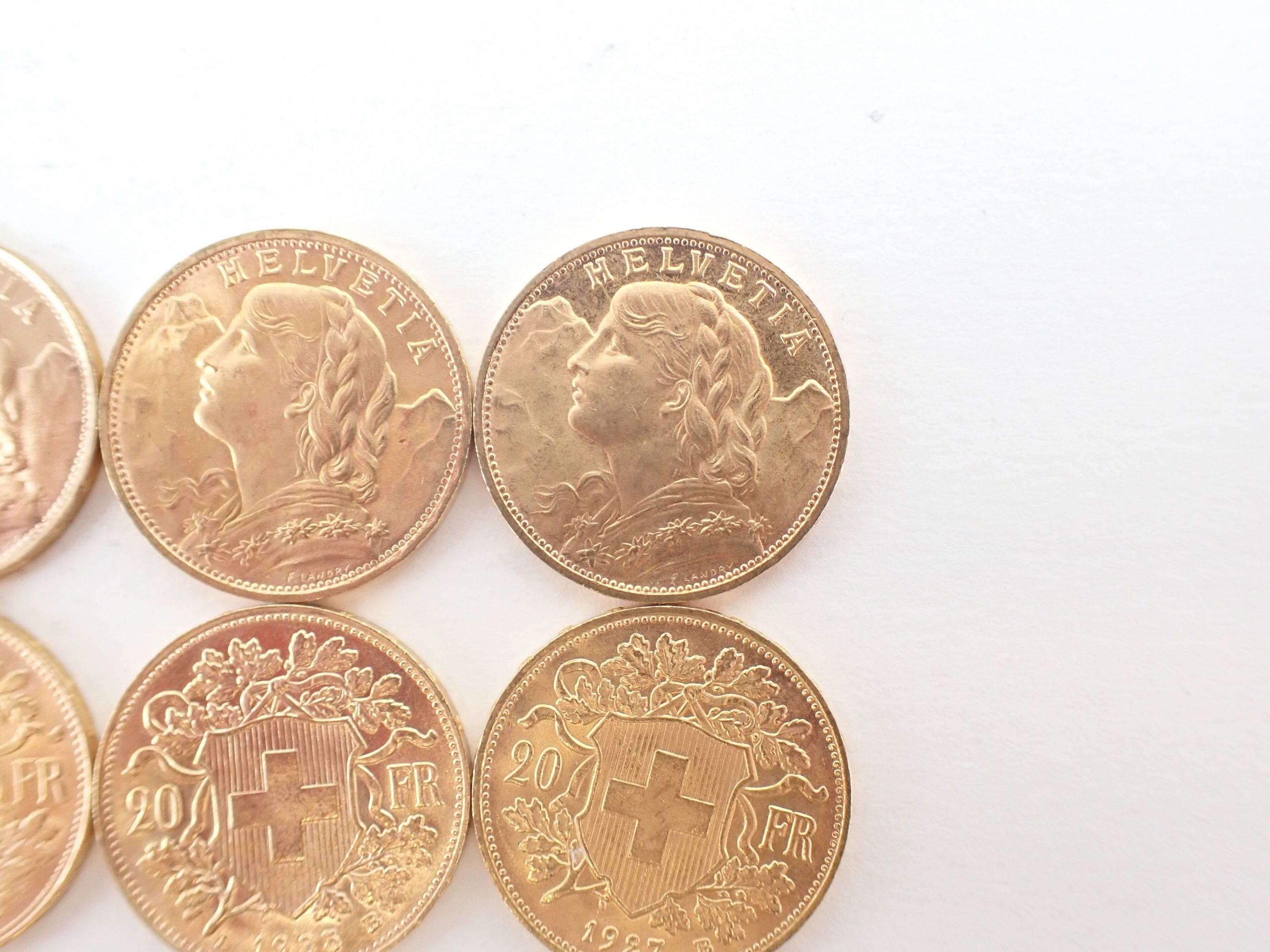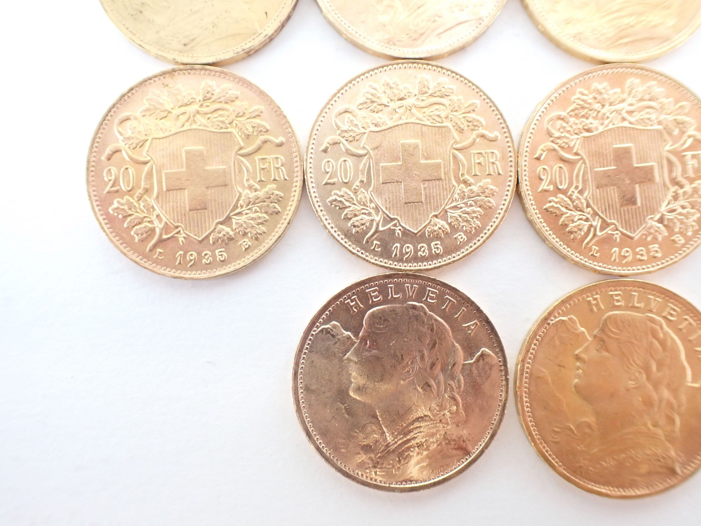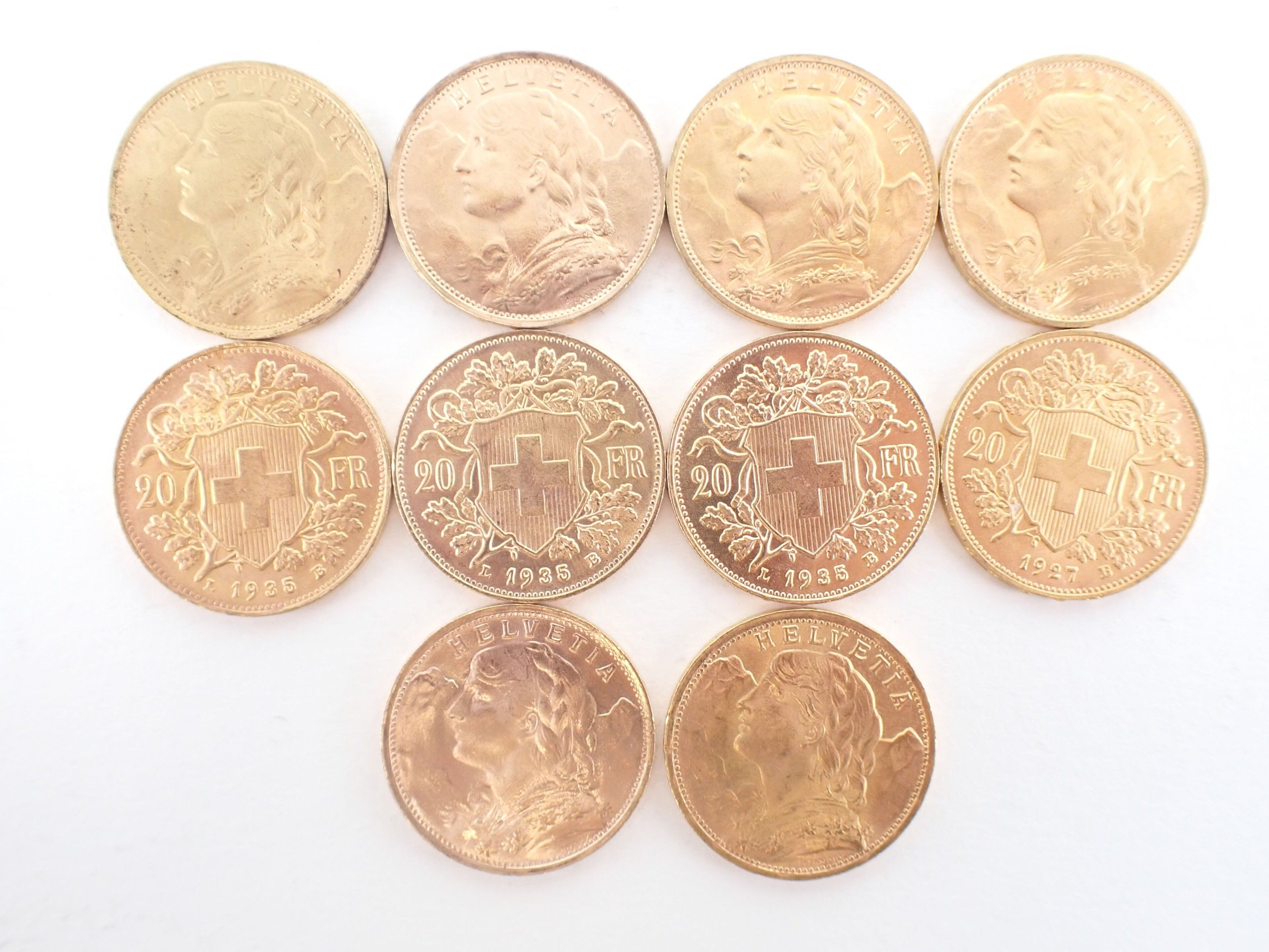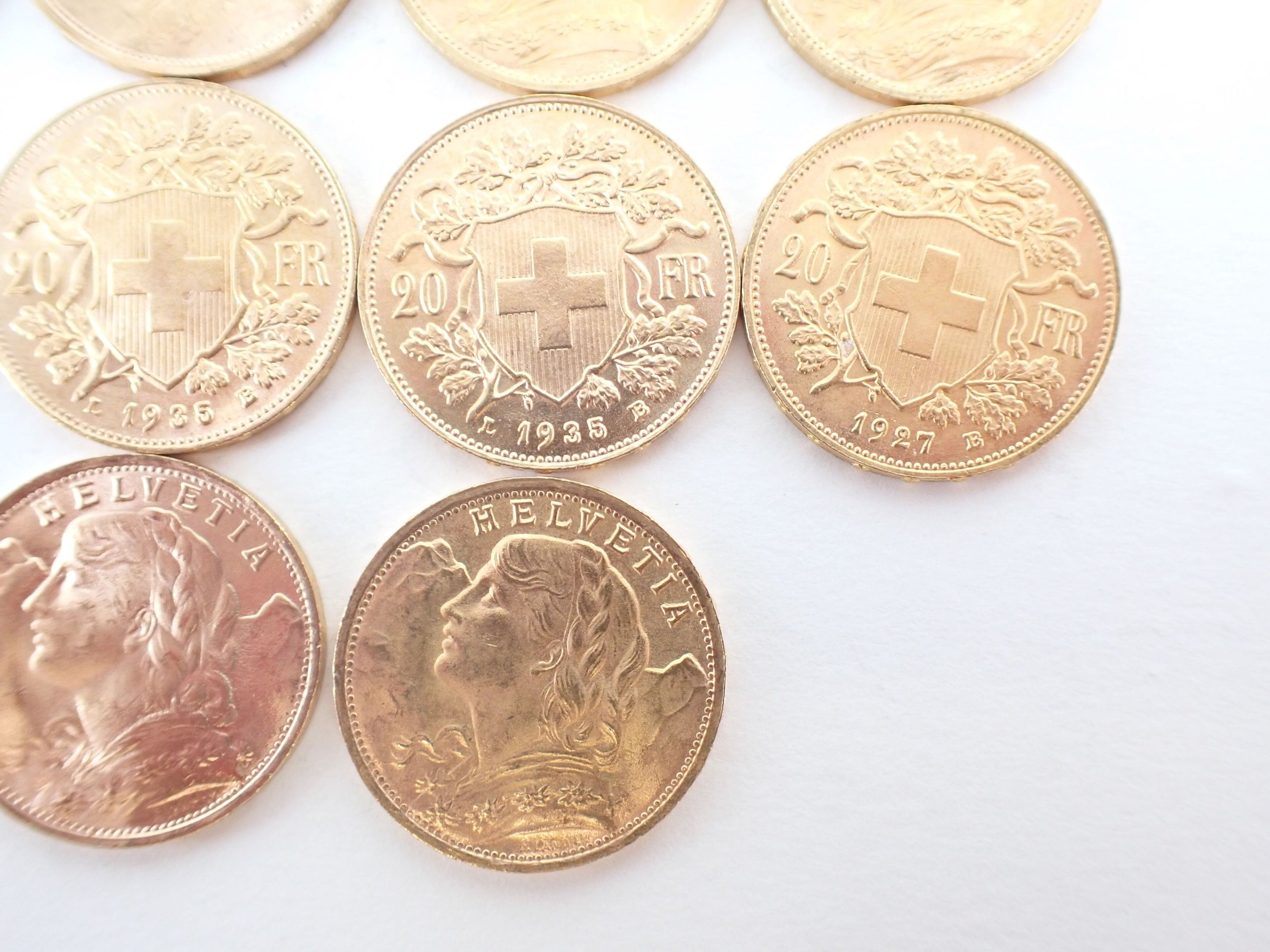 10 Swiss 20 franc gold coins Helvetia - Weight: 64.