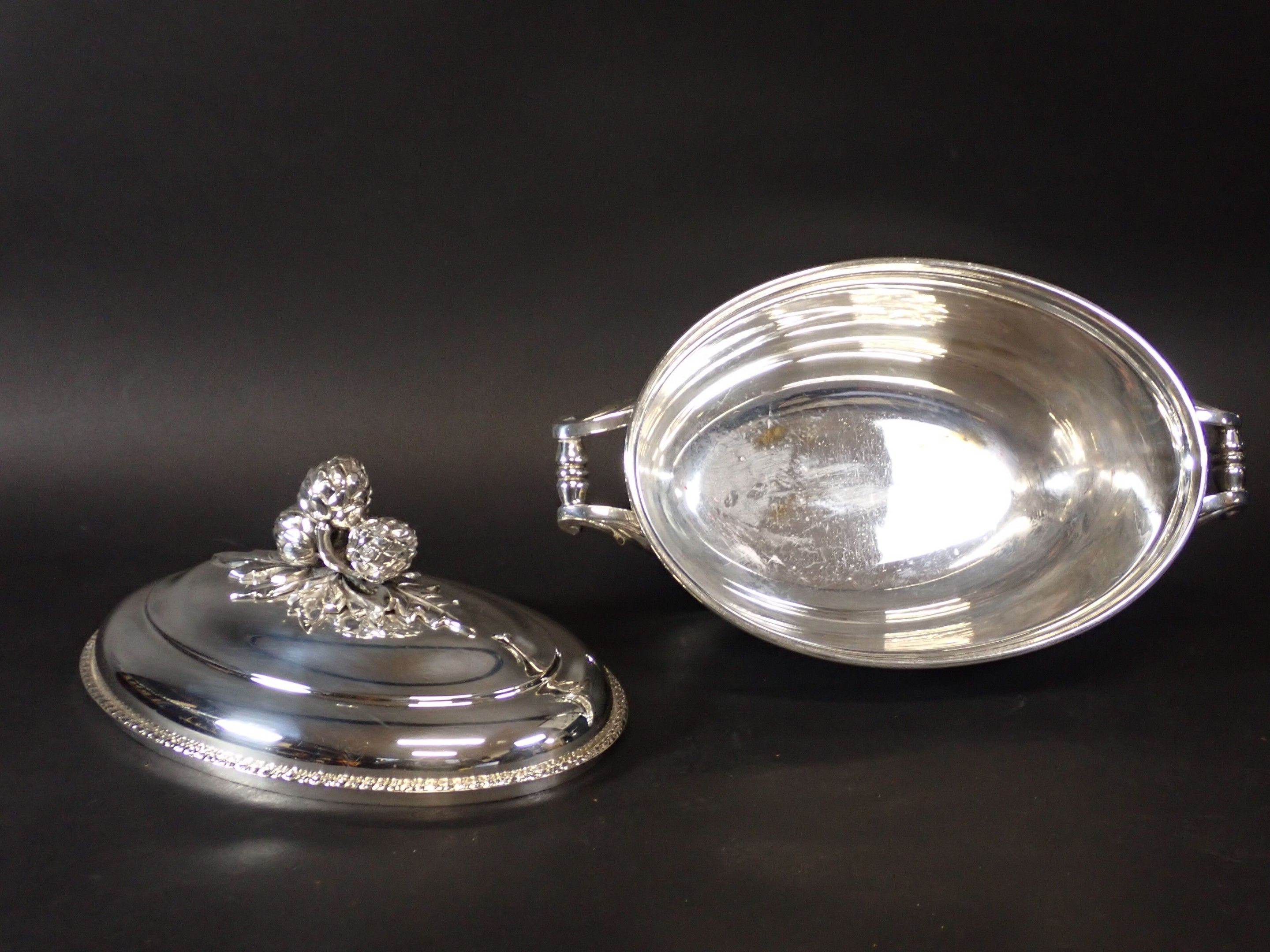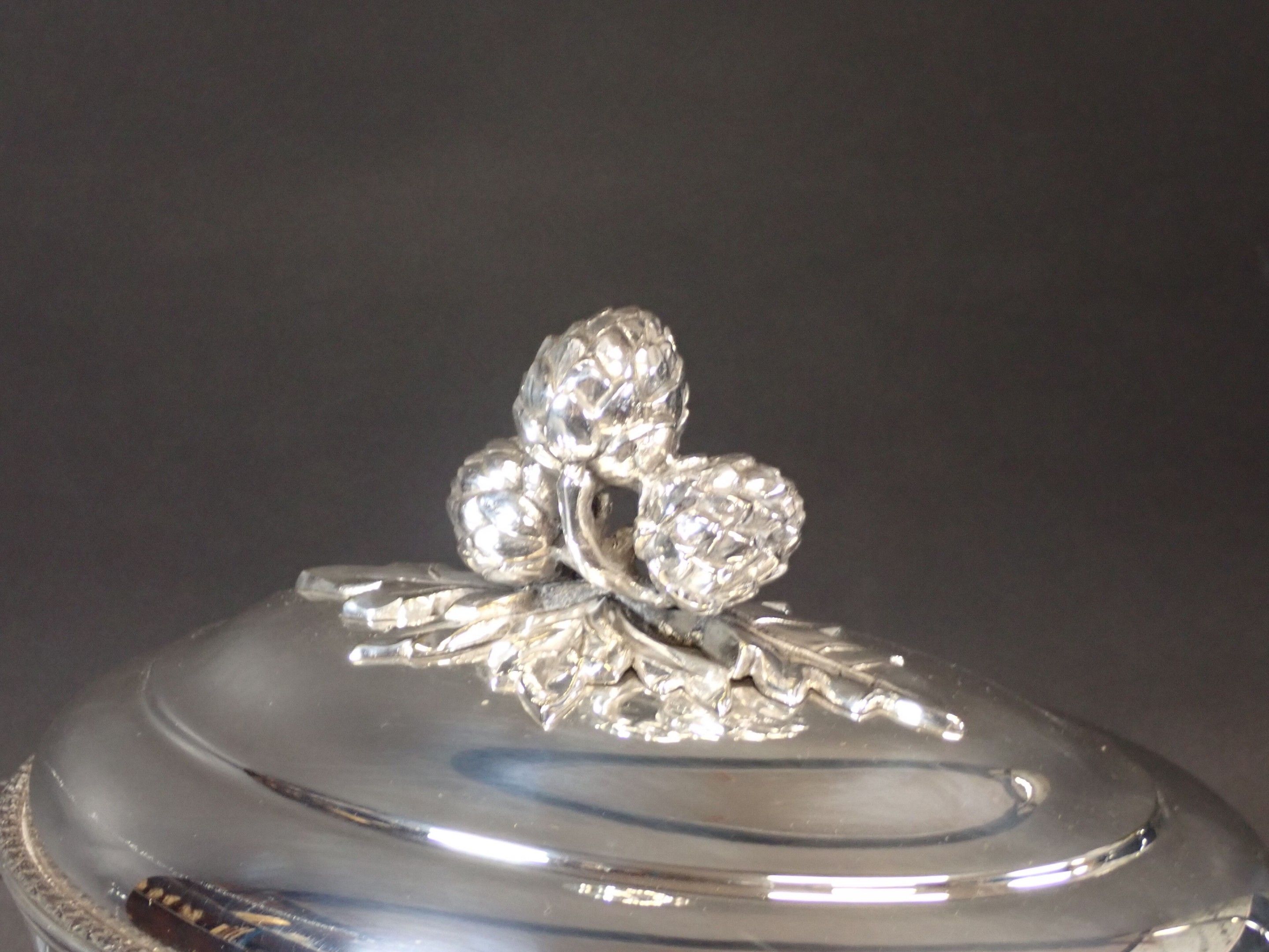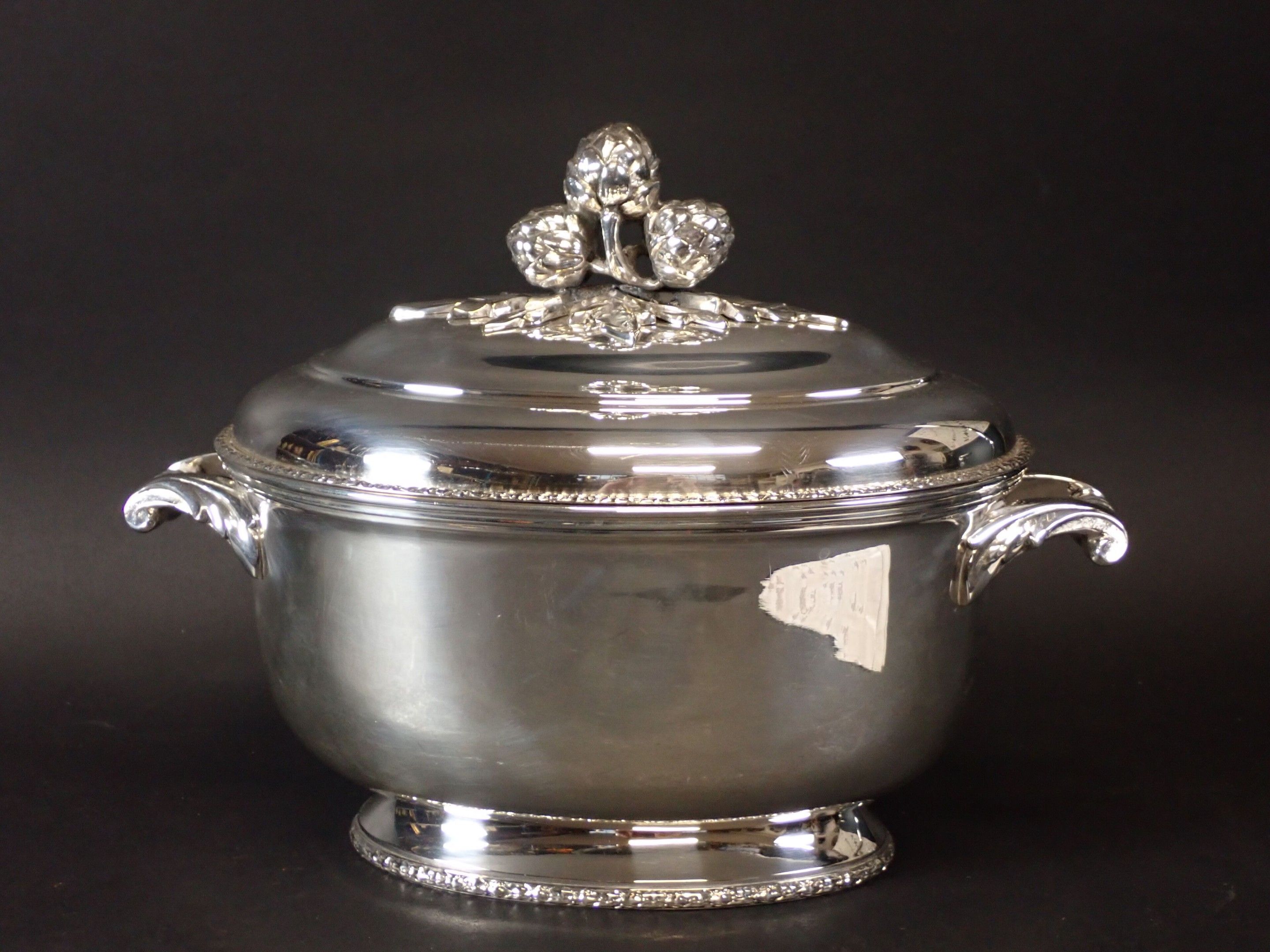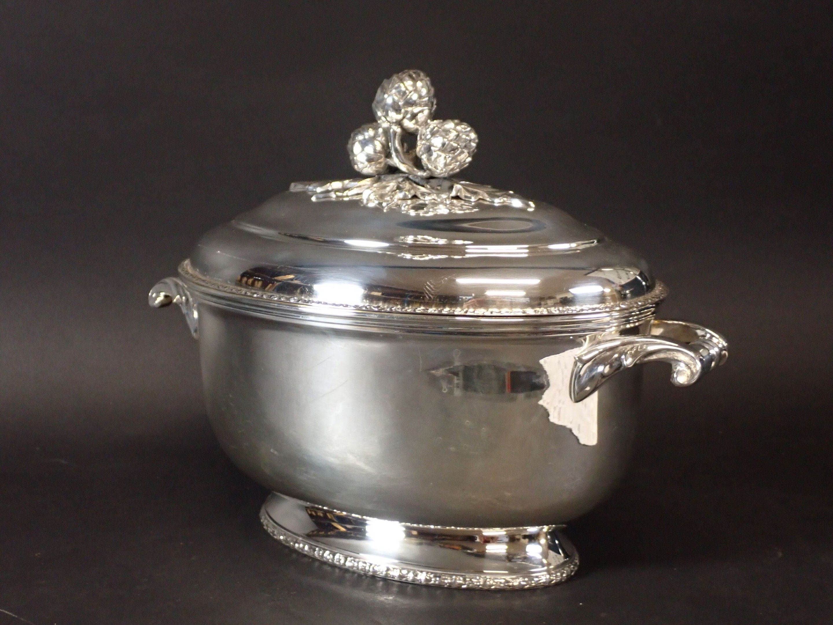 PLASAIT Goldsmith. Oval soup tureen in silver-plated metal, the lid decorated with three artichokes, two side handles decorated with acanthus leaves, floral friezes, foot. Height: 28 cm - length: 36 cm (slight scratches)