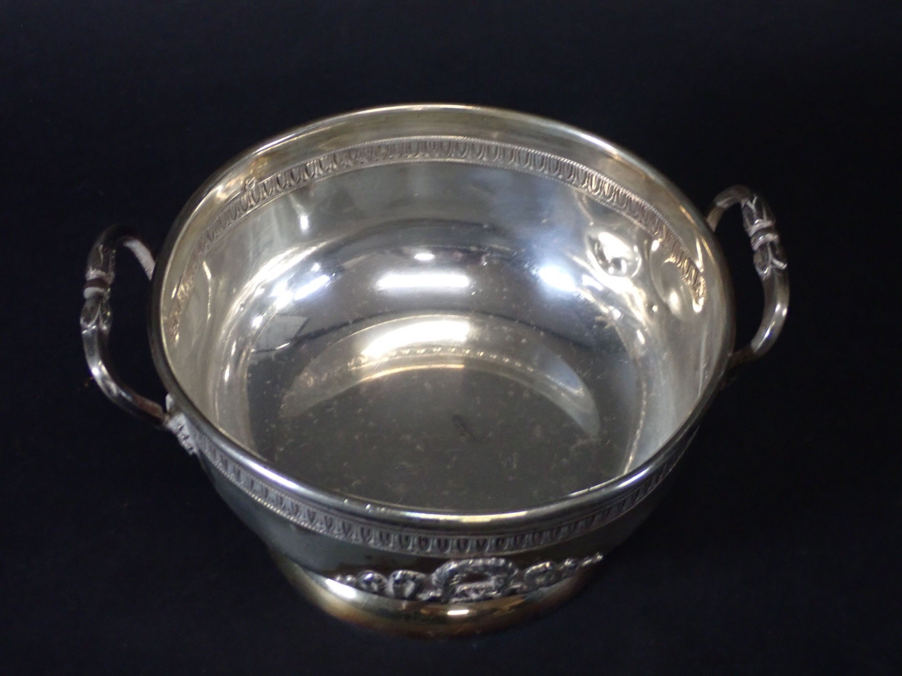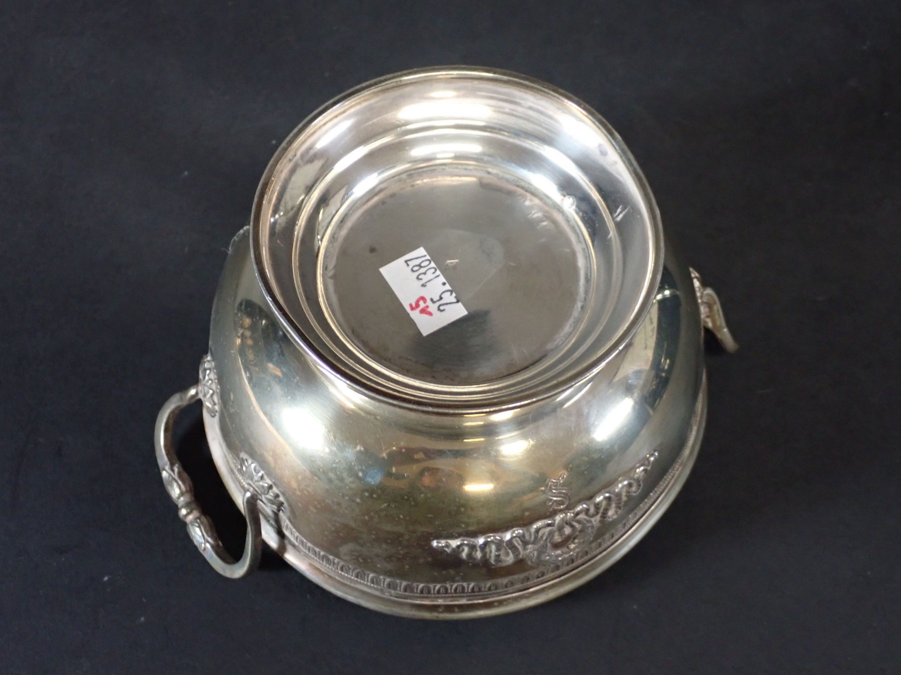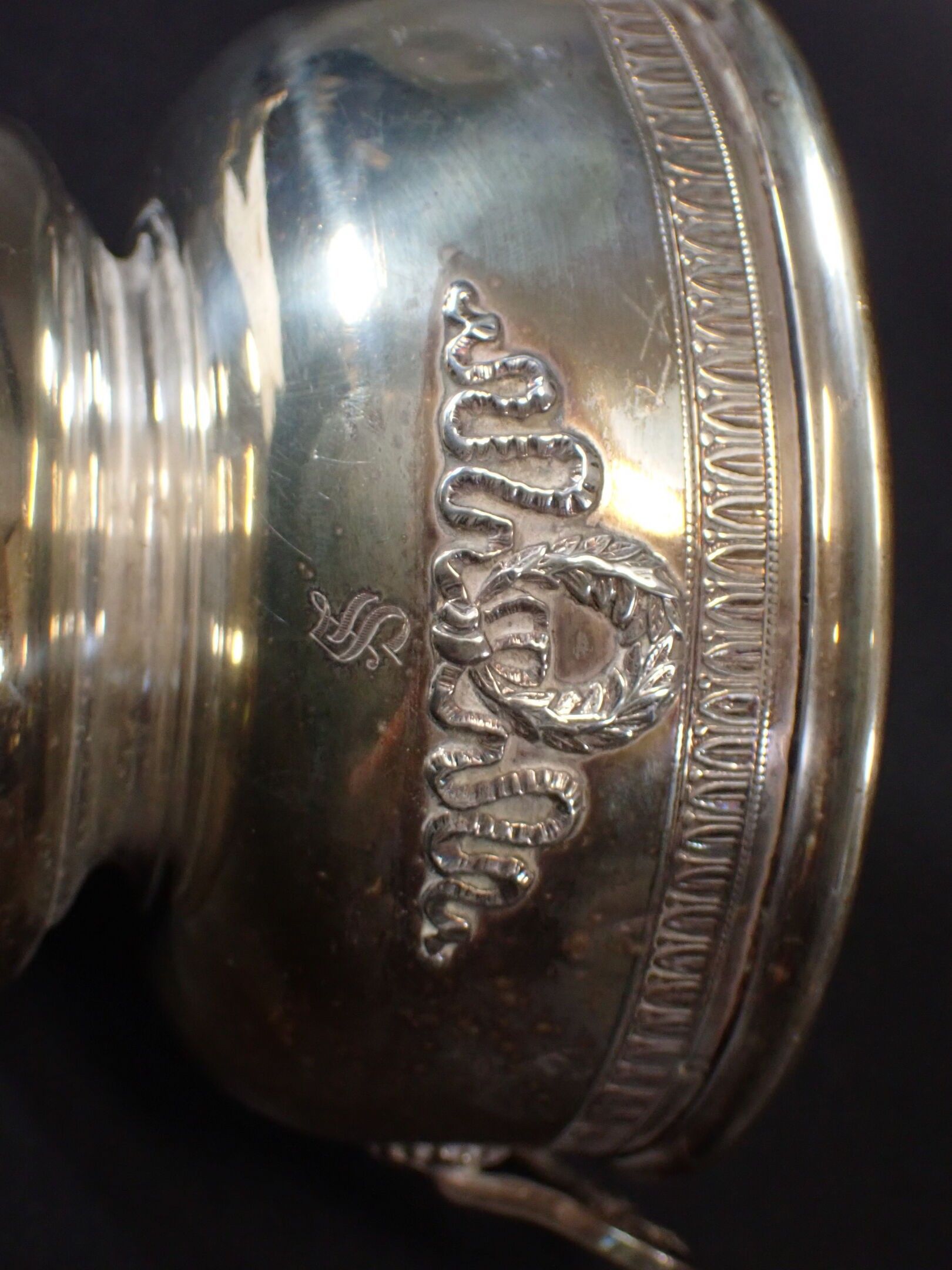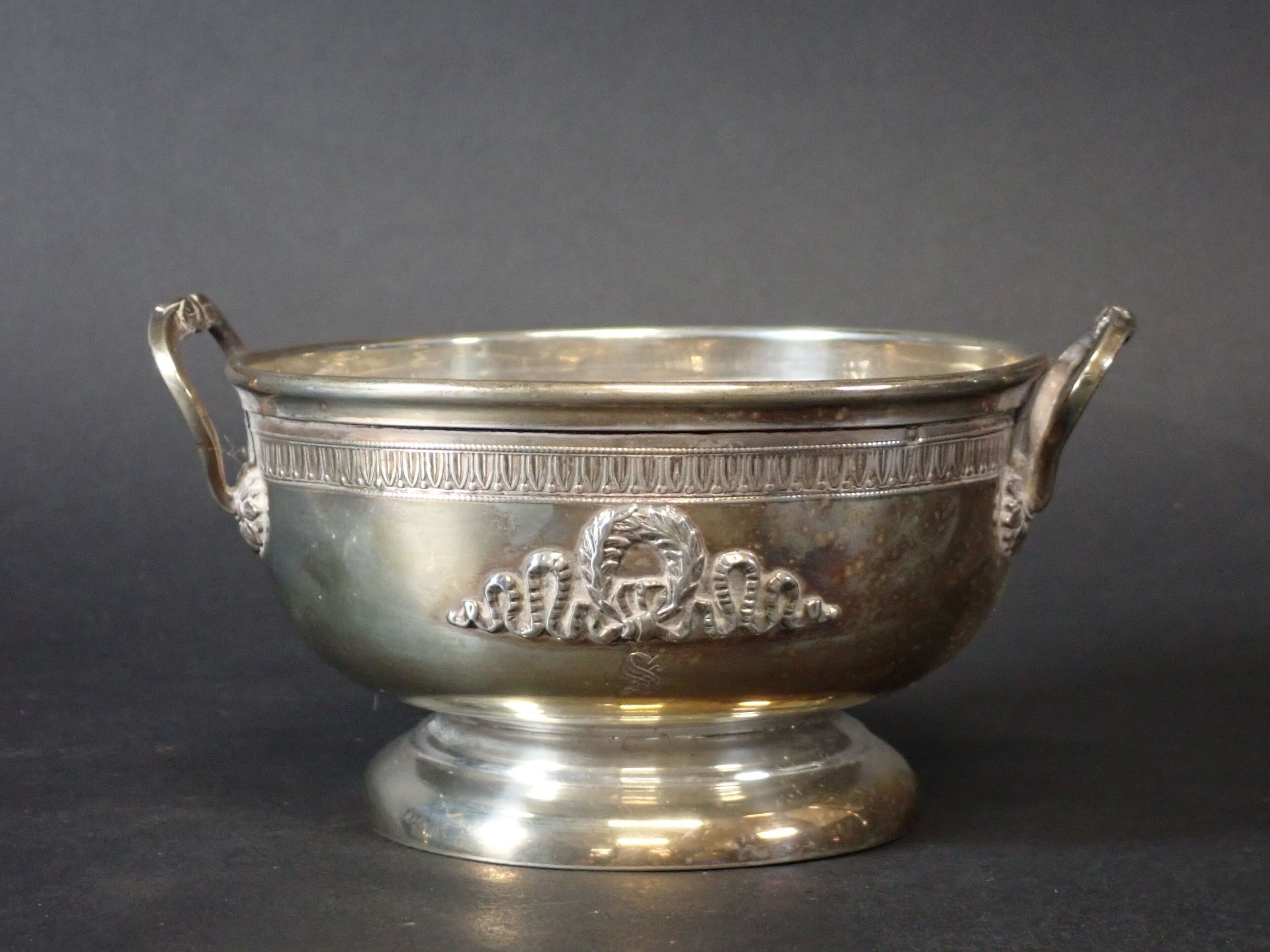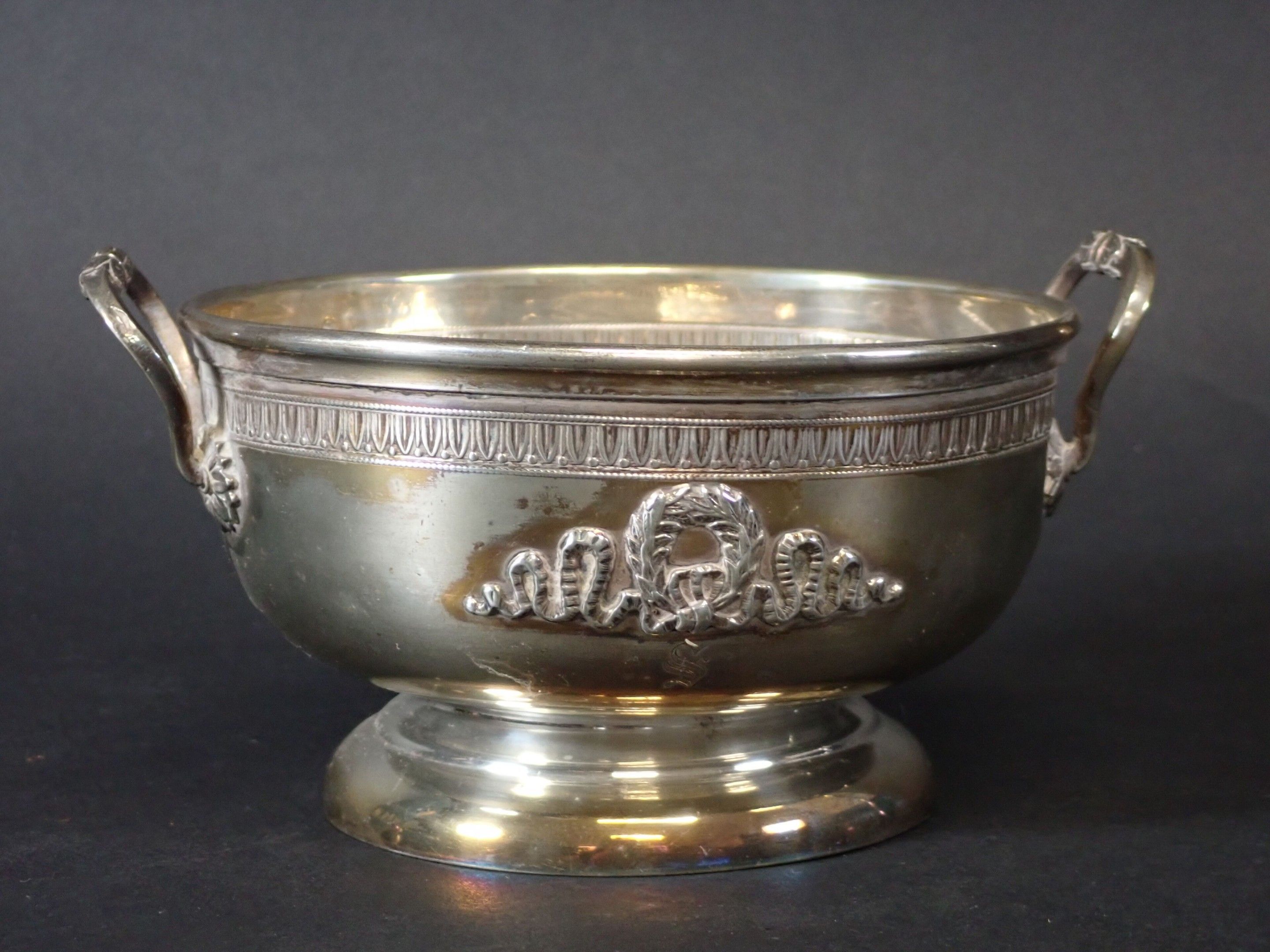 Small Empire-style solid silver 800/1000th finger bowl on a pedestal, with two side handles and a frieze of ovals, the body decorated on both sides in relief with a laurel wreath and a knotted ribbon, engraved with the numeral *S*, net weight 212 g, height 7 cm, width 15 cm.