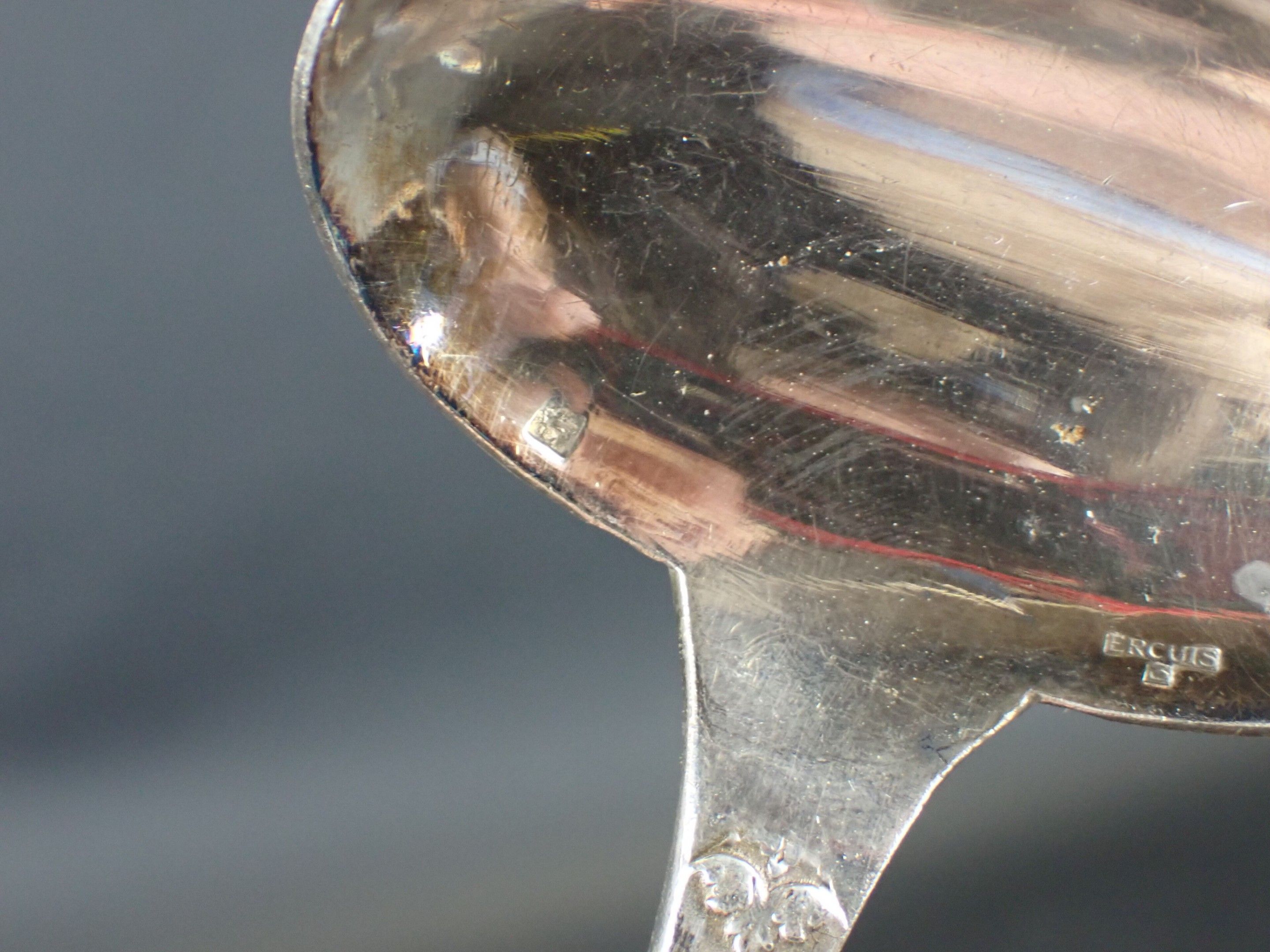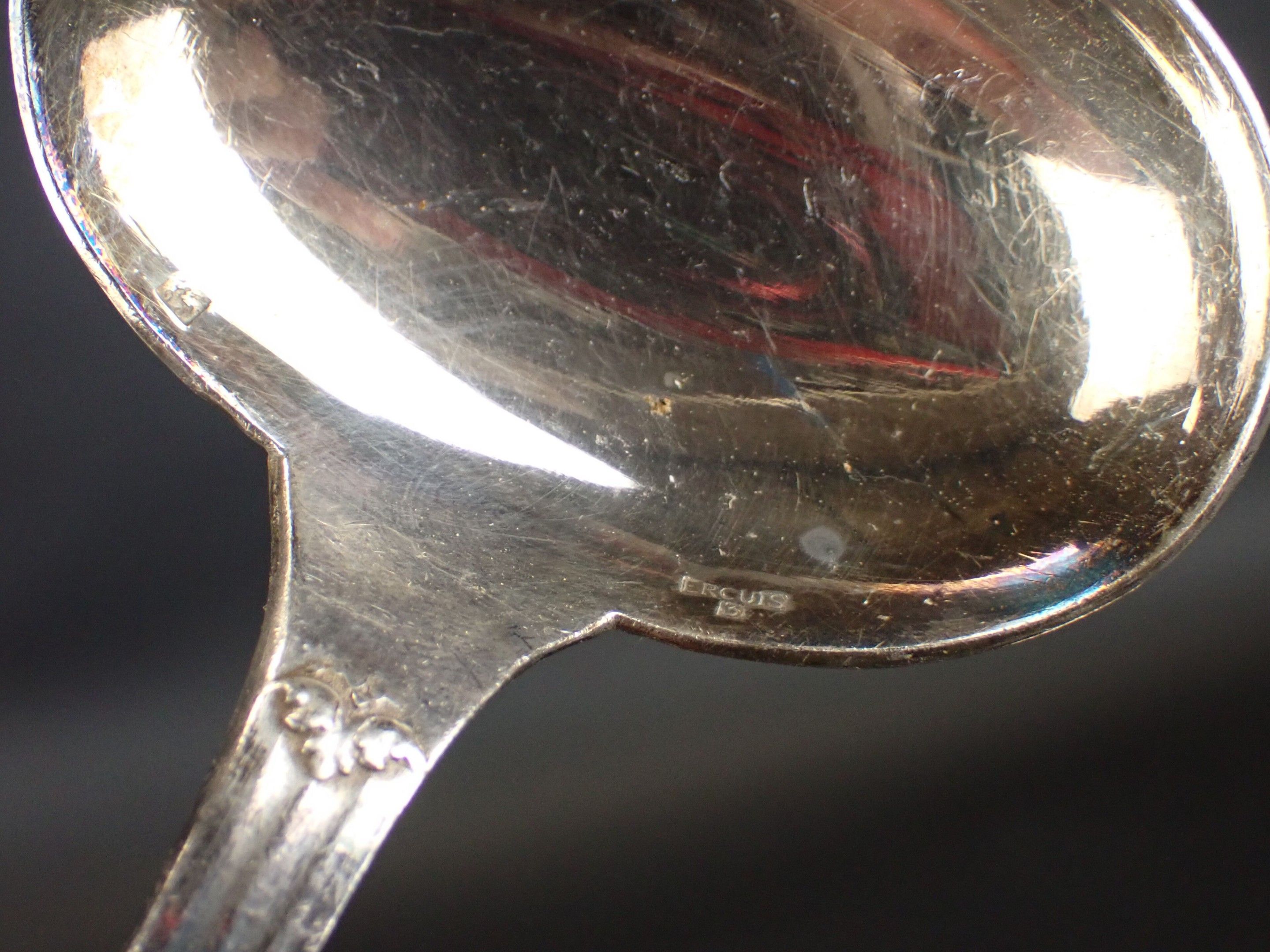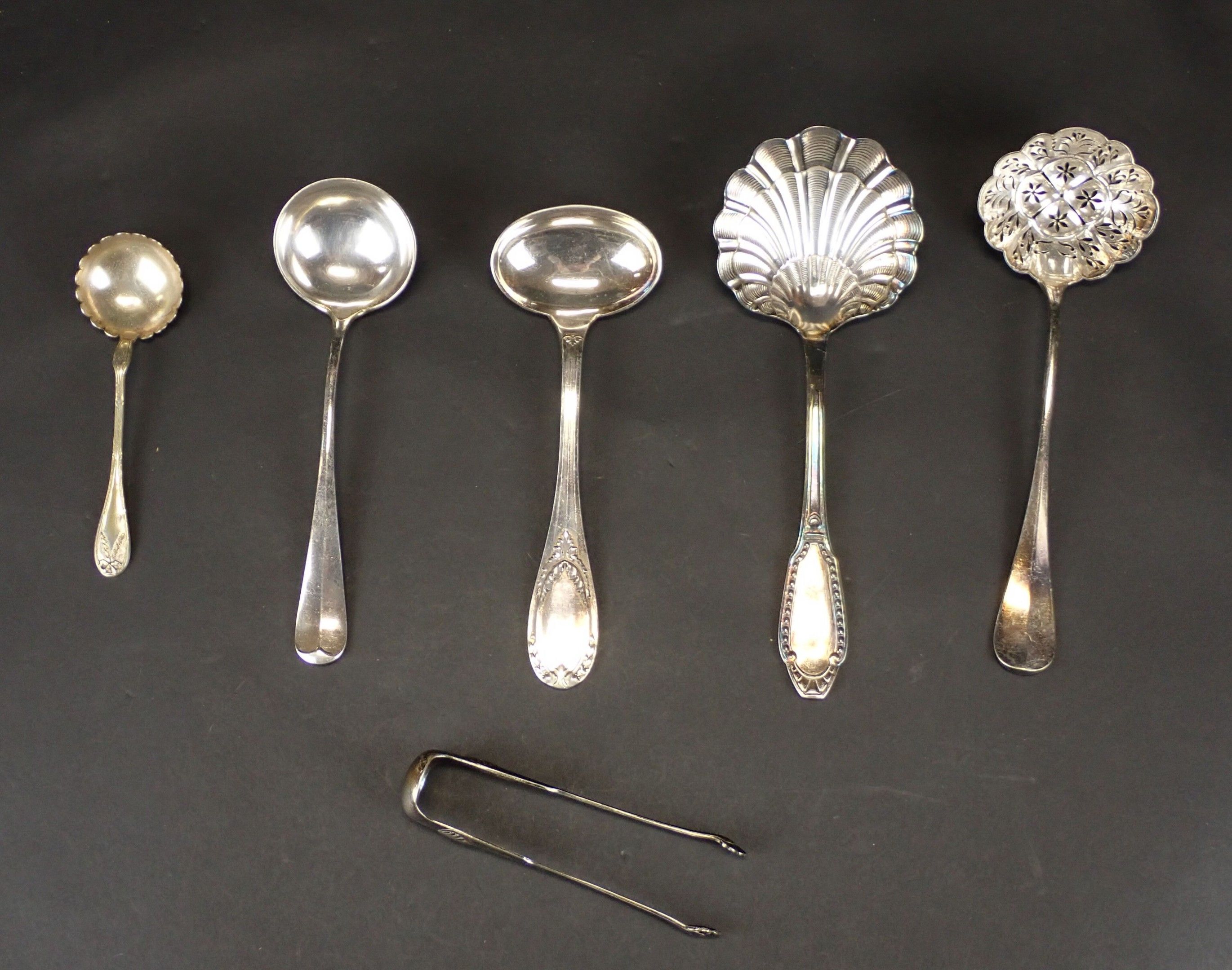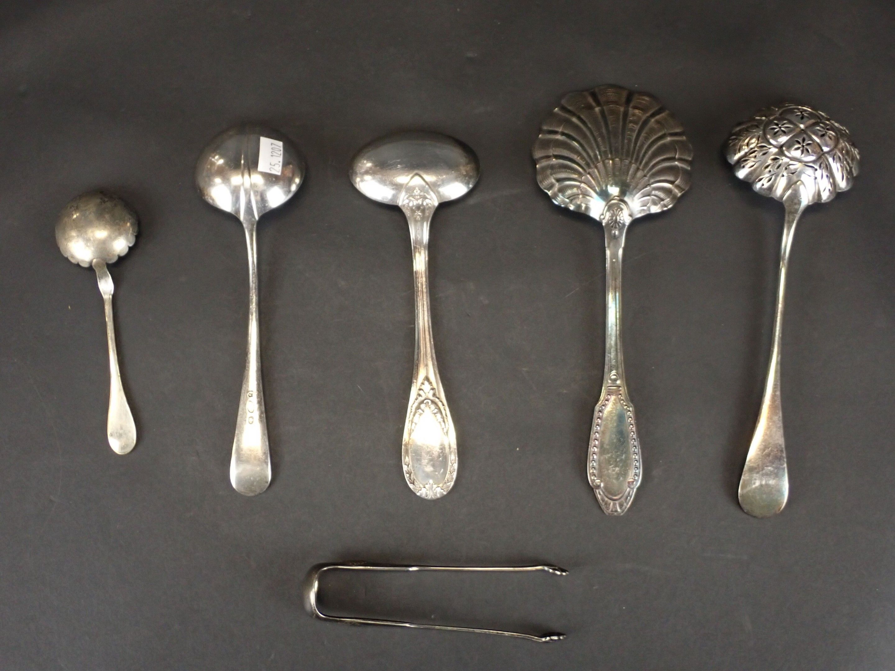 including various ladles and sauce spoons, one of which is marked Ercuis. A pair of sugar tongs in silver 800, Minerve hallmark, net weight: 40 g.