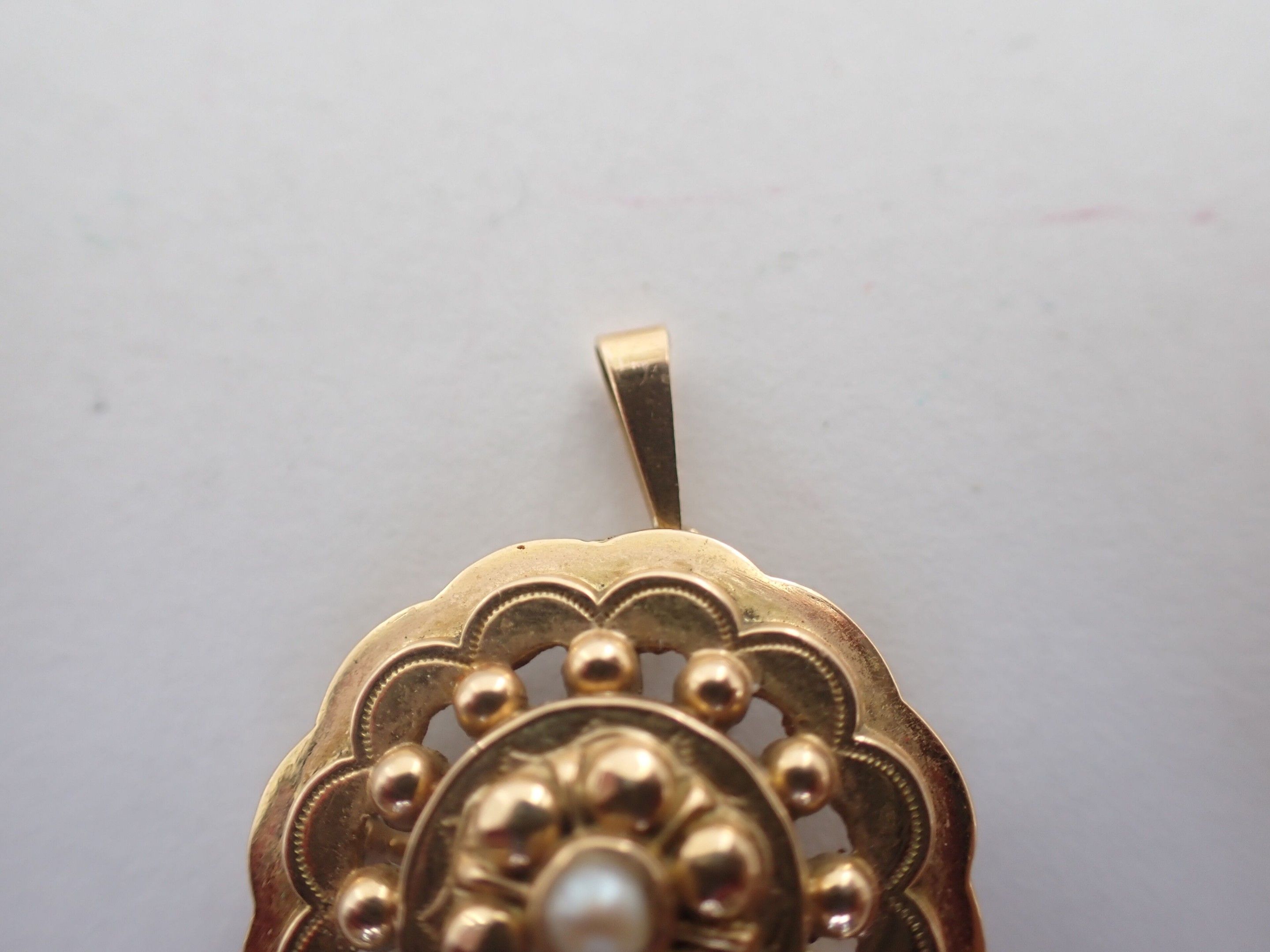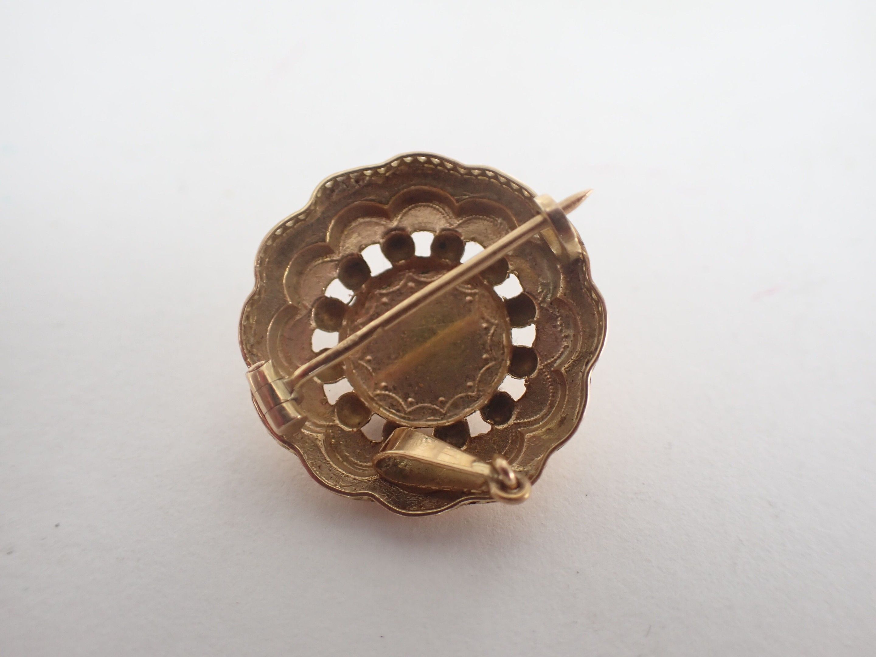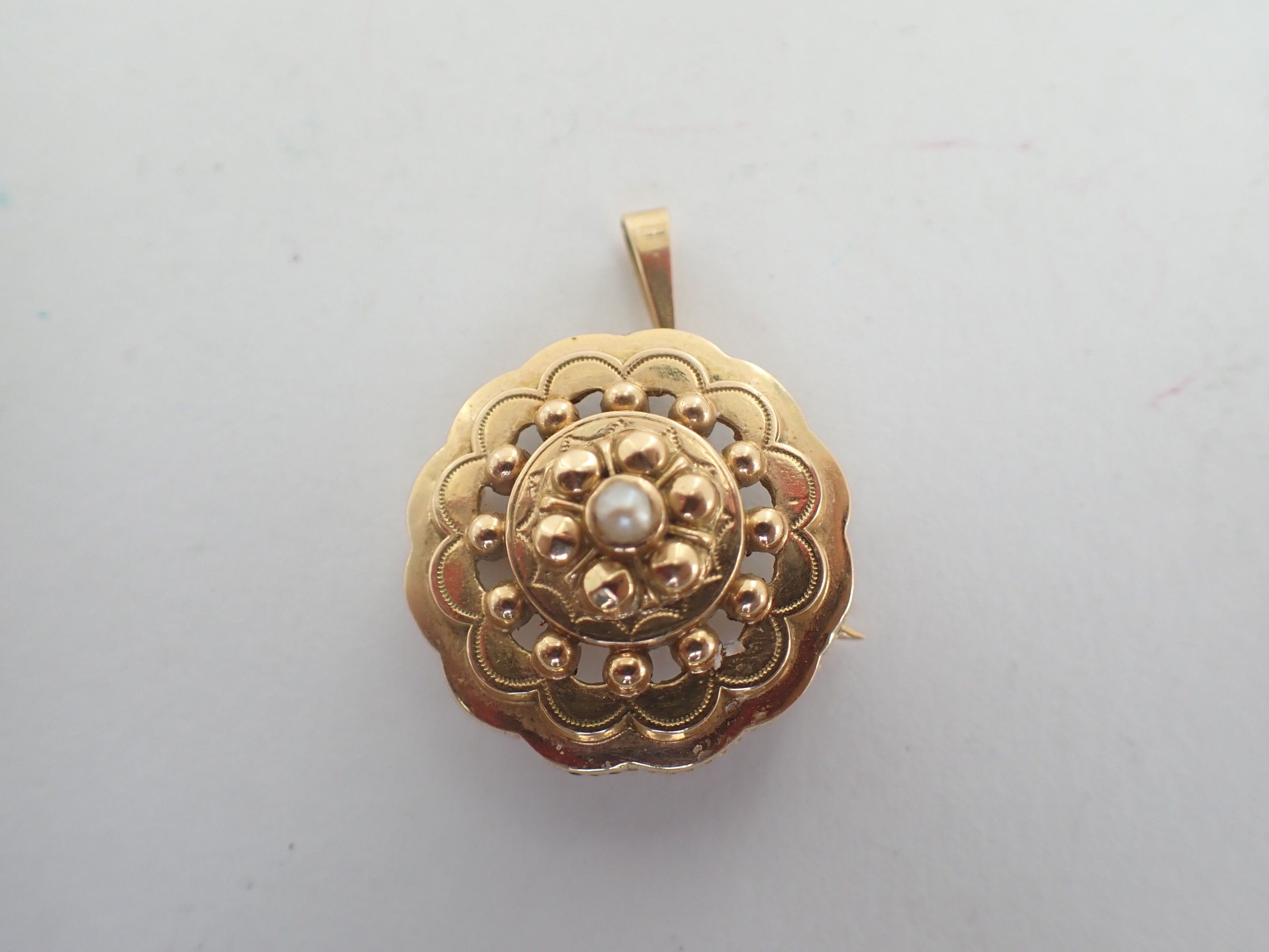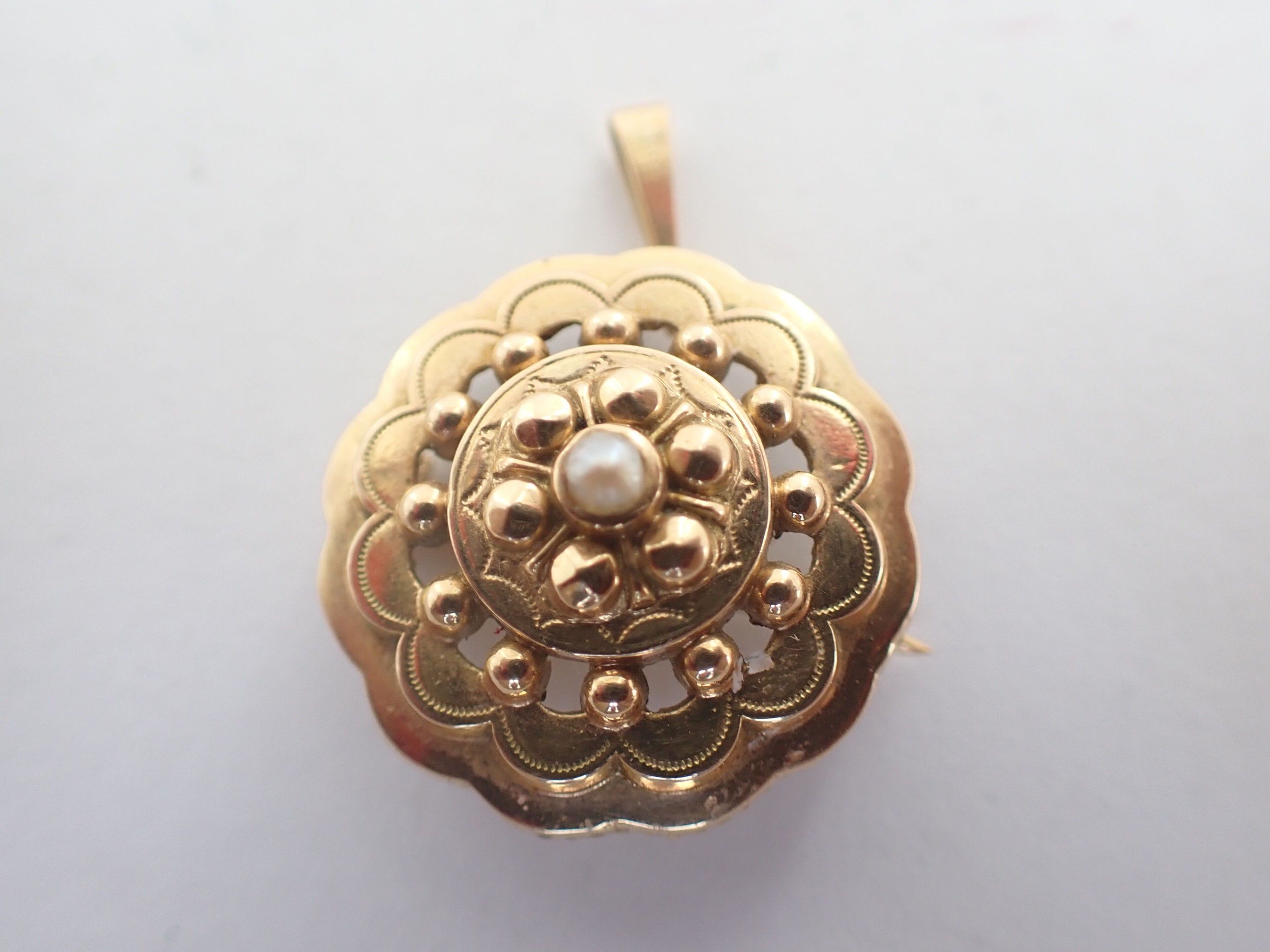 18 carat yellow gold round brooch pendant, late 19th century, decorated with grenetis and a cultured pearl. Diameter: 26 mm. Net weight: 4.3 g.