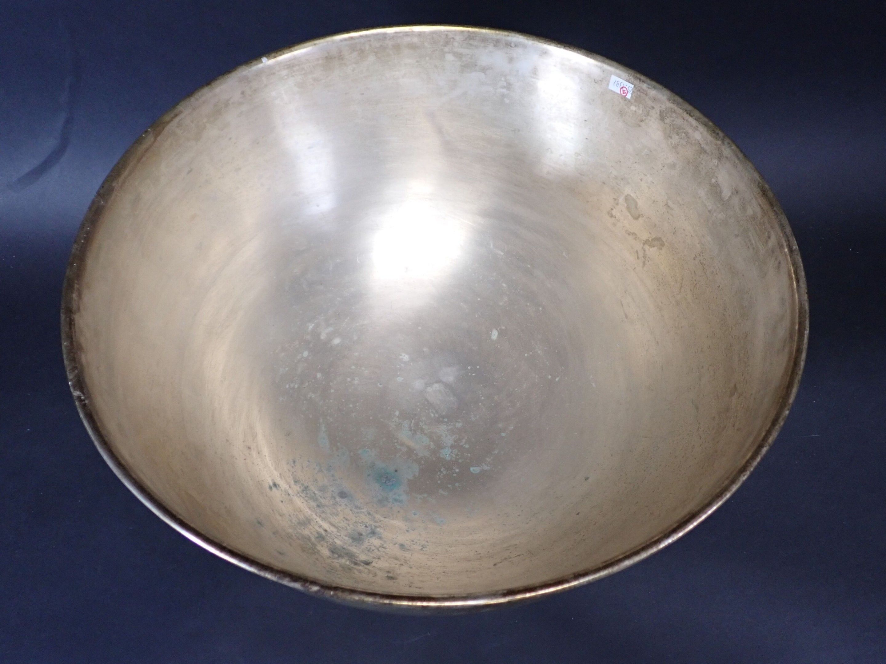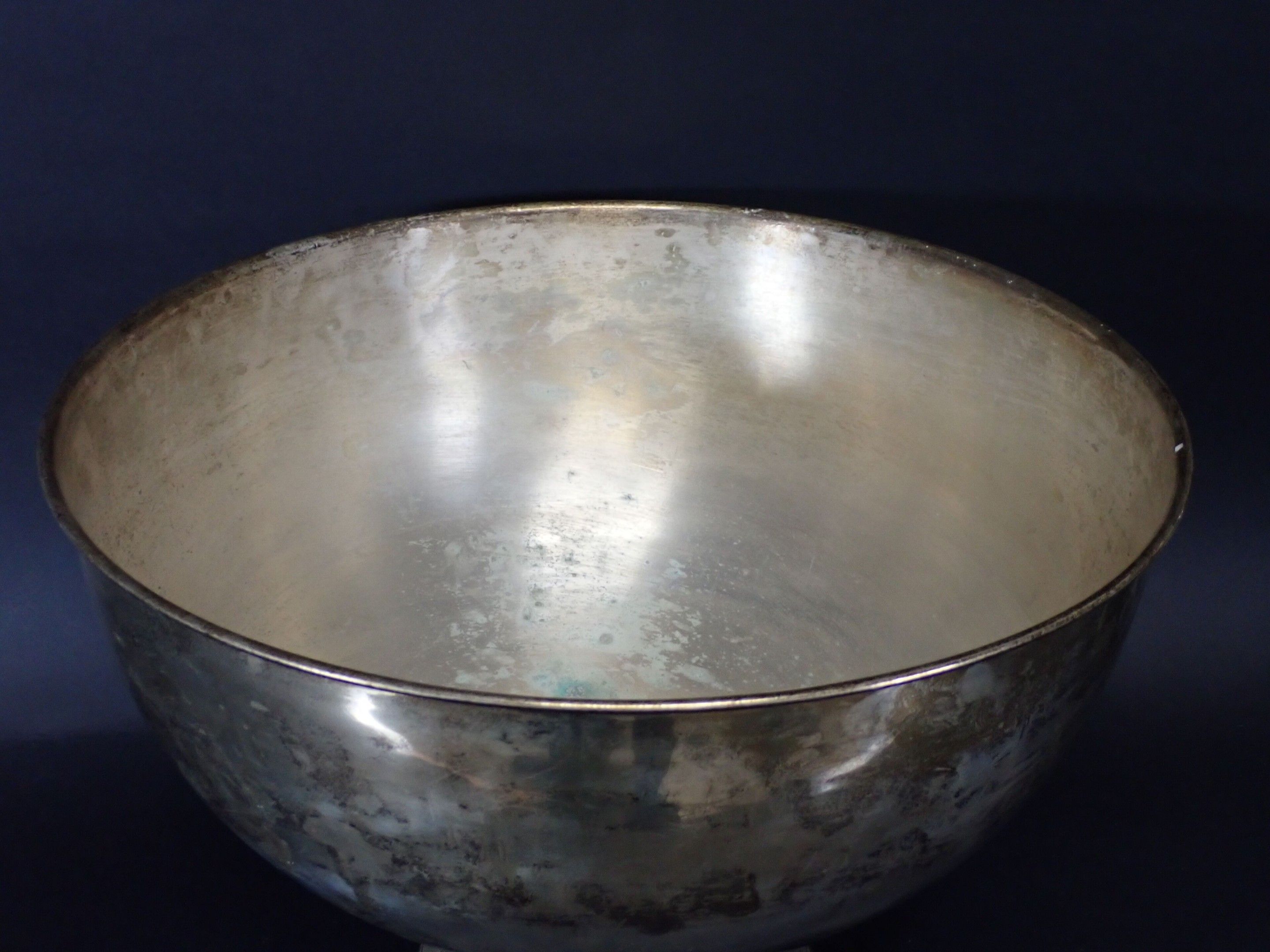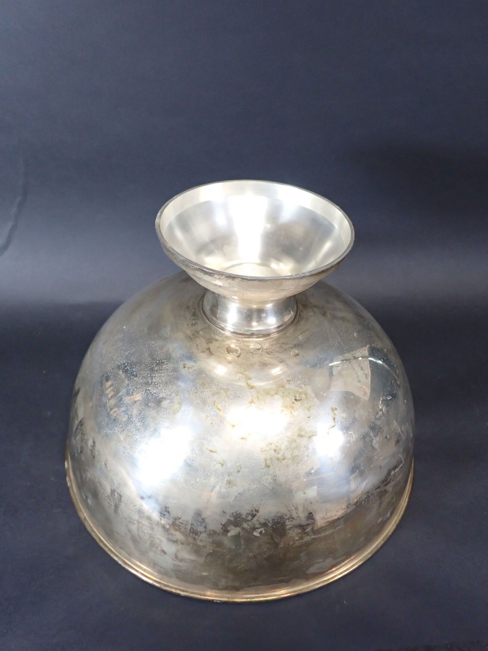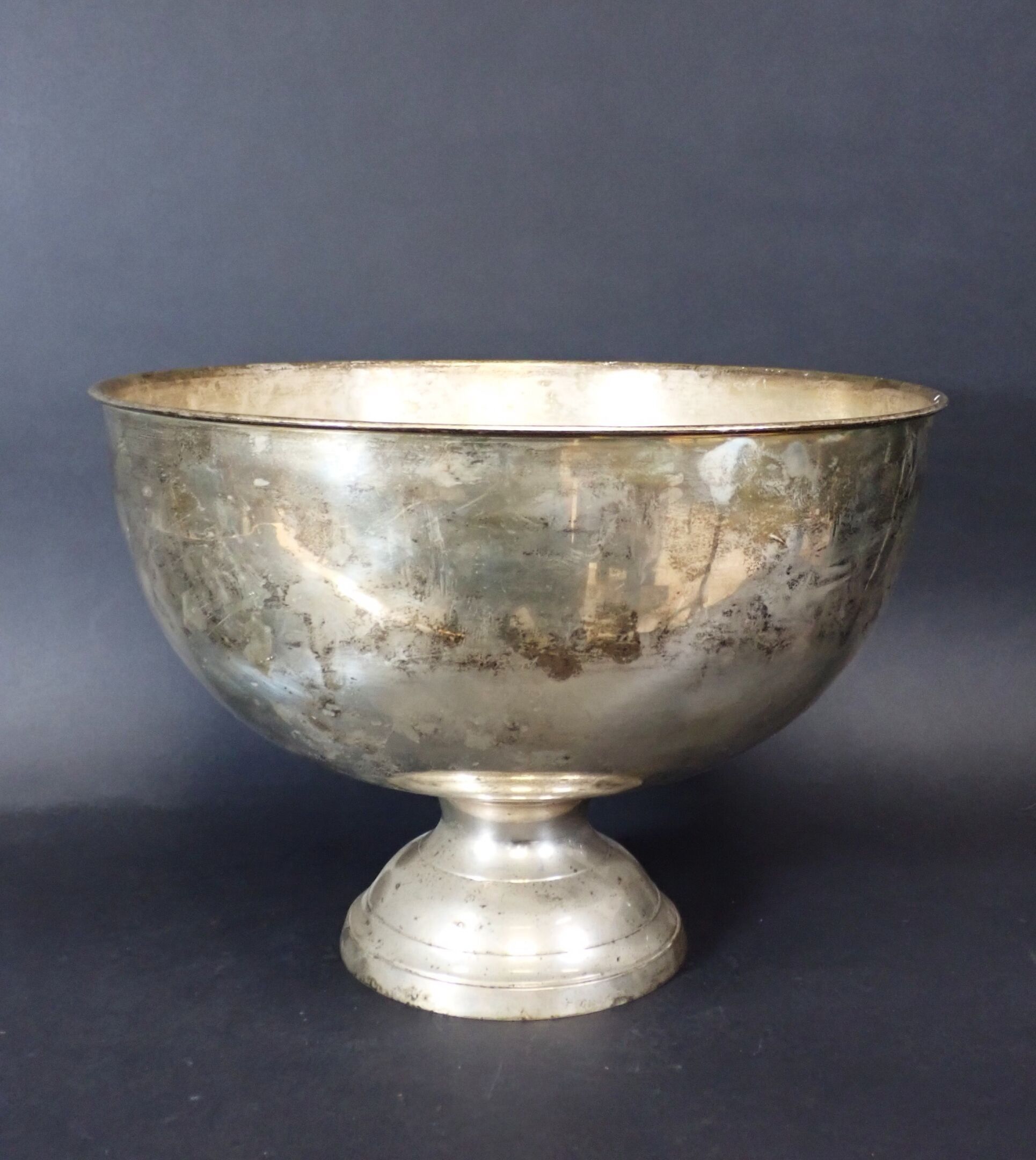 Large silver-plated metal basin on pedestal. Height: 30 cm - diameter: 43 cm (wear)