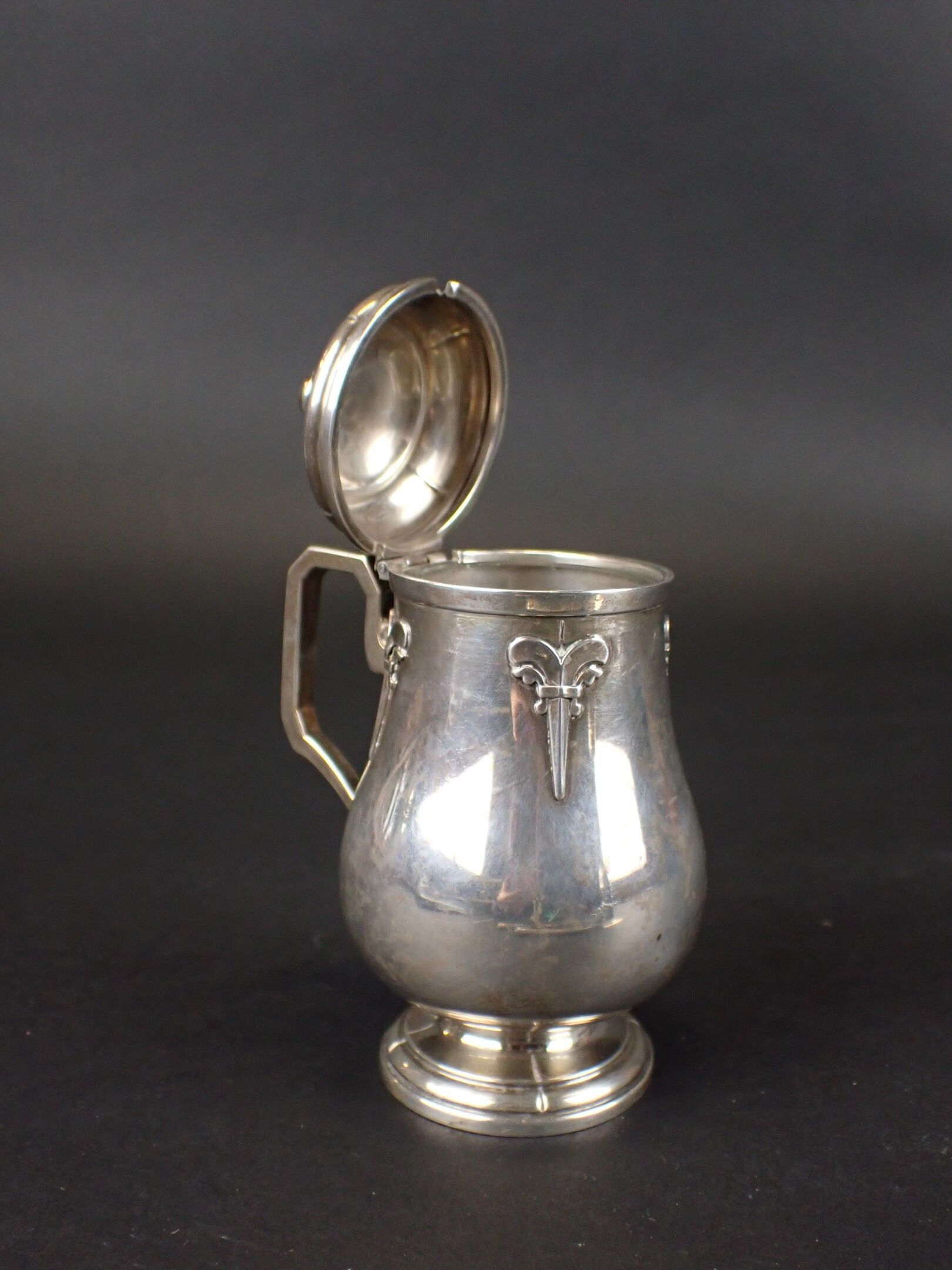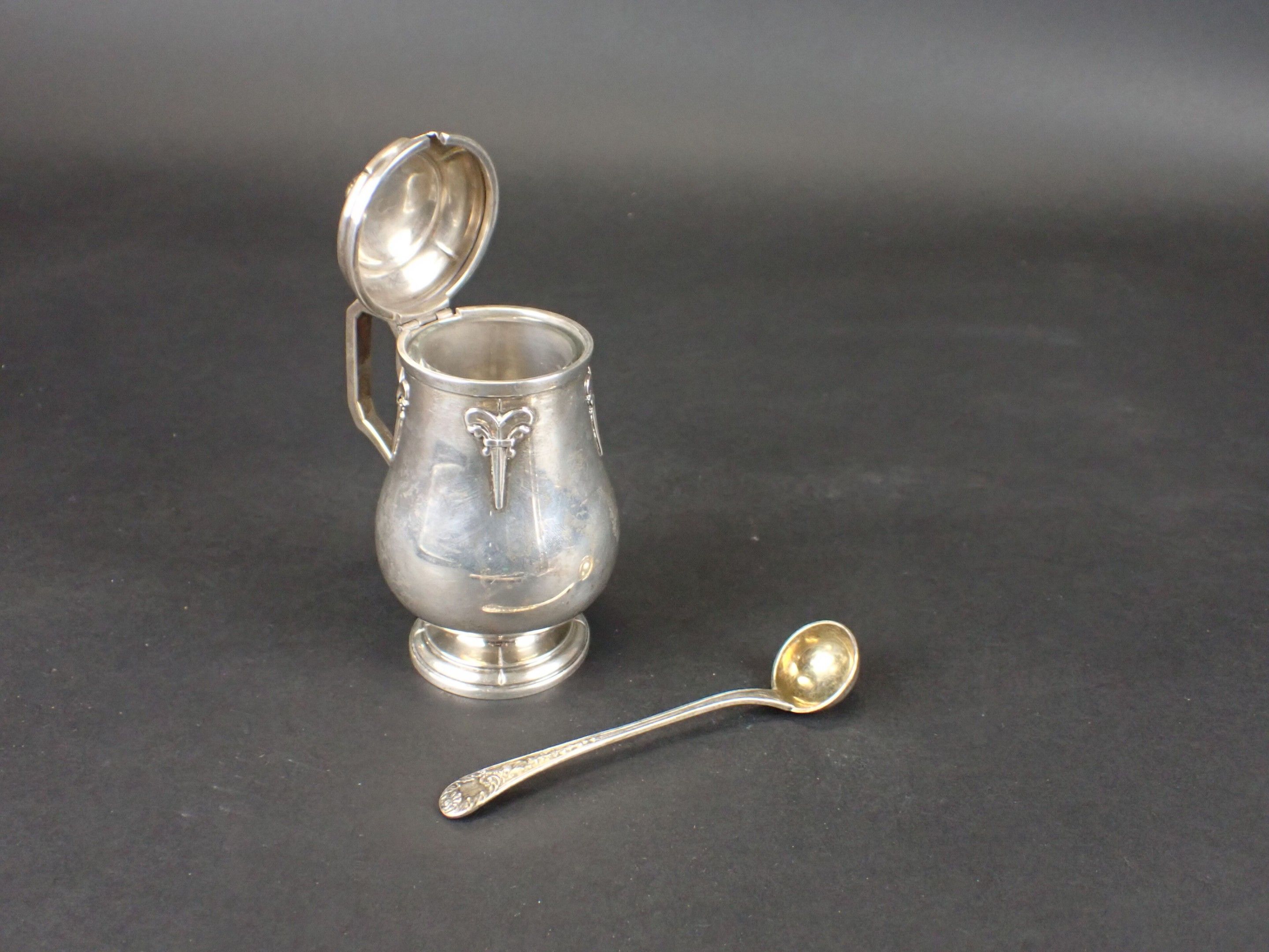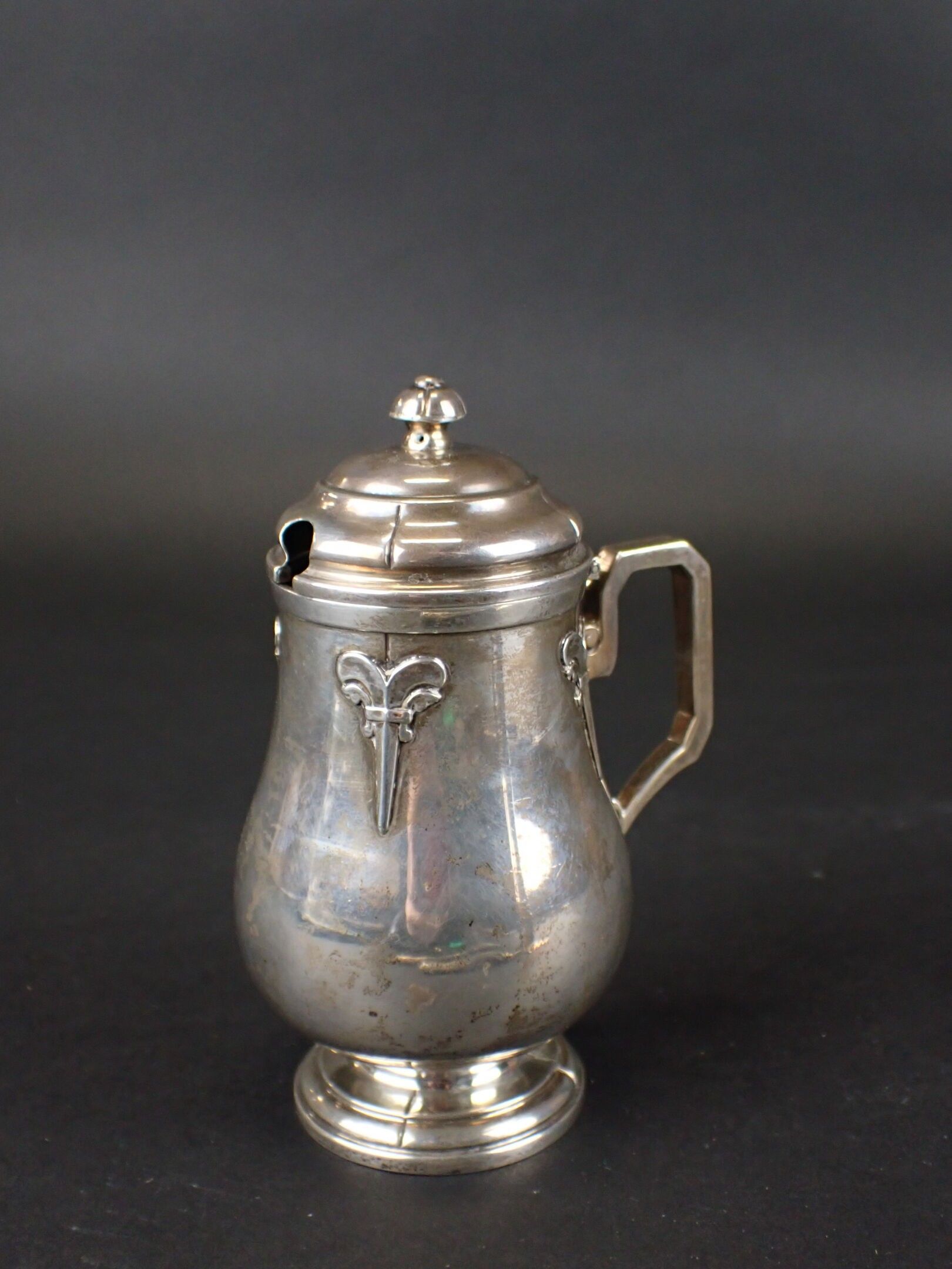 - A mustard pot on a pedestal, with handles, with floral decoration