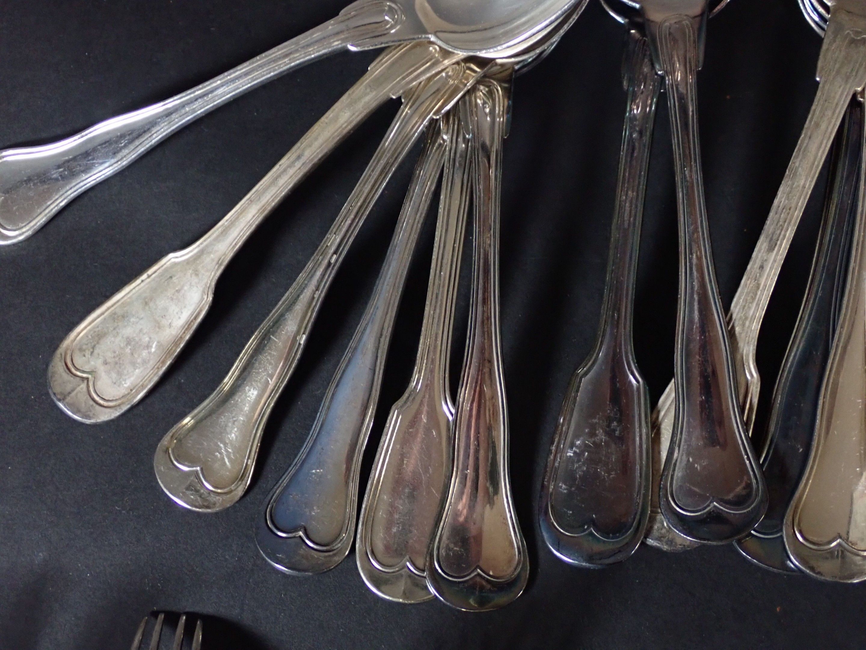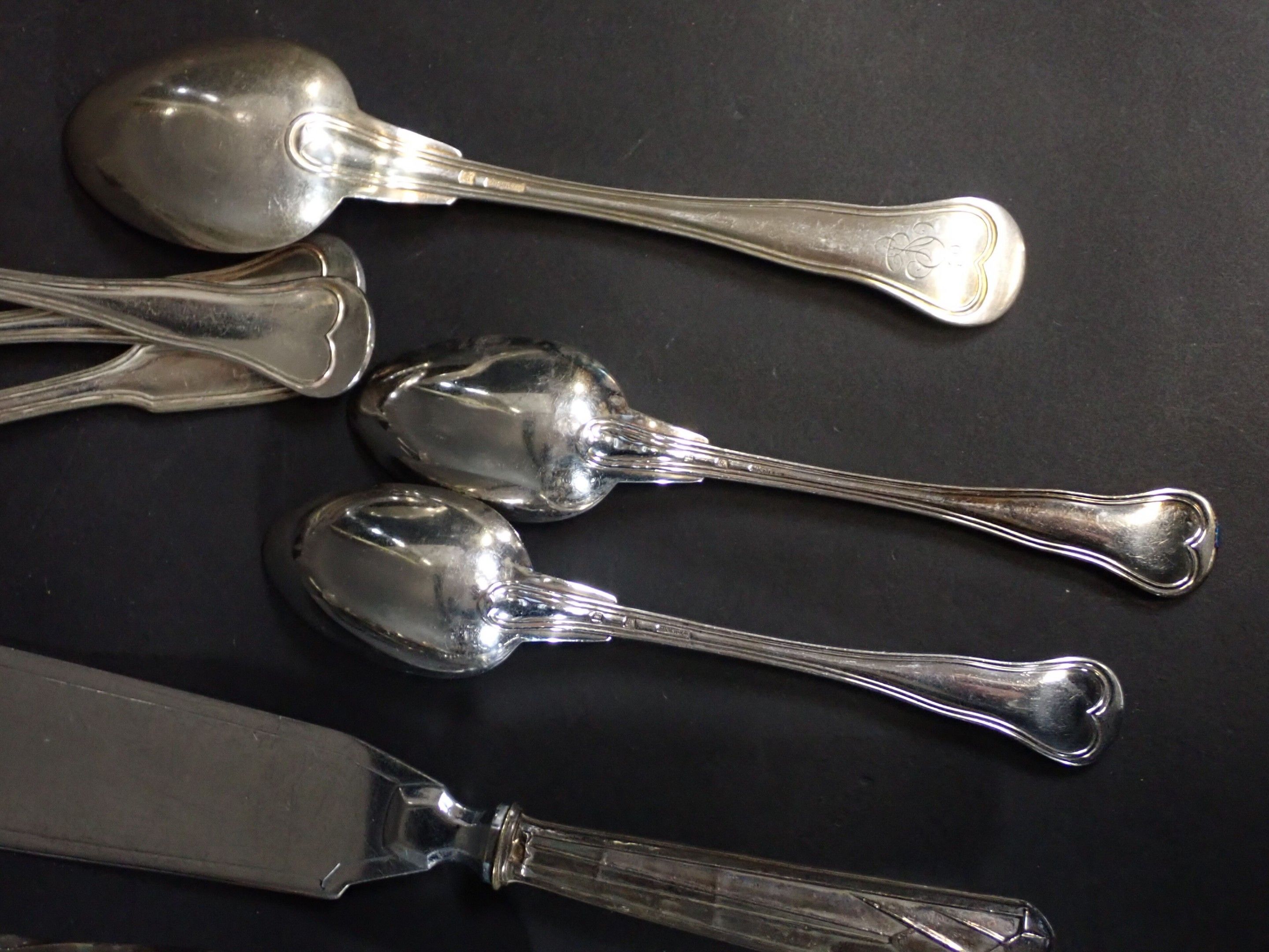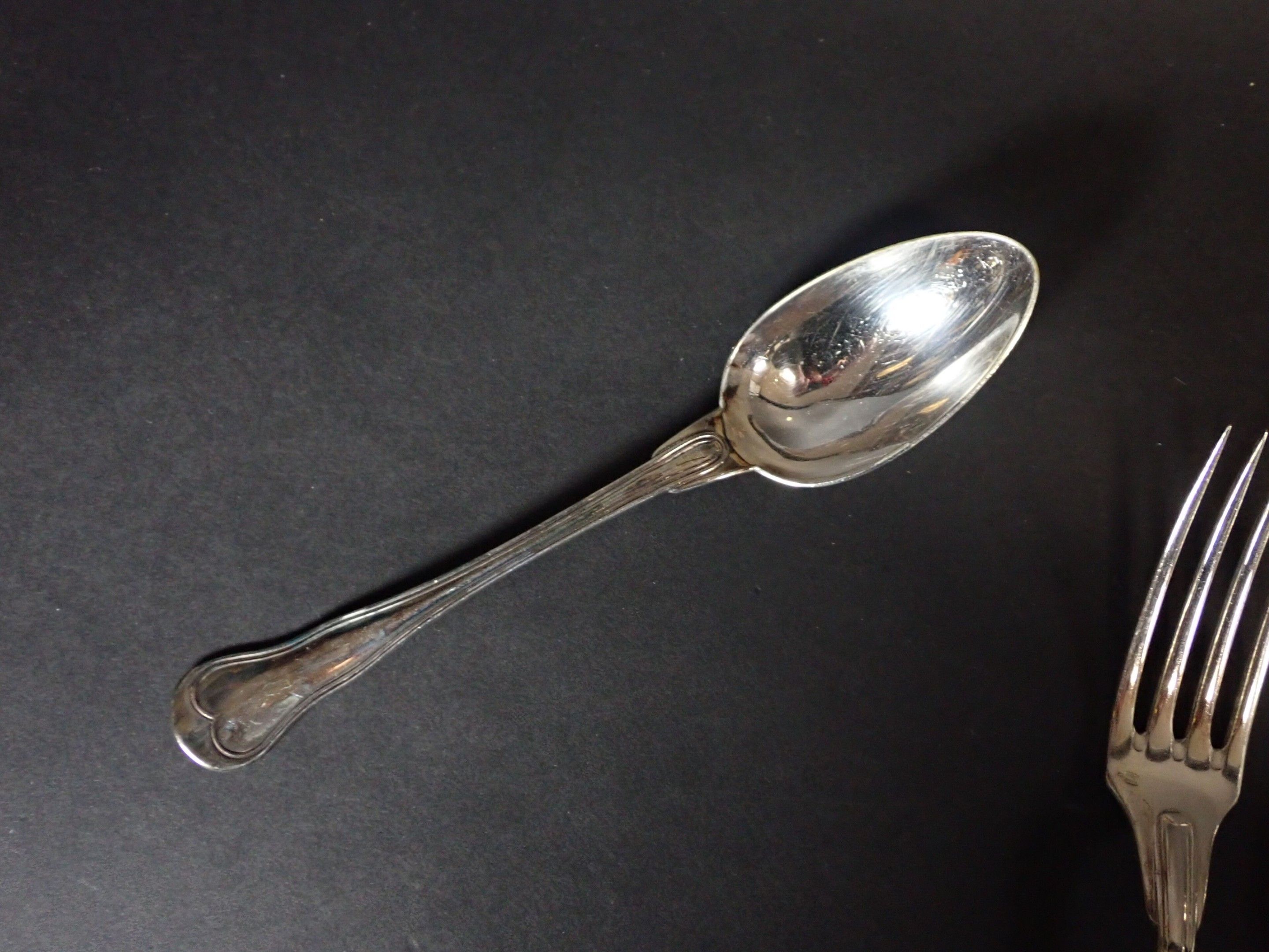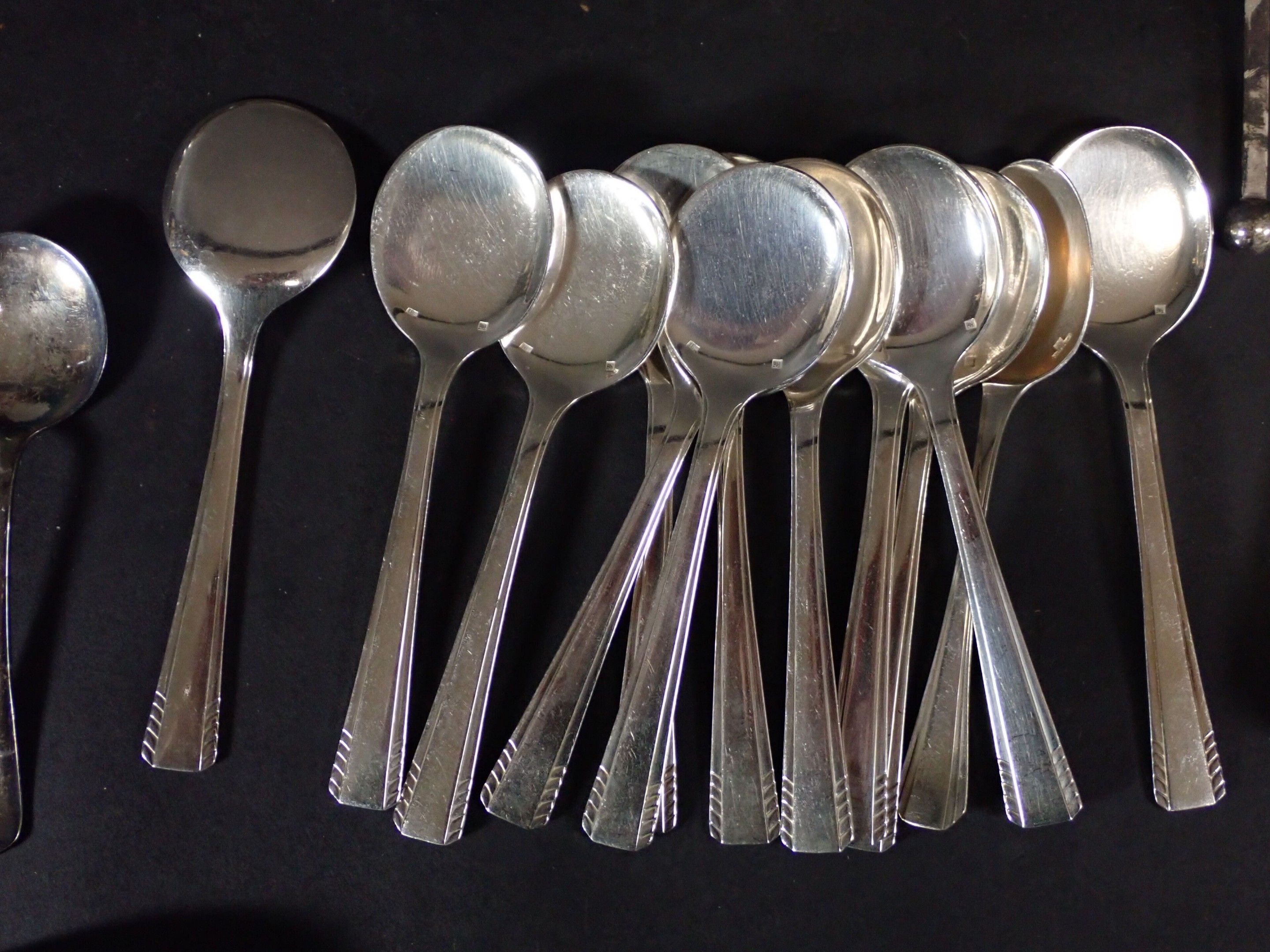 Various models with contour purfling, including numerous soup spoons, ice-cream spoons, forks, fish knives, etc. Total weight: 3580 g of metal