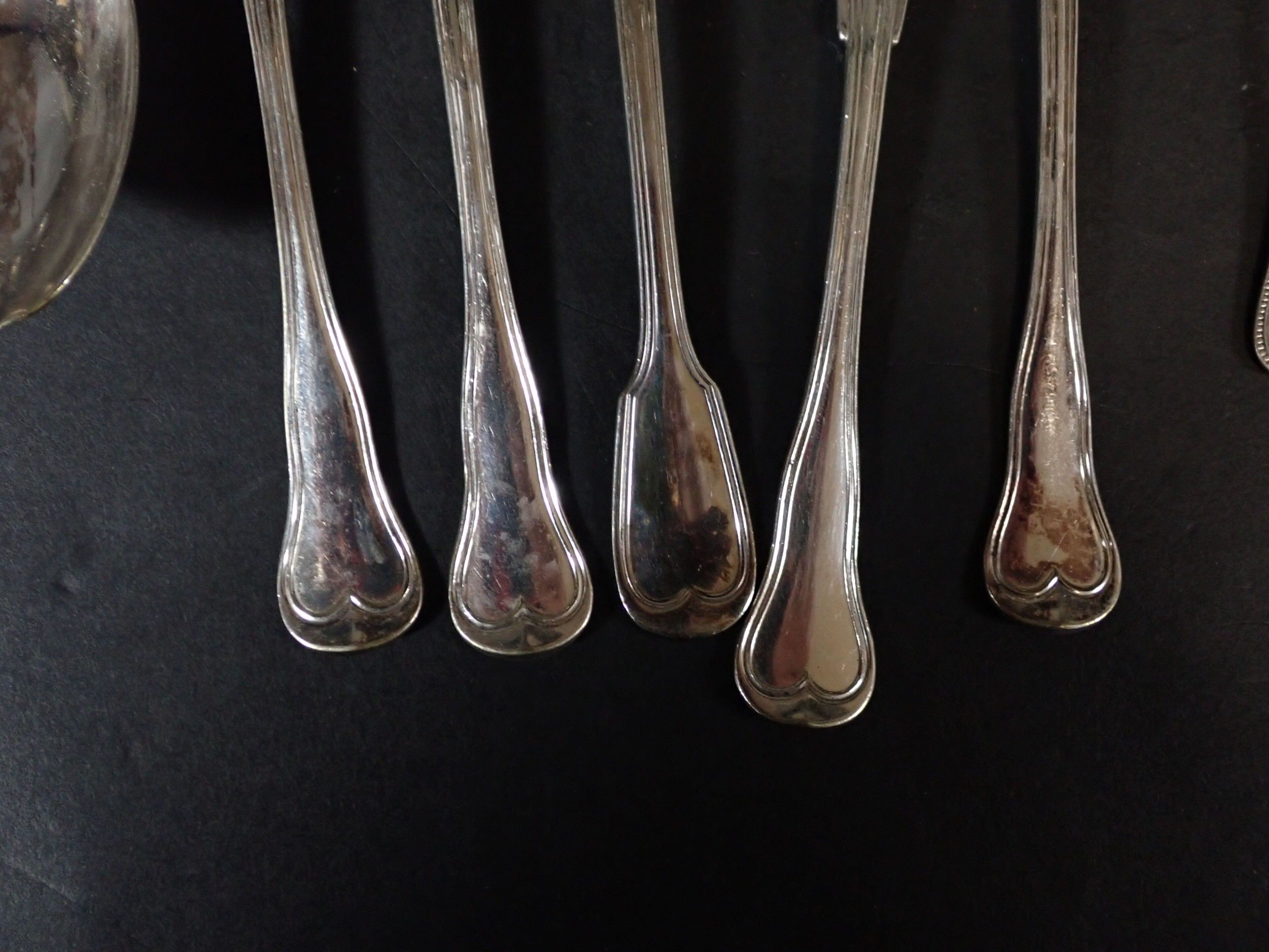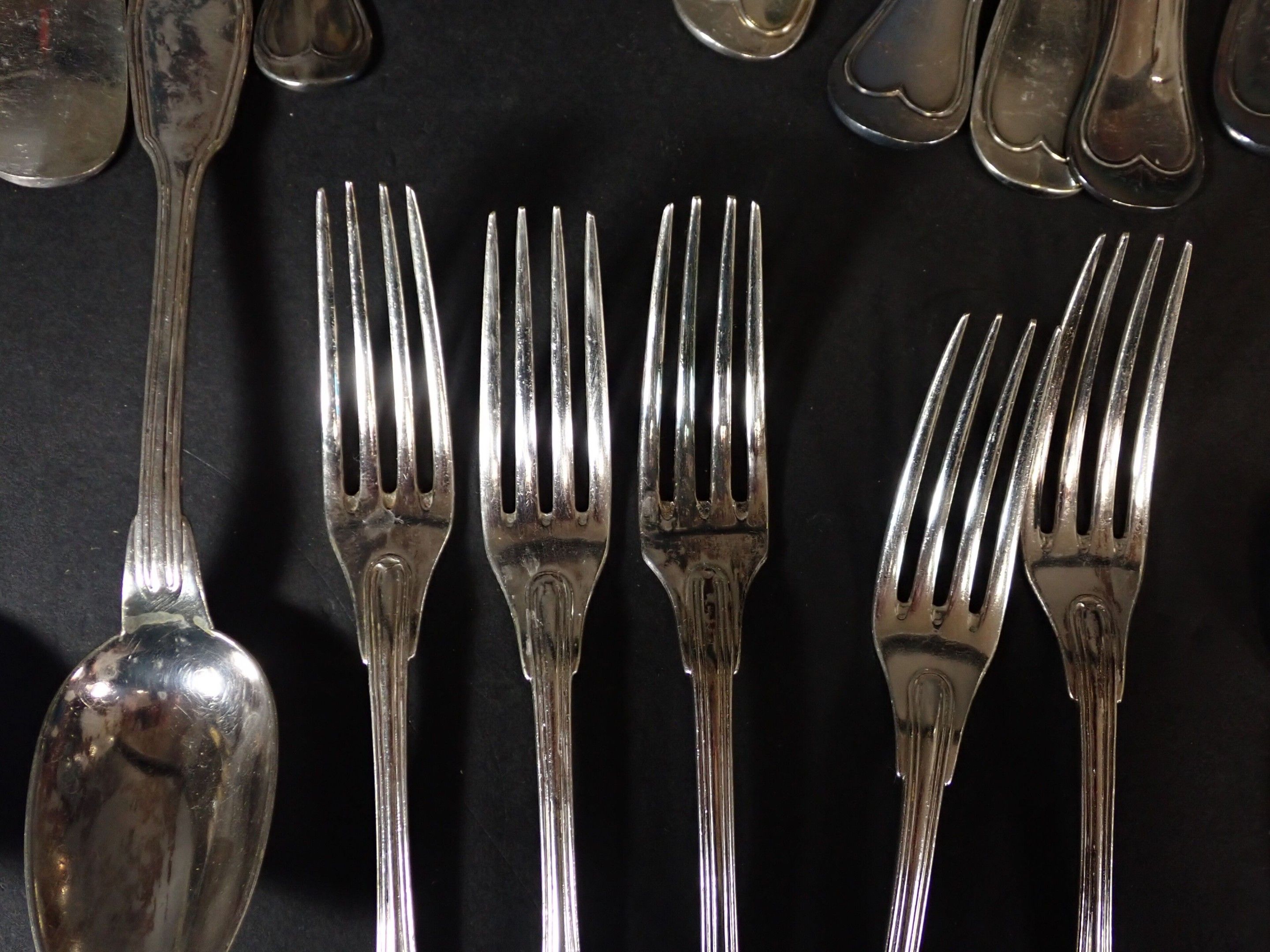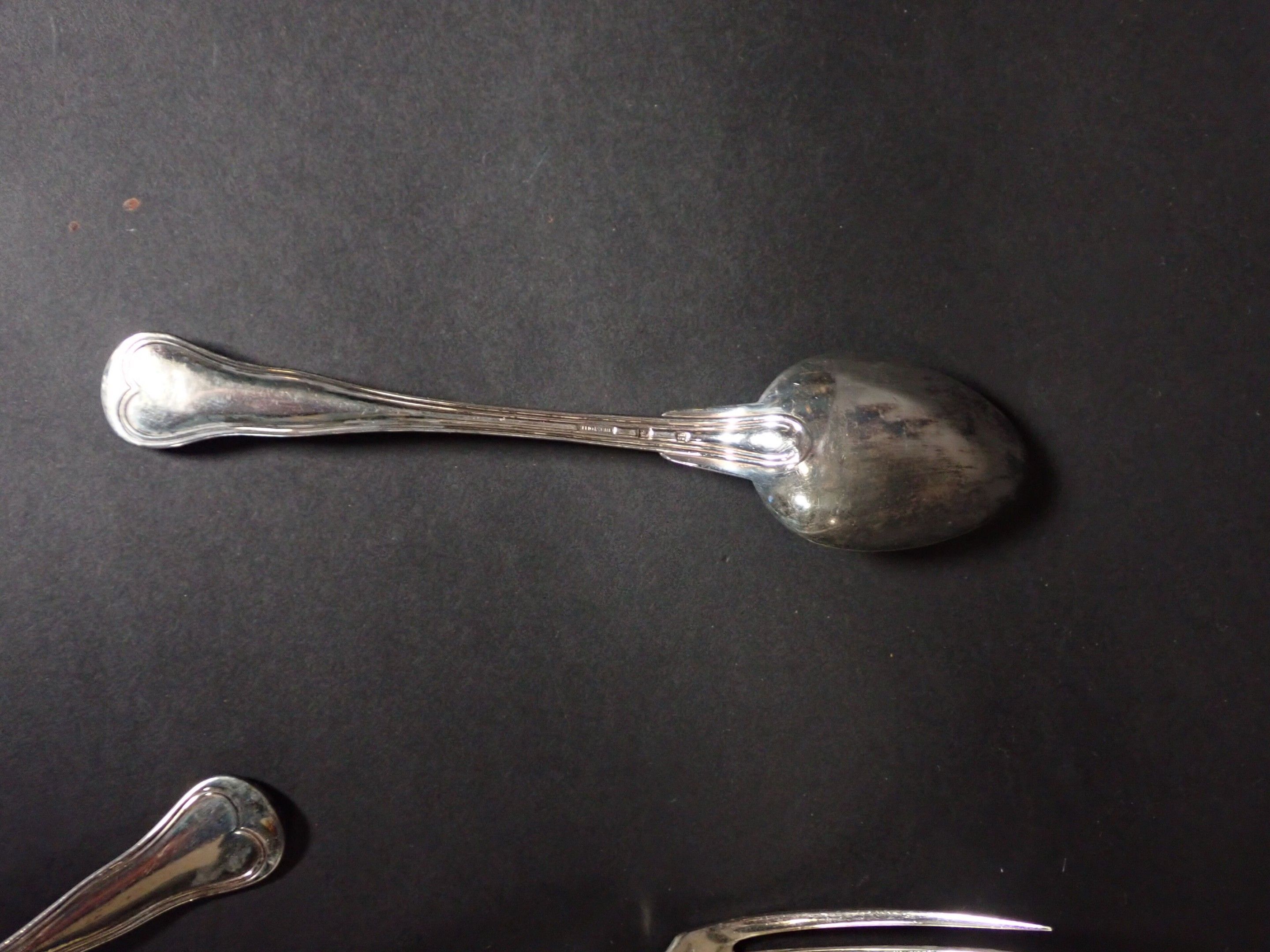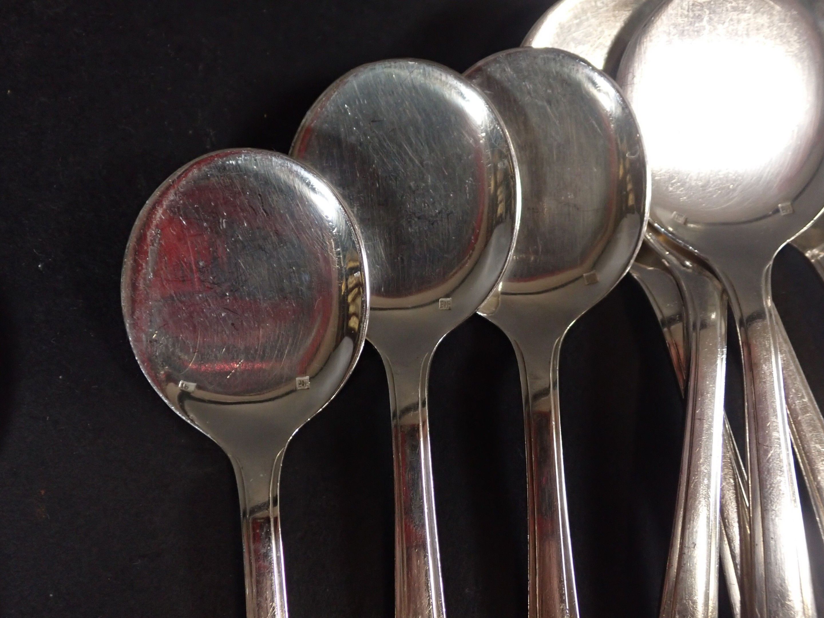Various models with contour purfling, including numerous soup spoons, ice-cream spoons, forks, fish knives, etc. Total weight: 3580 g of metal