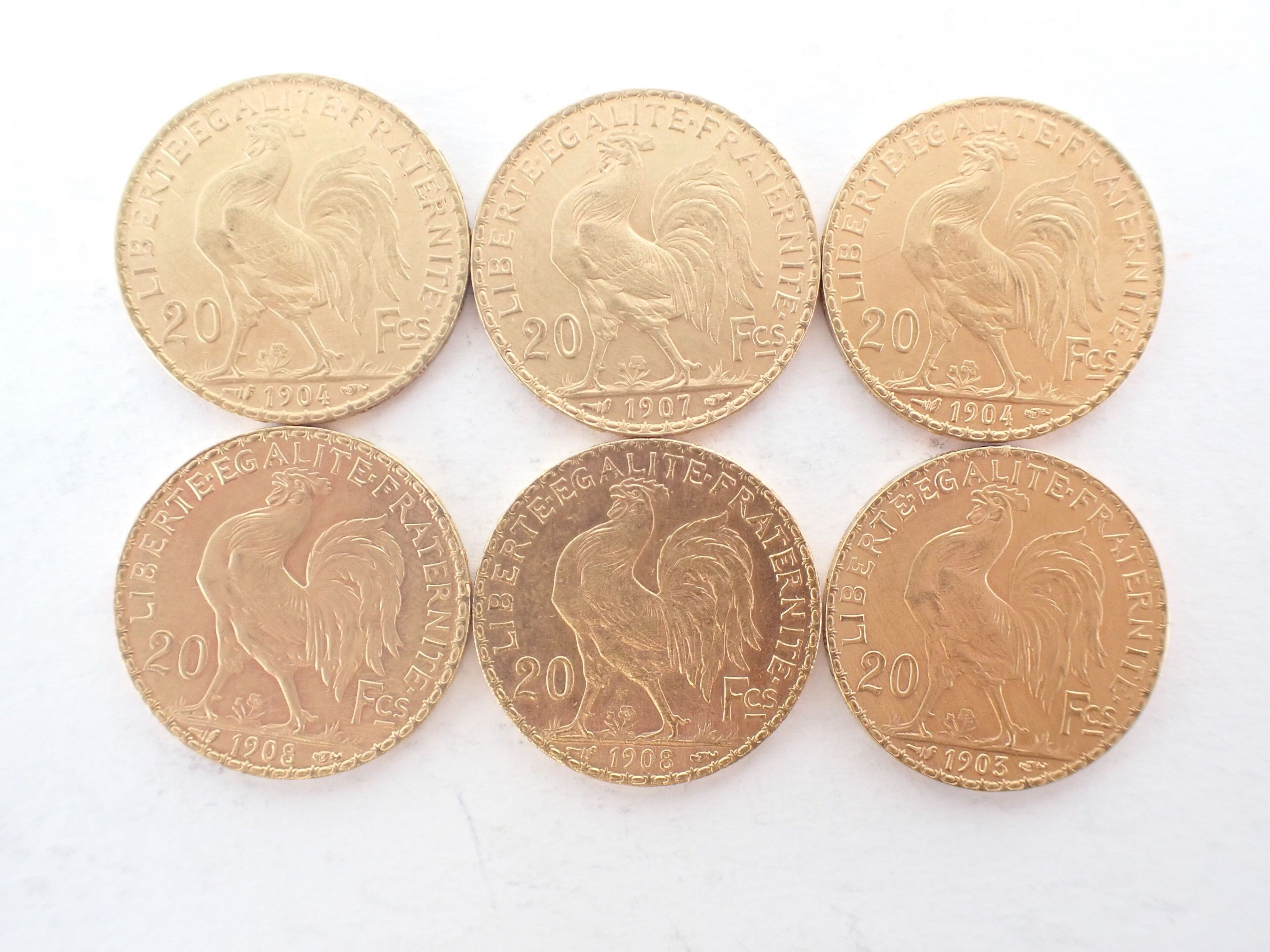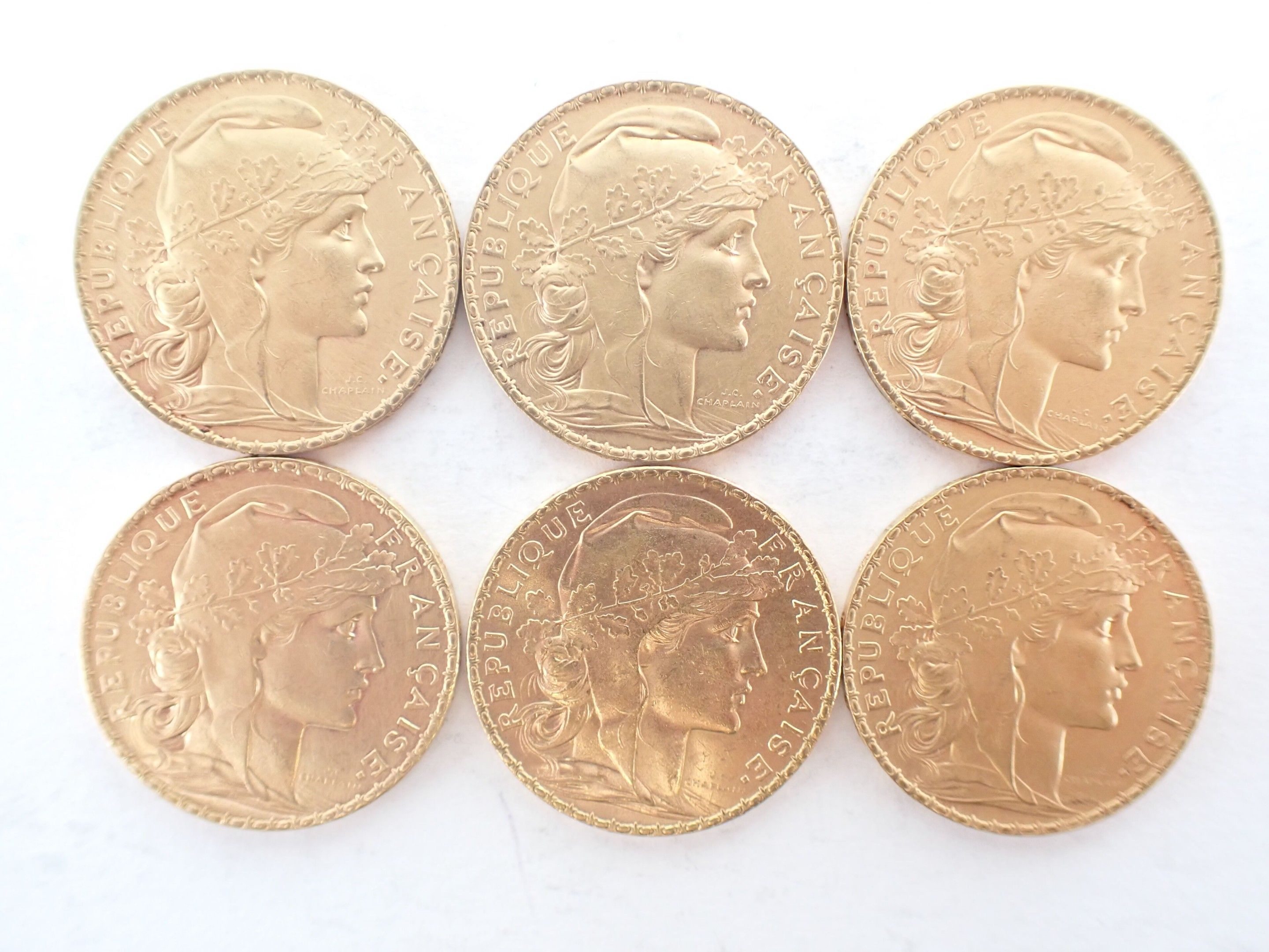 6 coins of 20 francs gold Marianne type Coq - Weight : 38,7 g