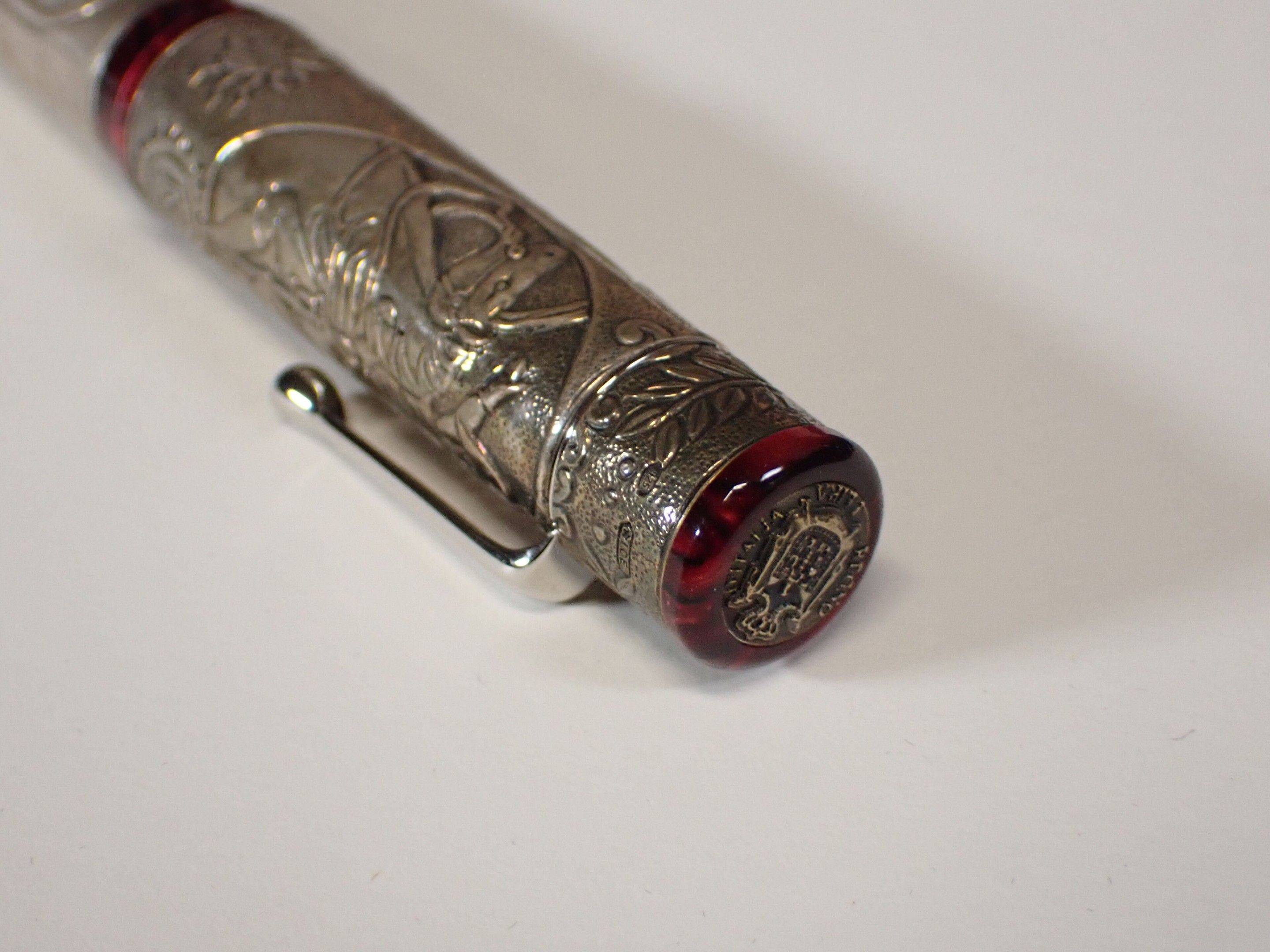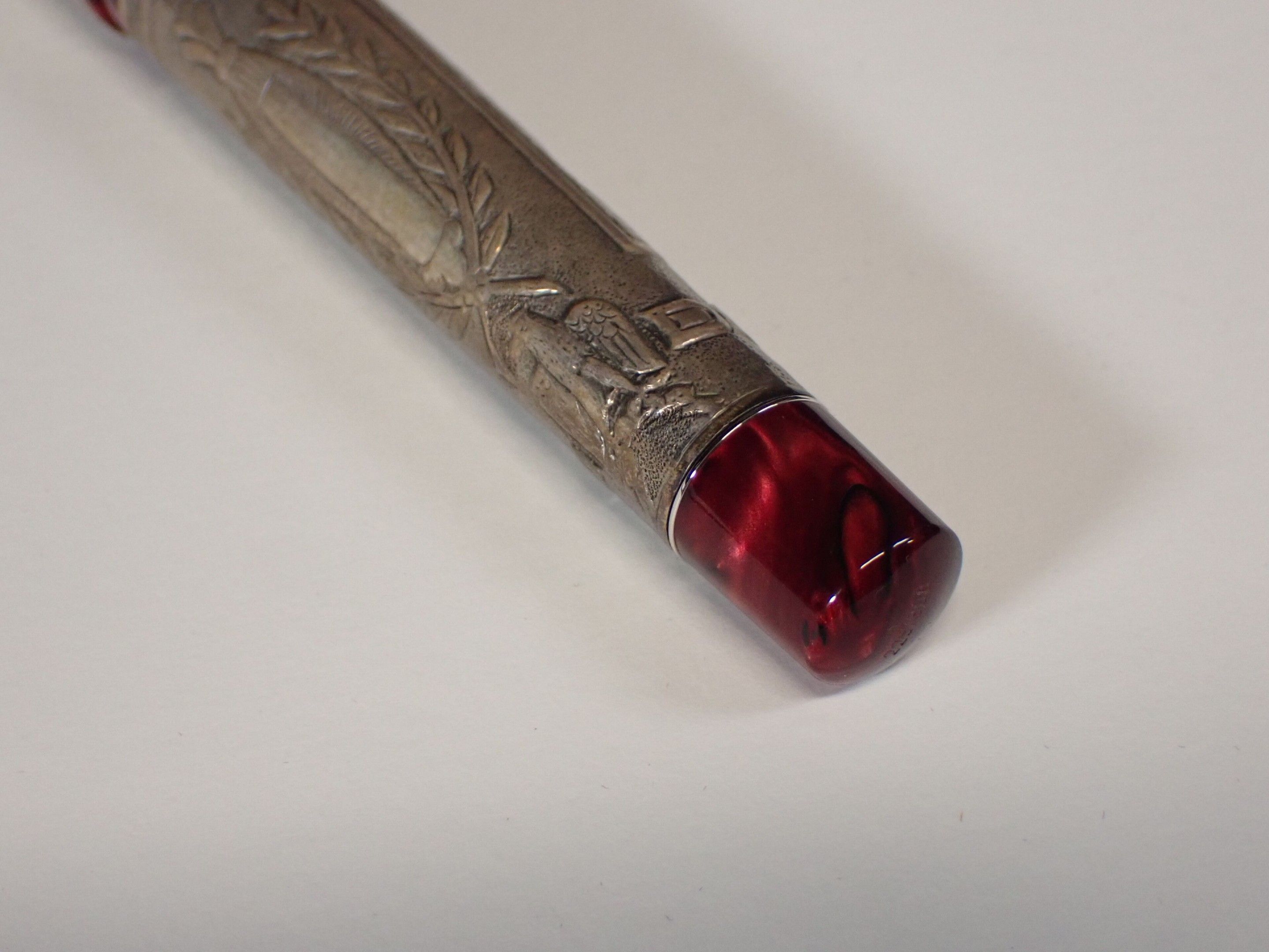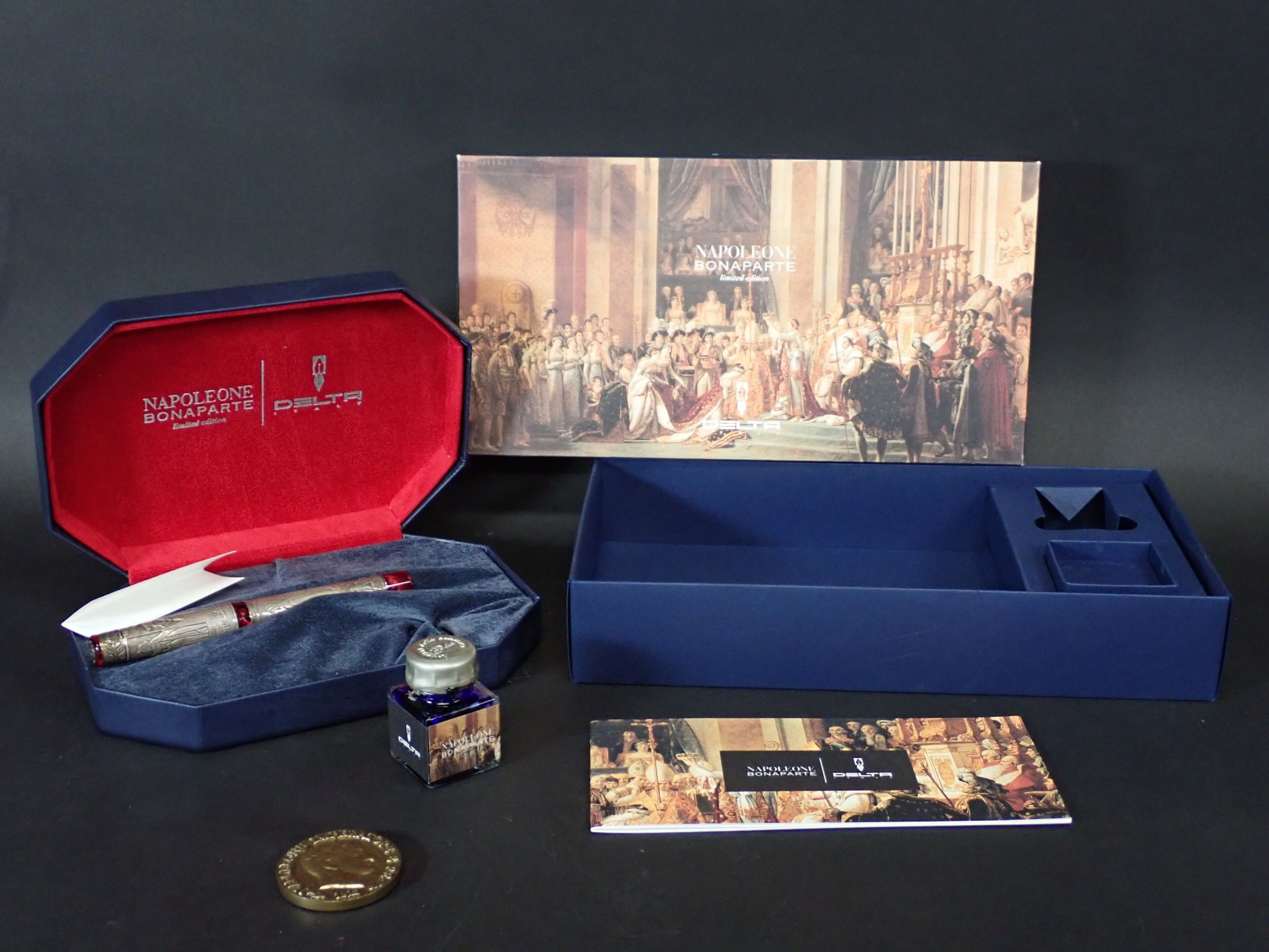 DELTA Italy - "Napoleone Bonaparte" biros in 750 gold, limited edition of 808 in red resin and 925 thousandths sterling silver setting decorated with the coronation of Napoleon and a battle scene. Gross weight: 68g, in box, with inkwell, bronze medal, booklet, numbered 225/808. Good condition