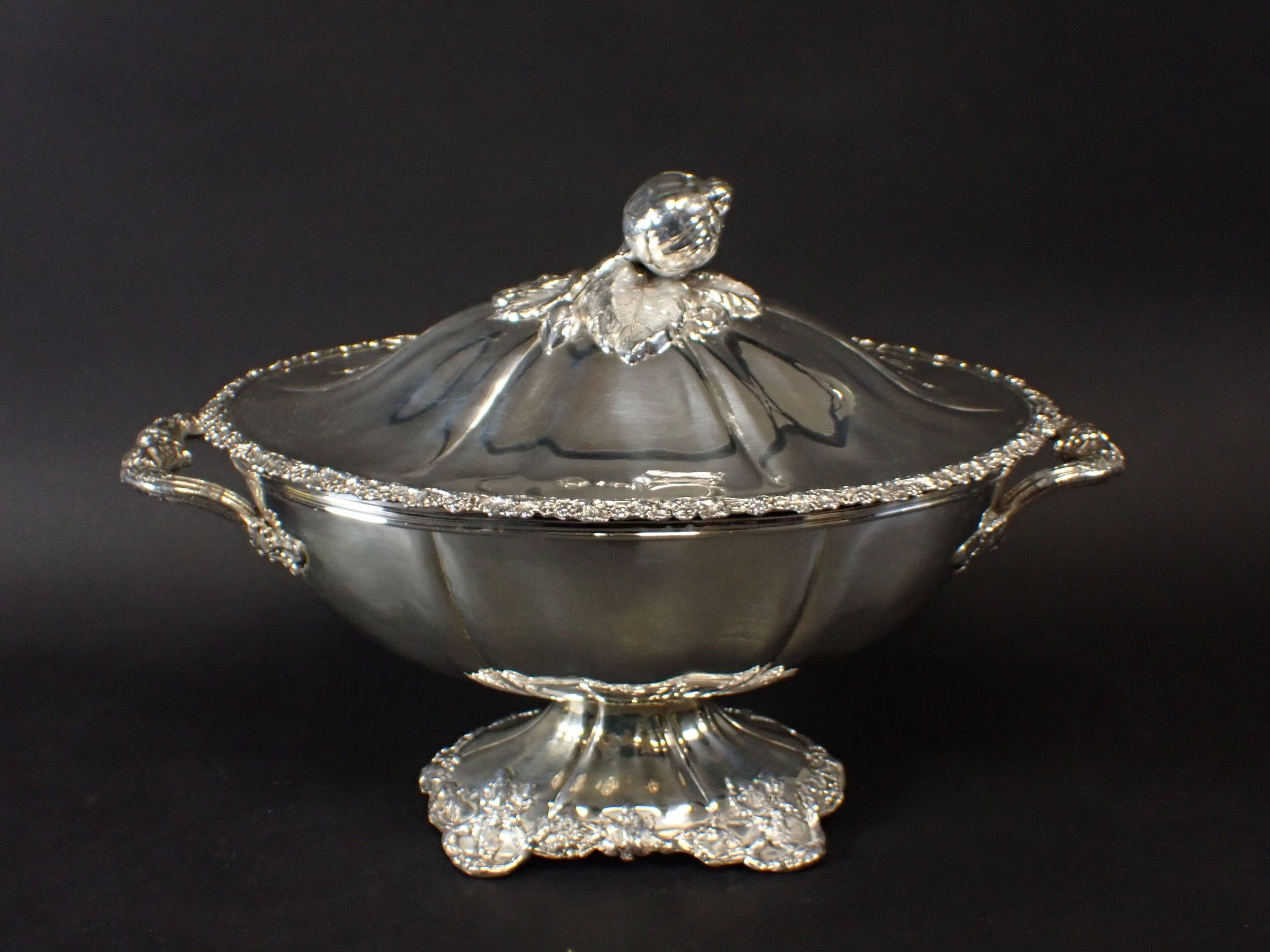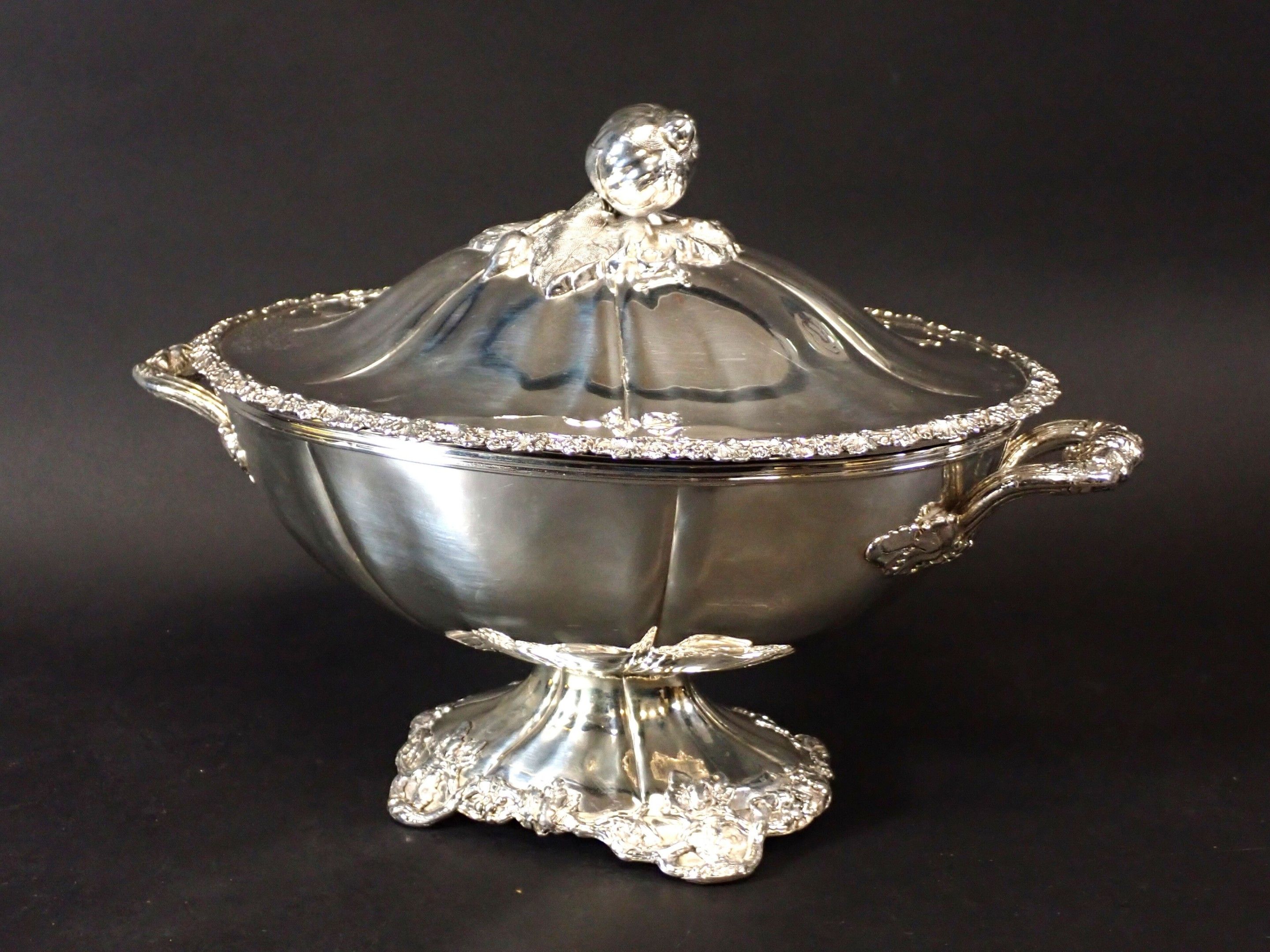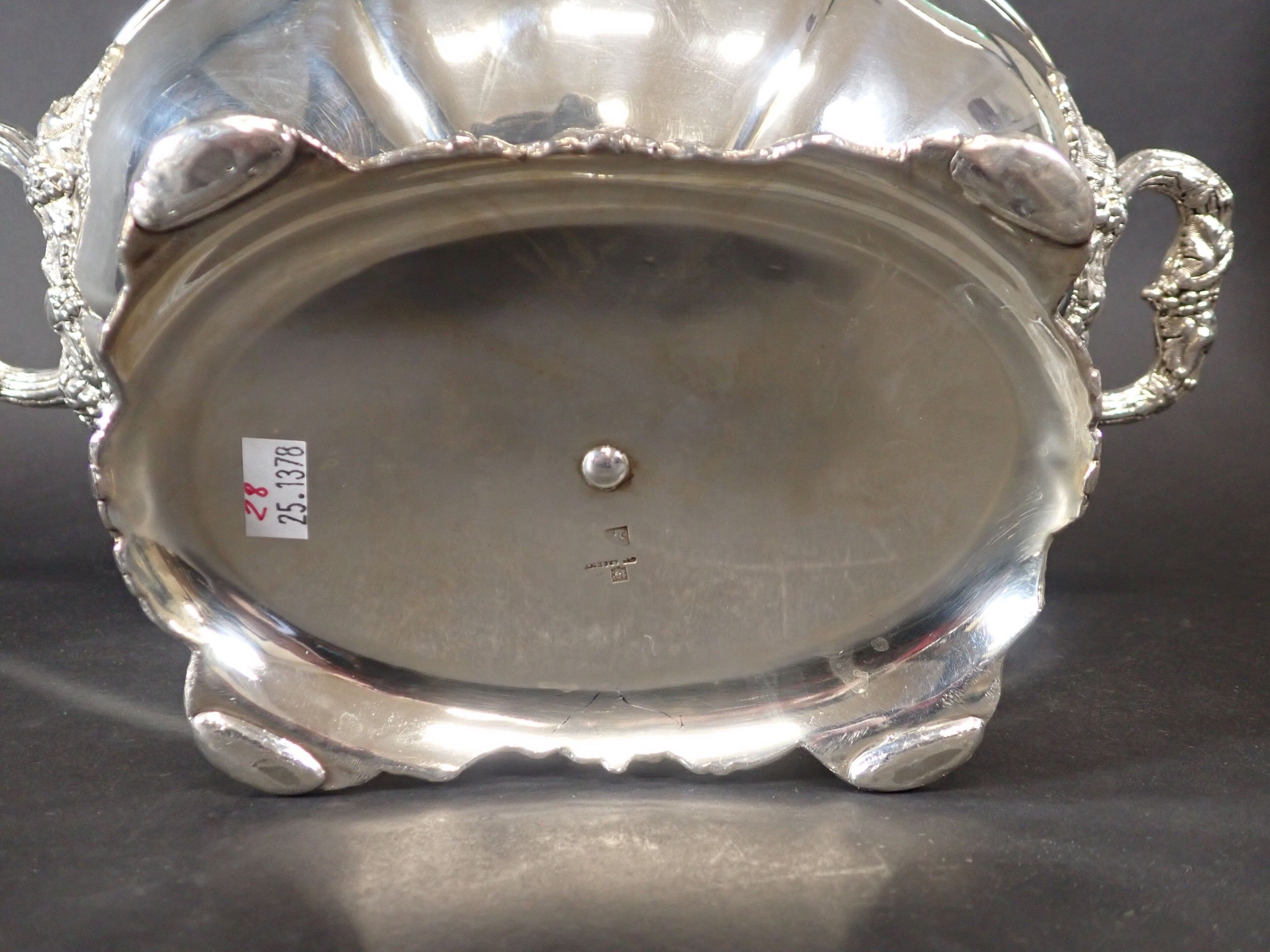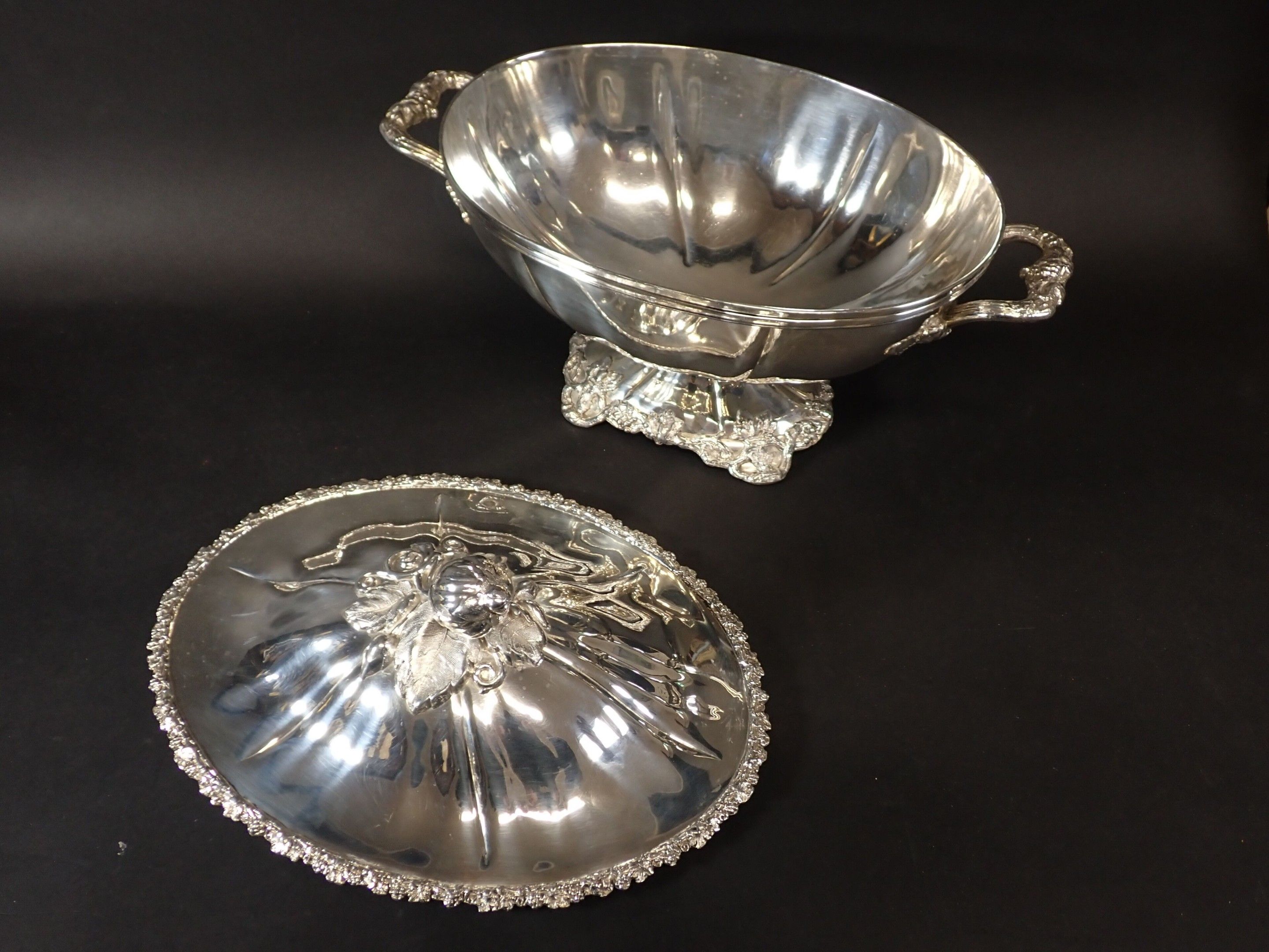 Beautiful covered tureen in silver-plated metal, lid with fruit and foliage handles, two side handles with floral handles, base decorated with vine branches. Height: 28 cm - length: 40 cm