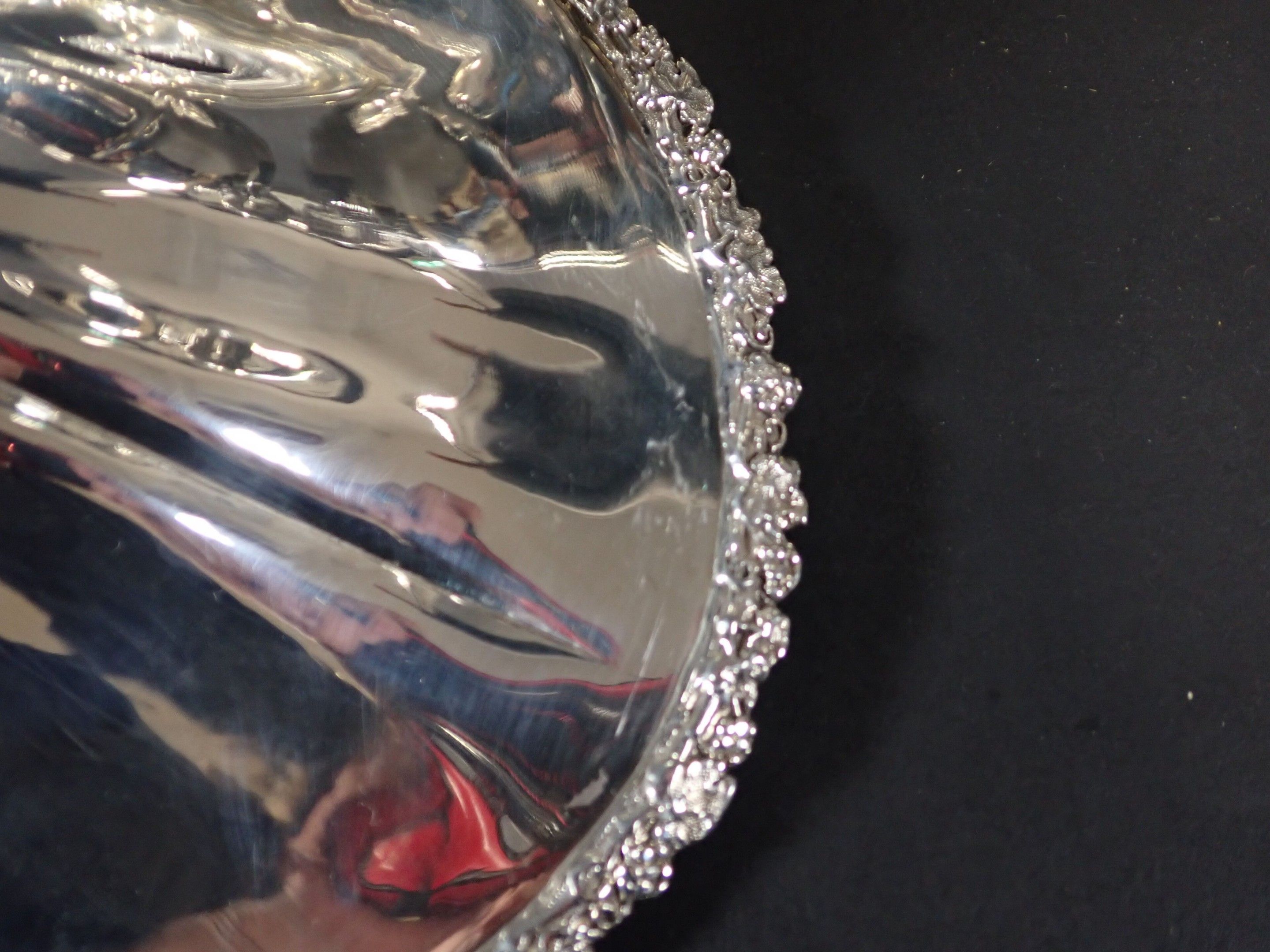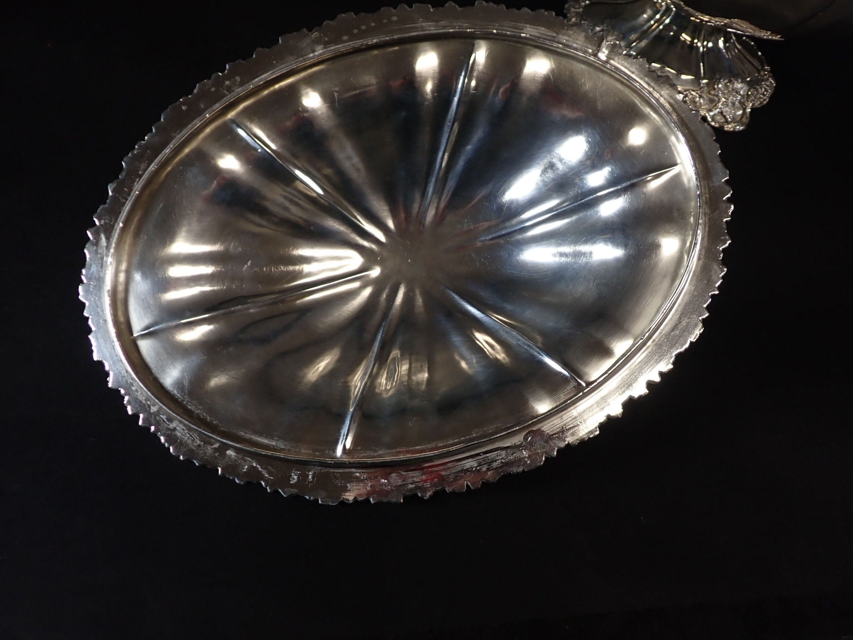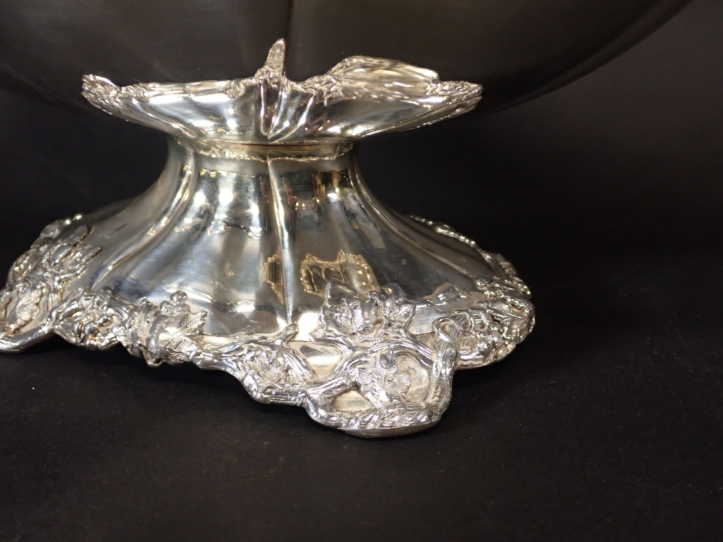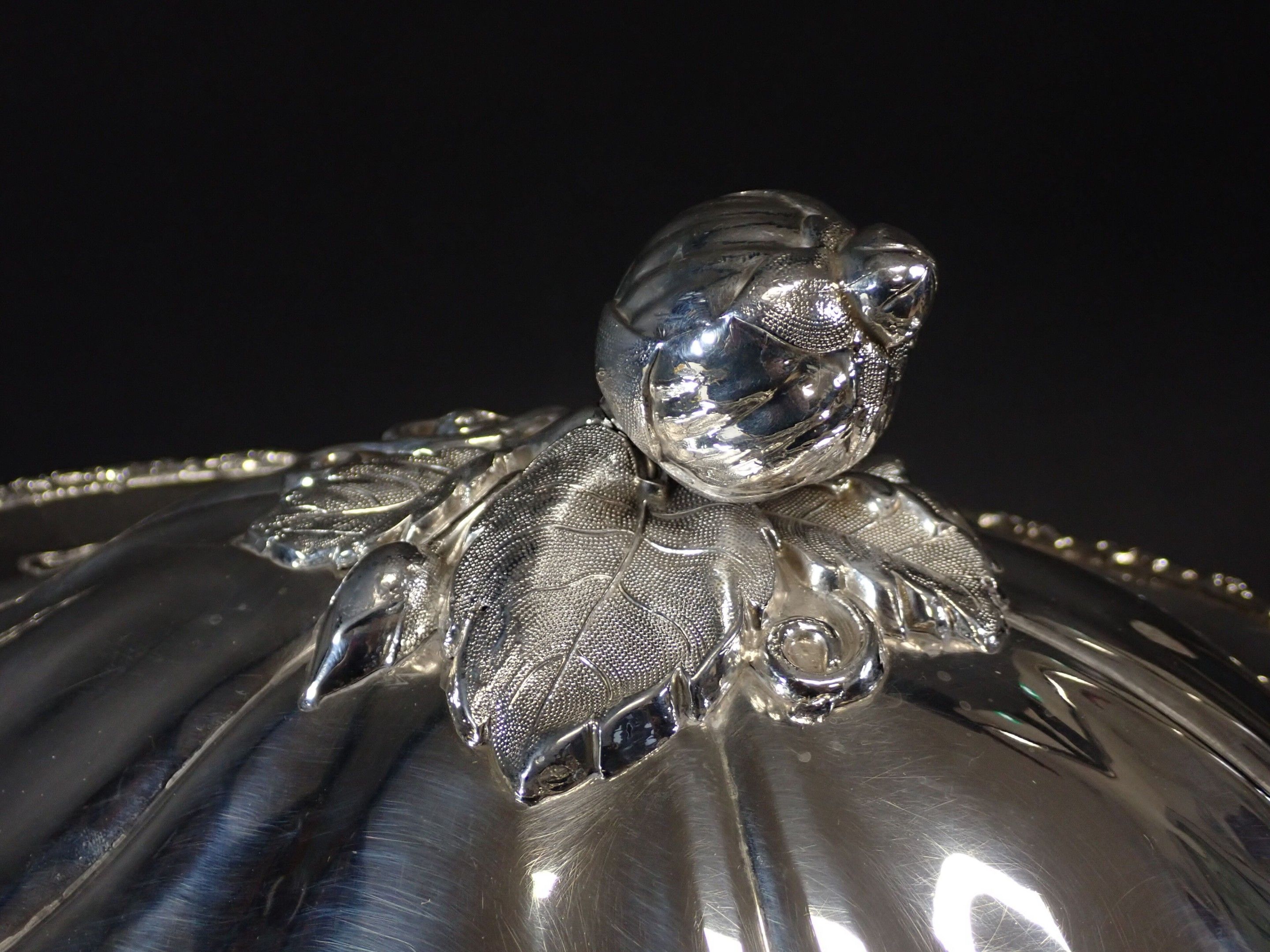 Beautiful covered tureen in silver-plated metal, lid with fruit and foliage handles, two side handles with floral handles, base decorated with vine branches. Height: 28 cm - length: 40 cm